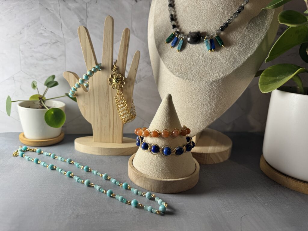 Amazonite bracelet, necklace, sunstone bracelet, lapis bracelet, Robin’s necklace, and Prehnite bracelet.