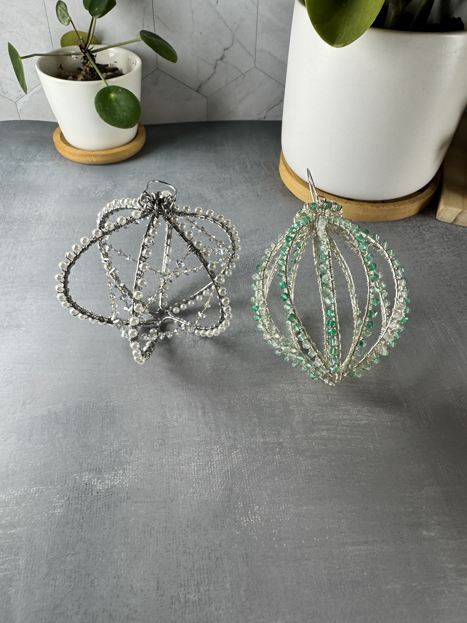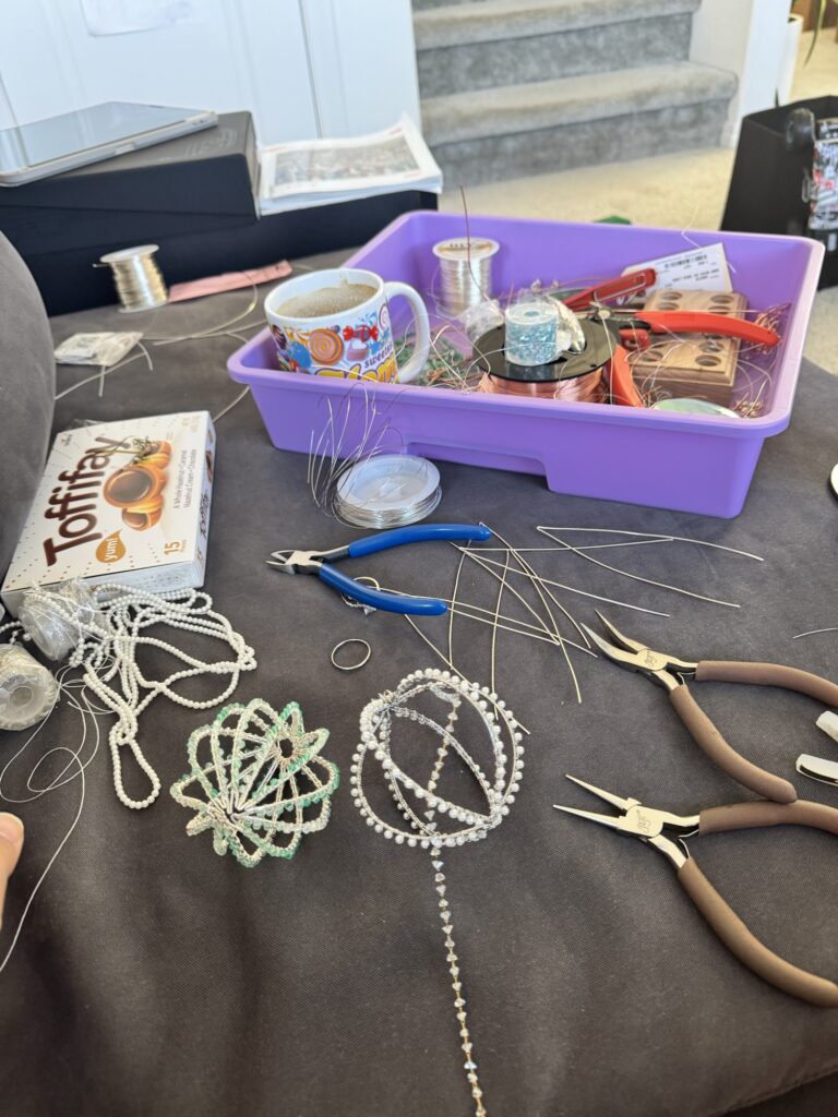 The result of this mission was stainless steel ornaments with crystal pearls and glass beads strung on the inside. It came out gorgeous, but I don’t think I’ll ever make another one of these again.