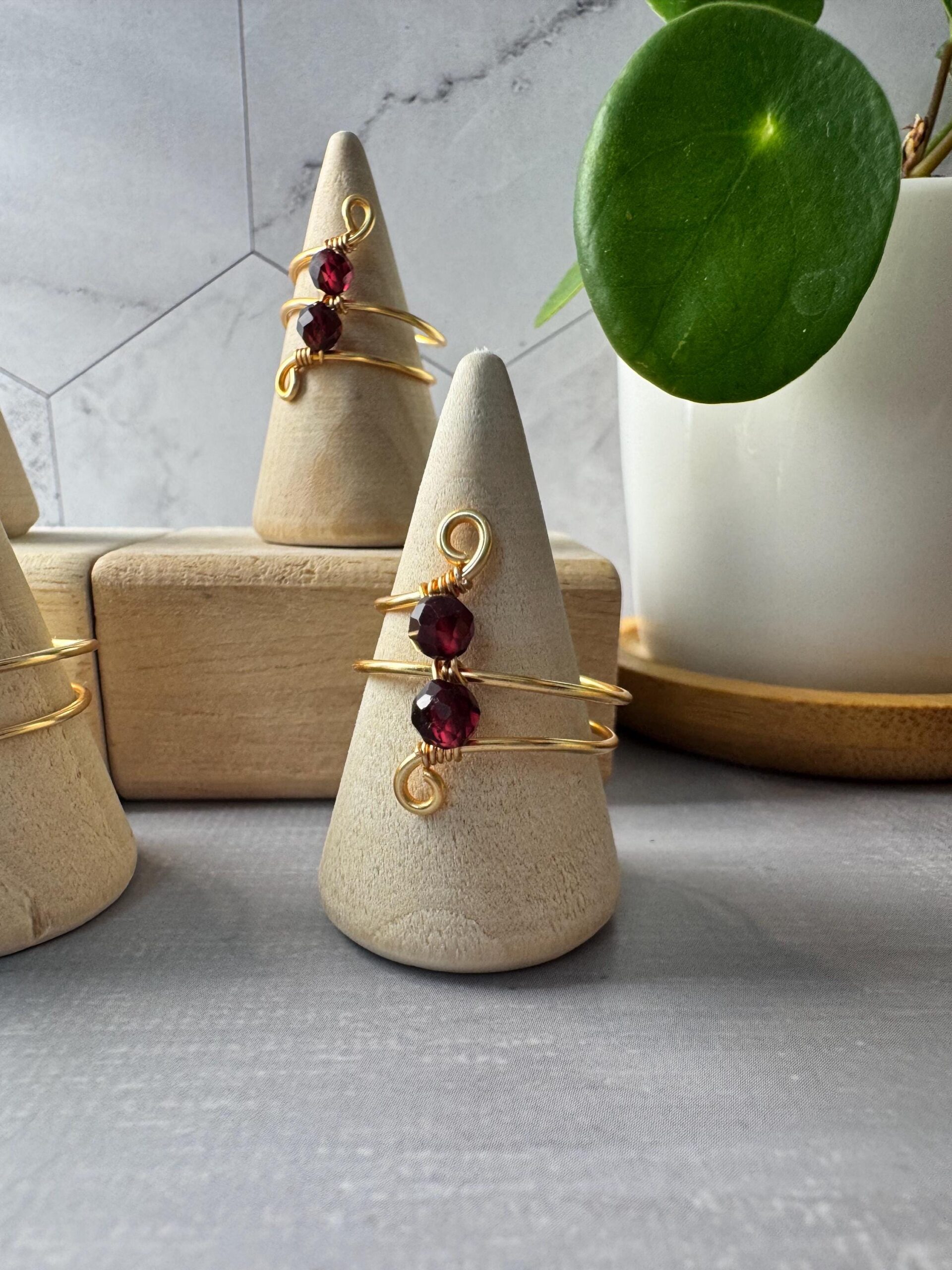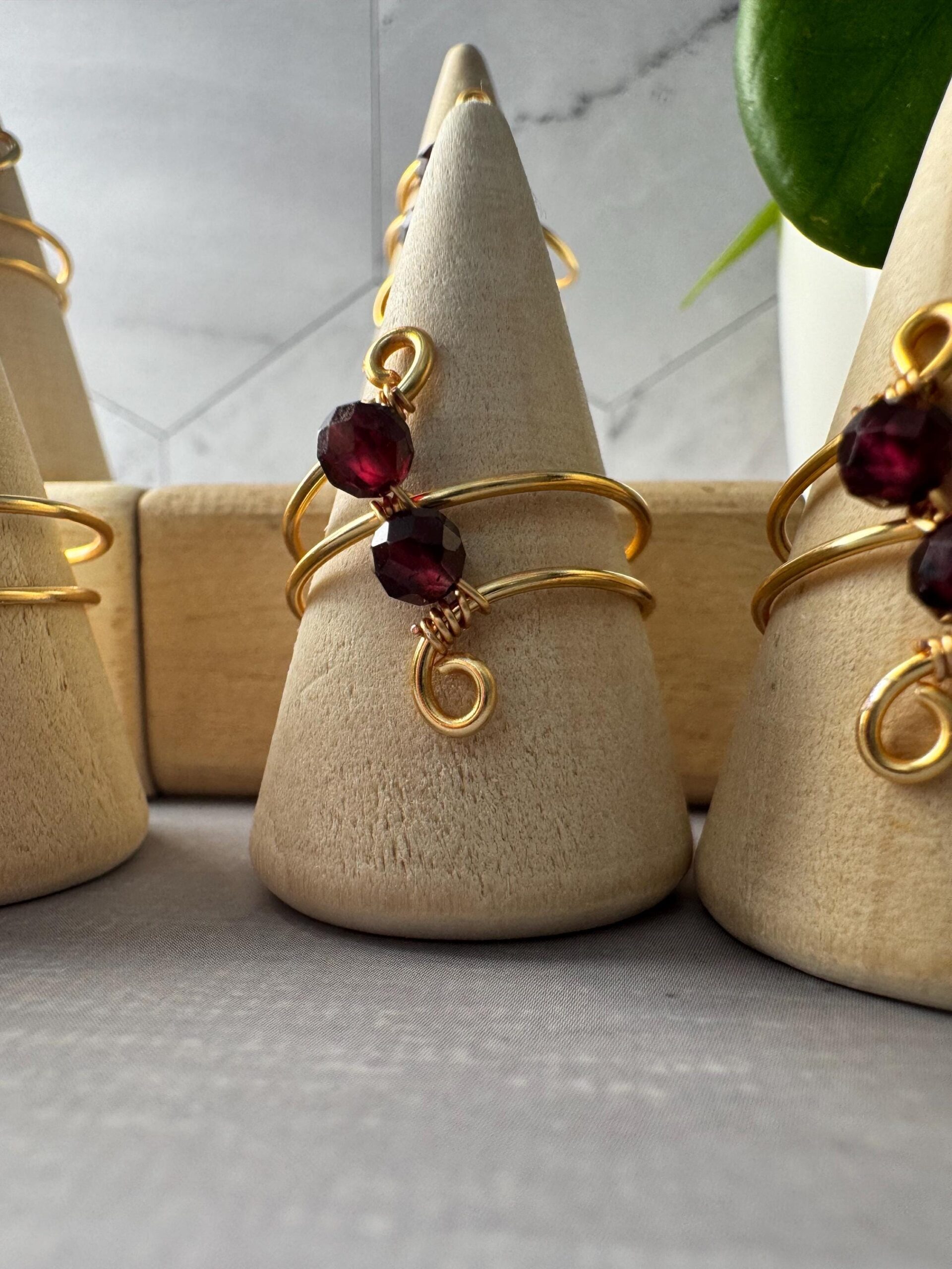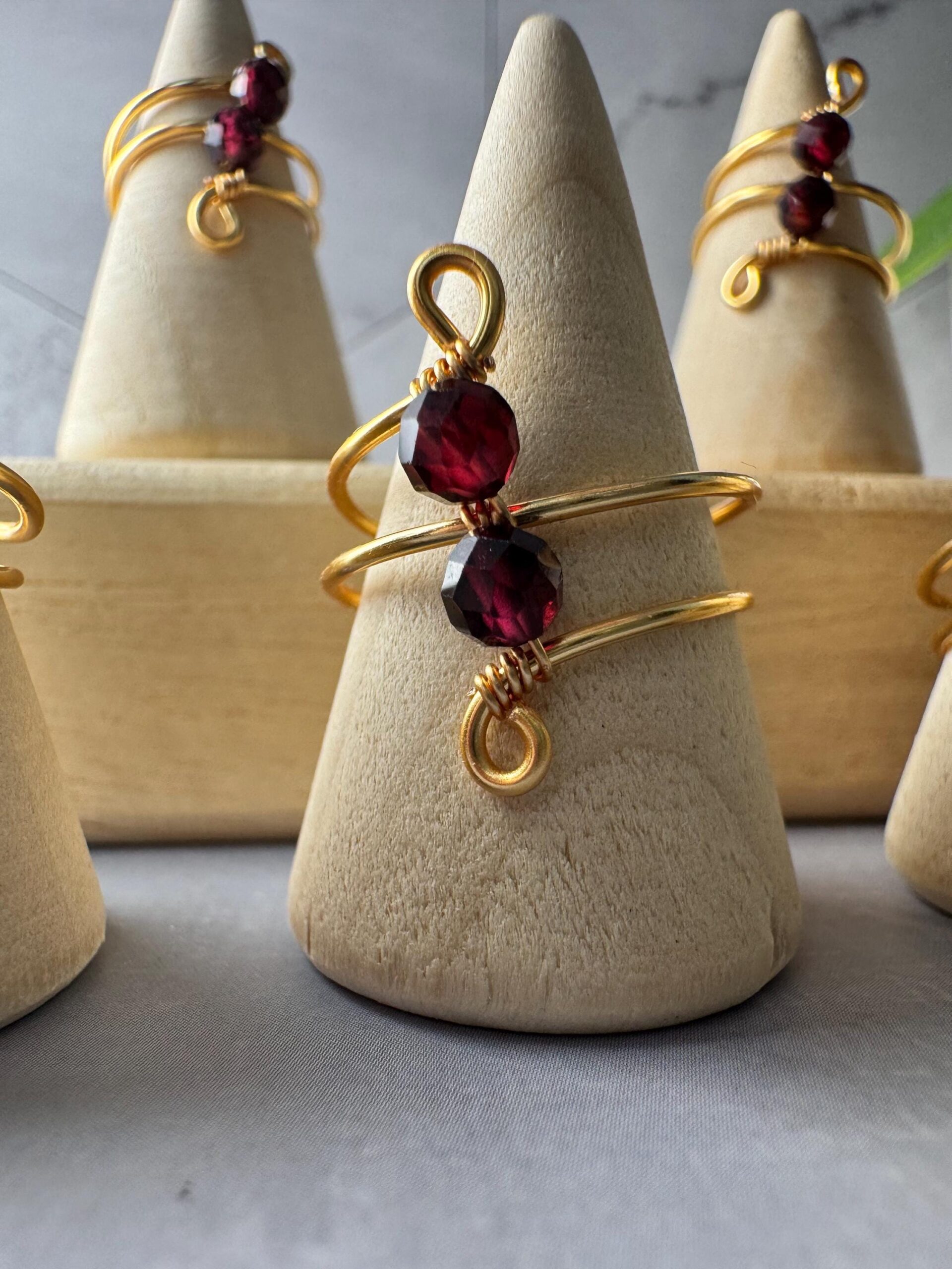 18K Gold Plated Spiral Wire-Wrapped Ring with Two Faceted Garnet Beads – Minimalist Jewelry