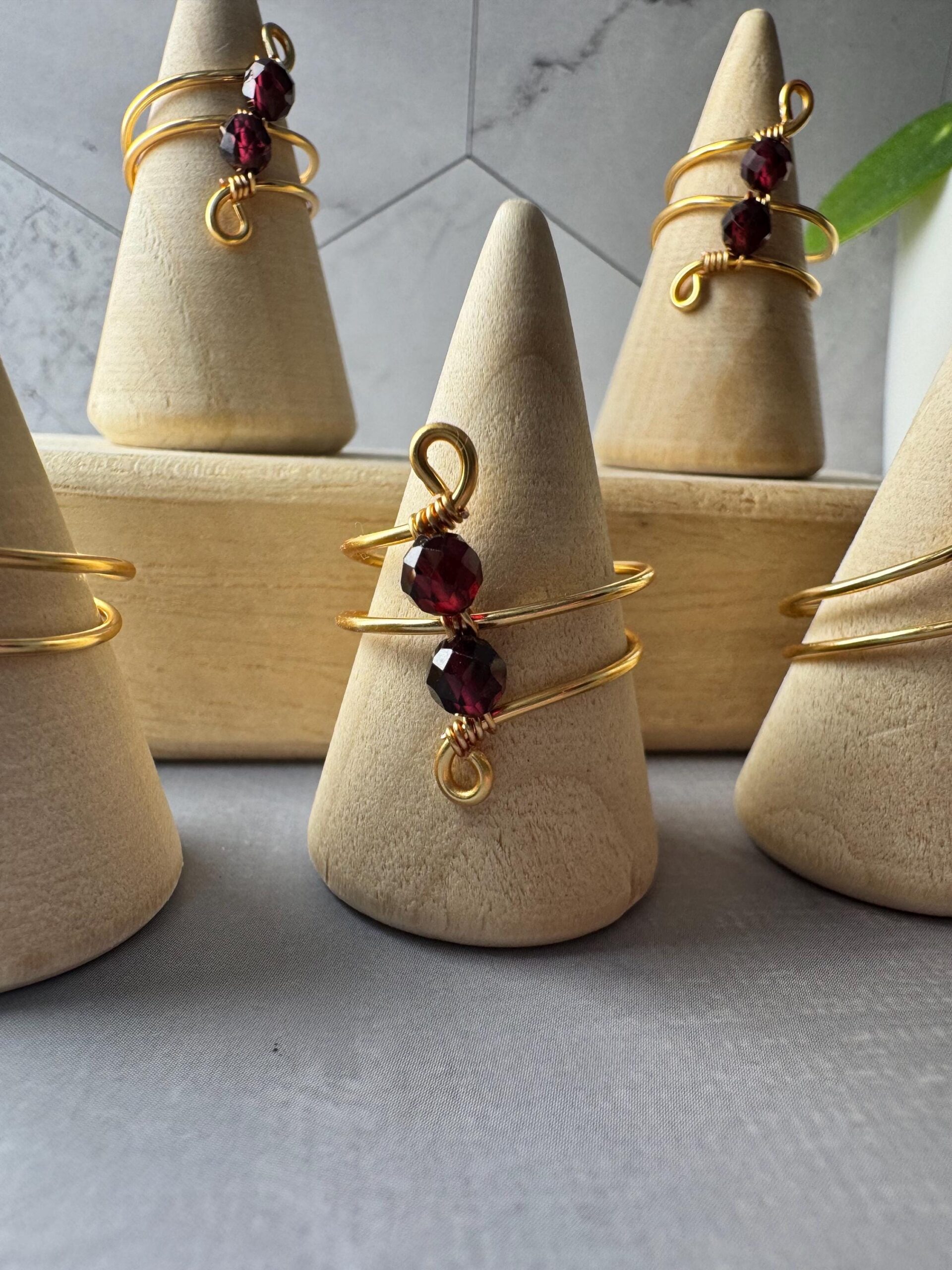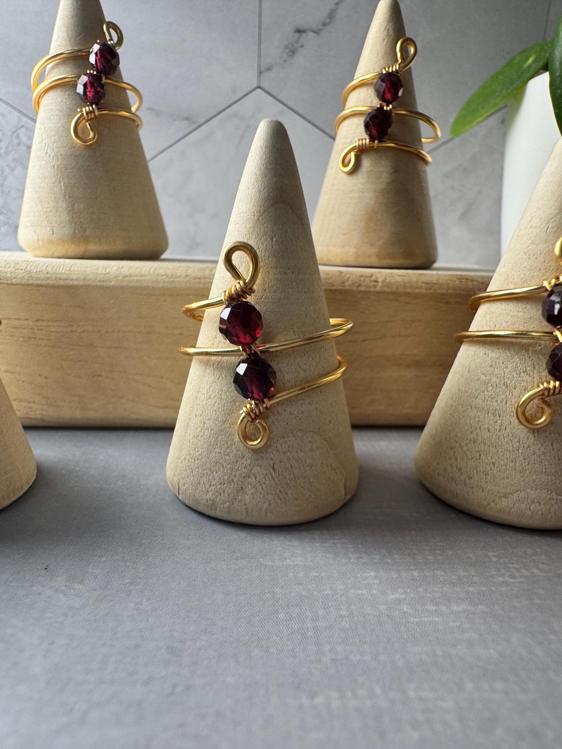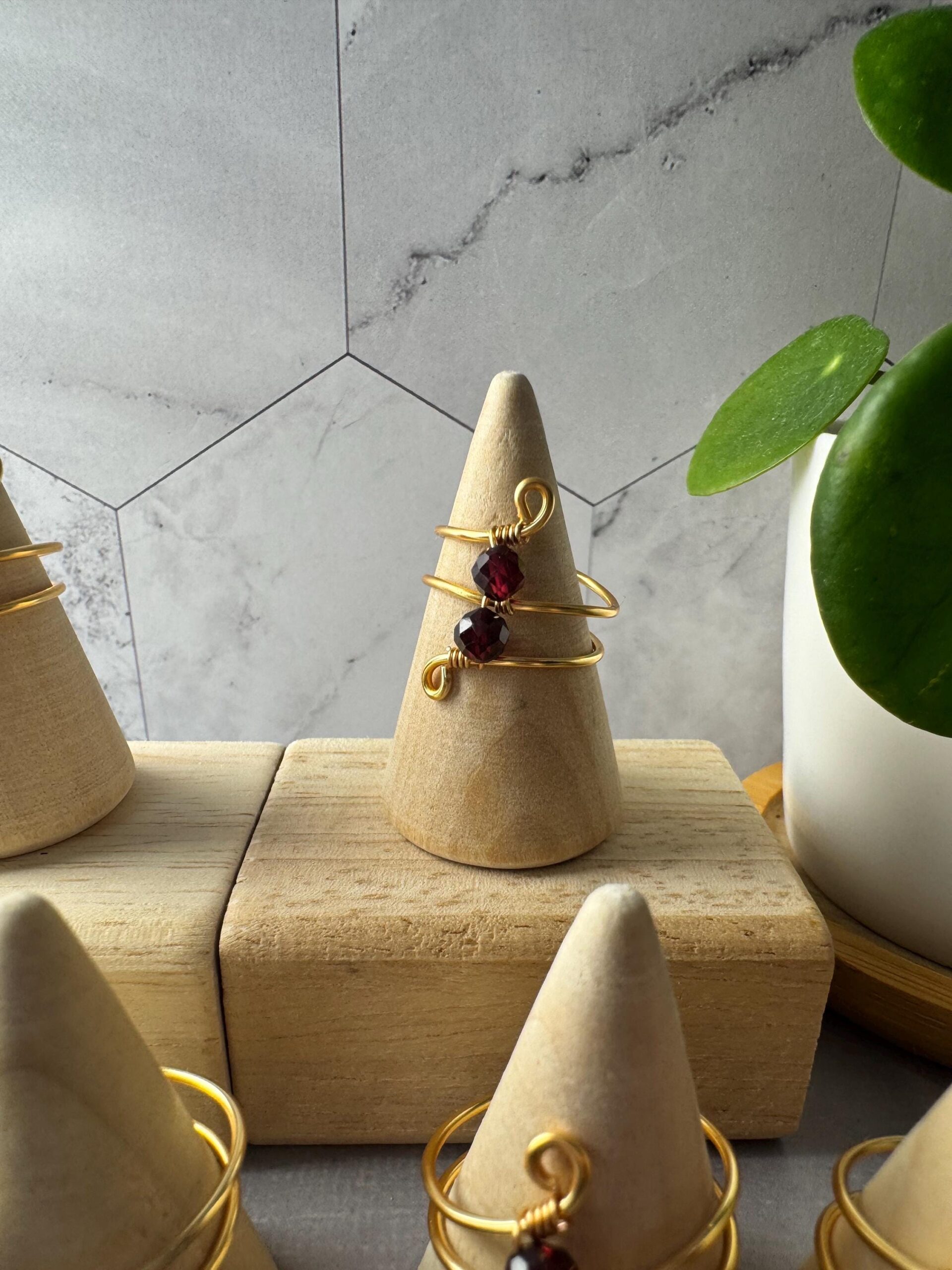 18K Gold Plated Spiral Wire-Wrapped Ring with Two Faceted Garnet Beads – Minimalist Jewelry