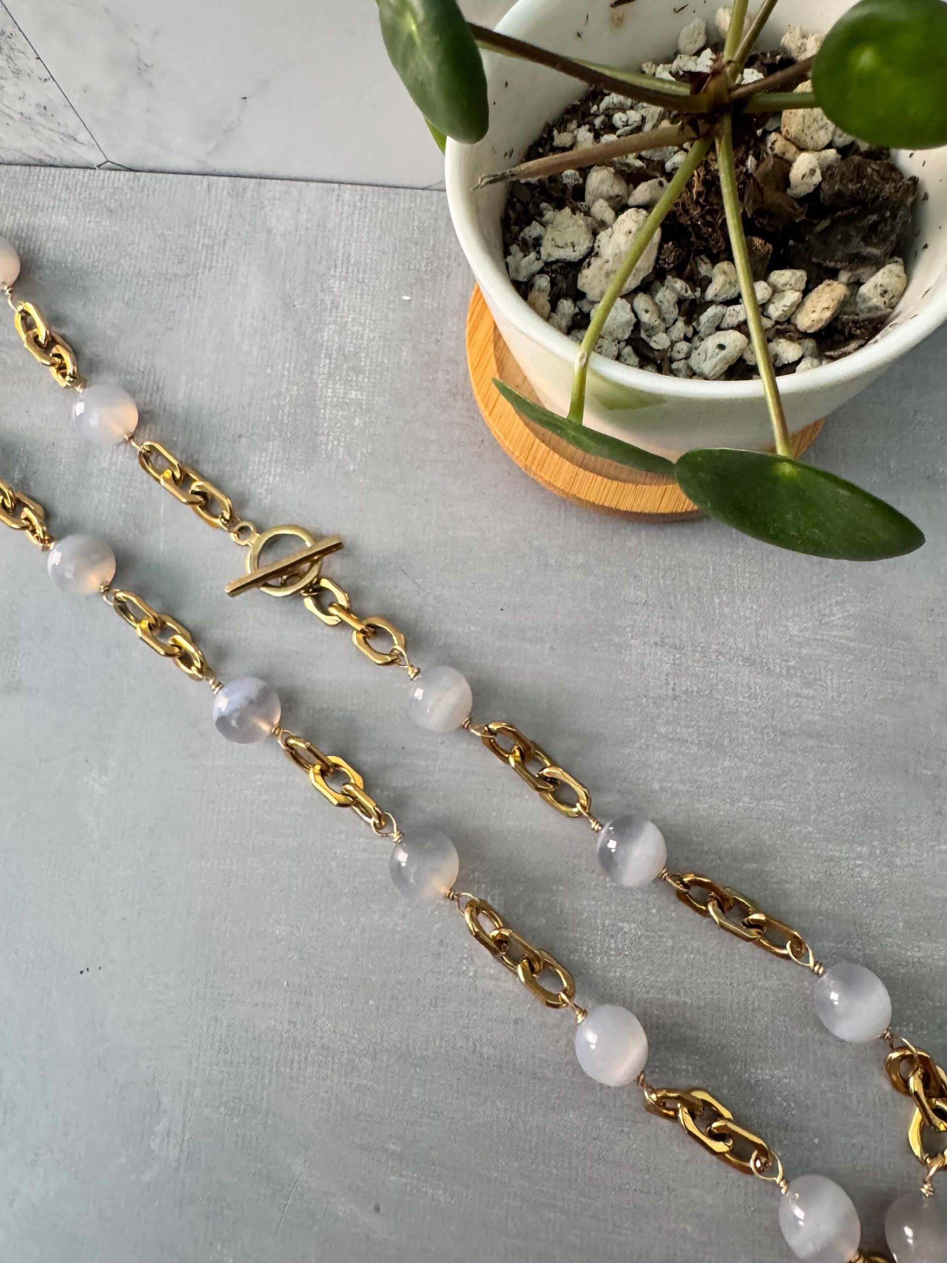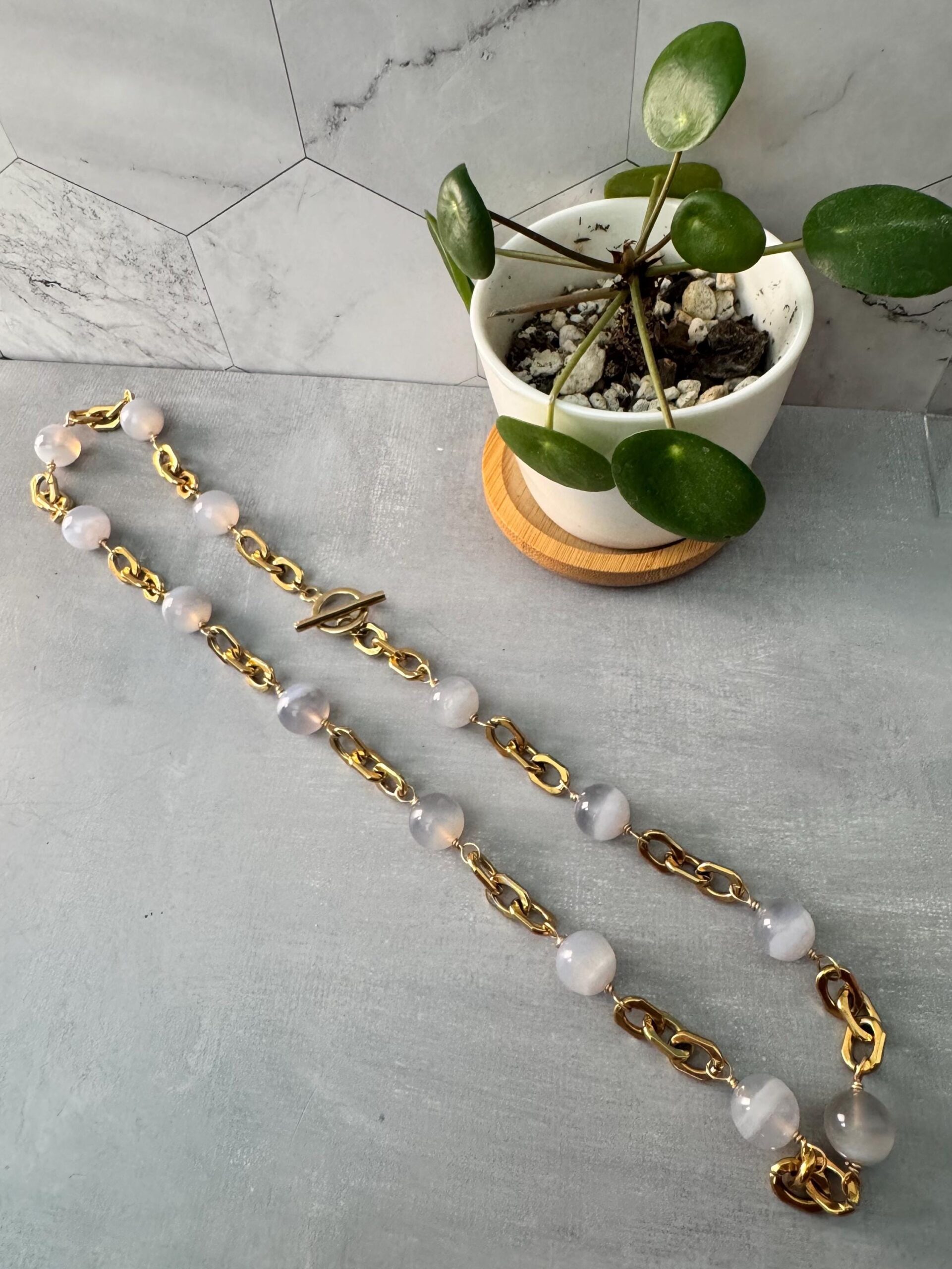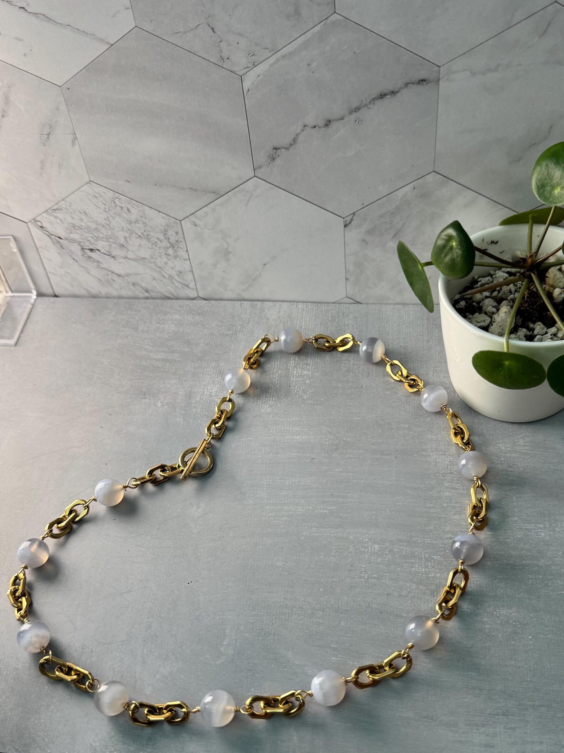 Sleek and refined, this necklace features soothing blue lace agate beads paired with bold, gold-toned stainless steel links. Each stone is naturally patterned with soft bands of blue and white, creating a calming and elegant look.