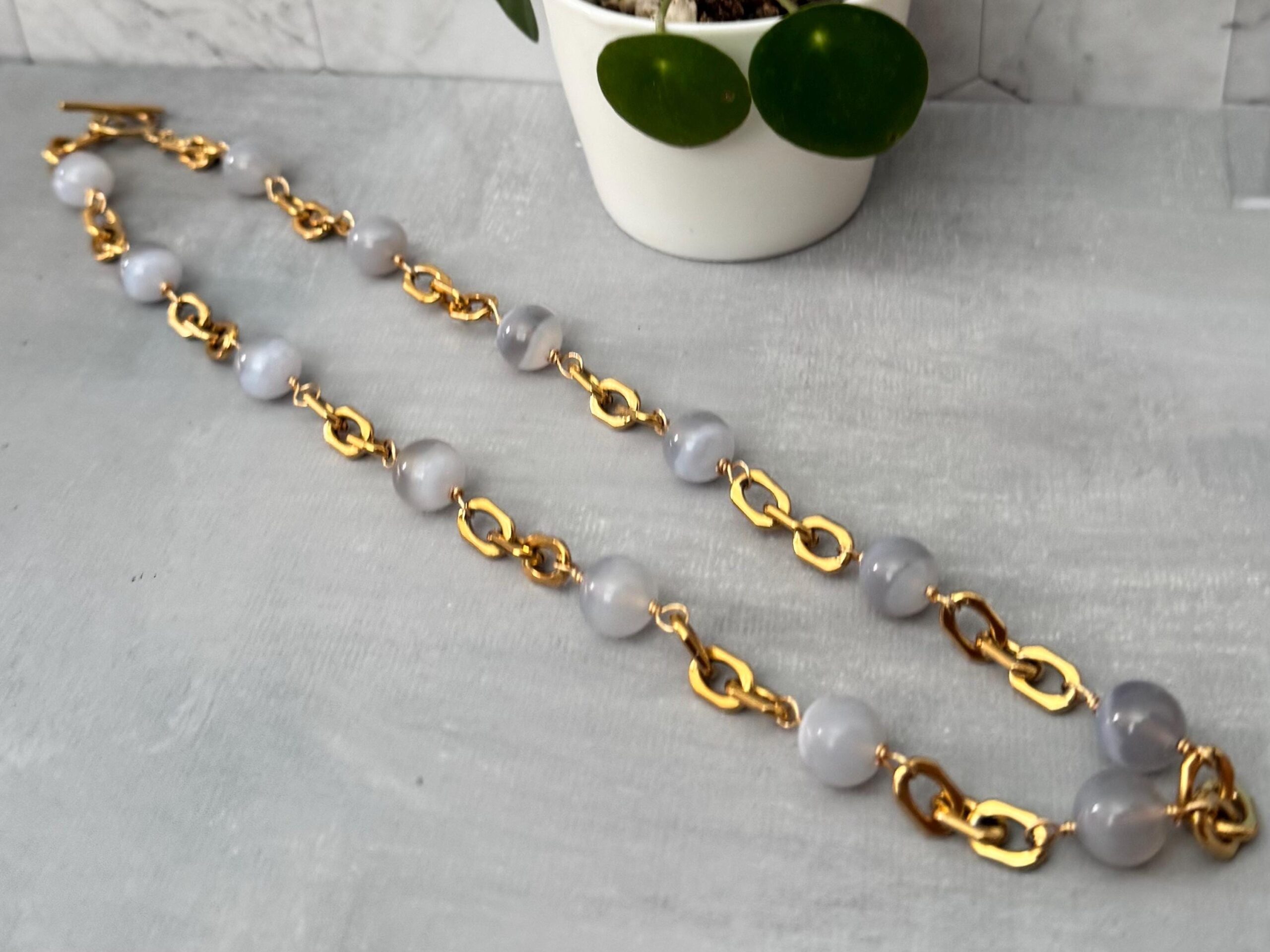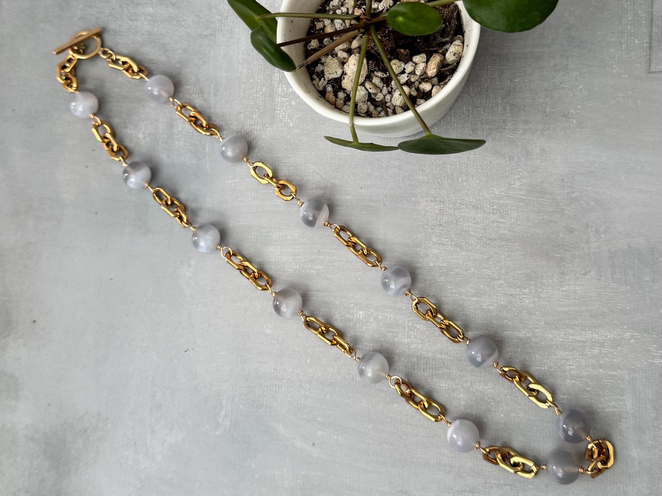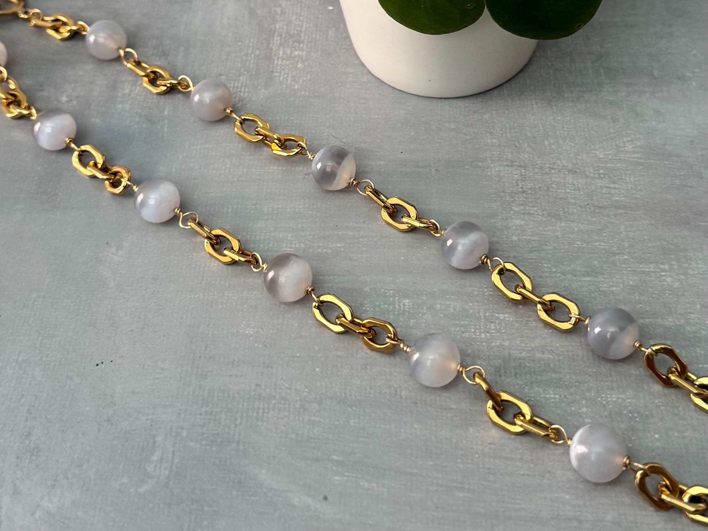 Sleek and refined, this necklace features soothing blue lace agate beads paired with bold, gold-toned stainless steel links. Each stone is naturally patterned with soft bands of blue and white, creating a calming and elegant look.