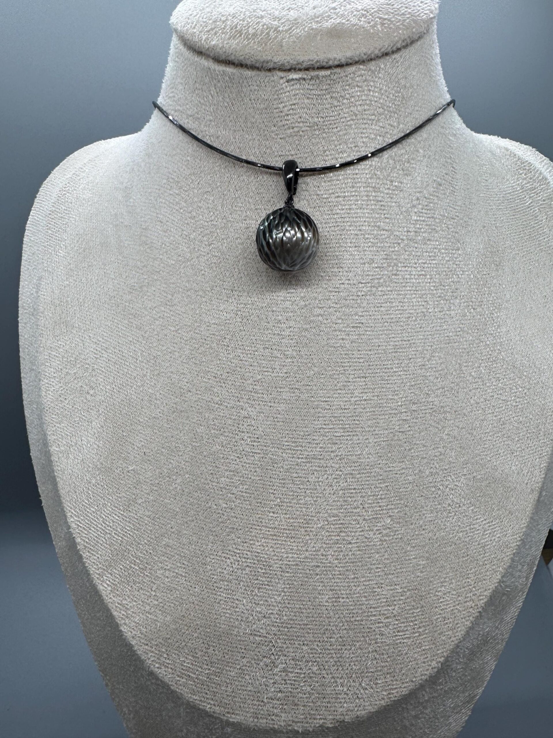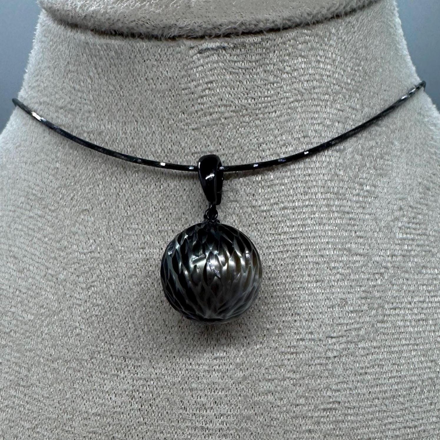 Black Rhodim Plated Necklace with Black and Silver carved Tahitian Pearl on black pendant universal clasp
