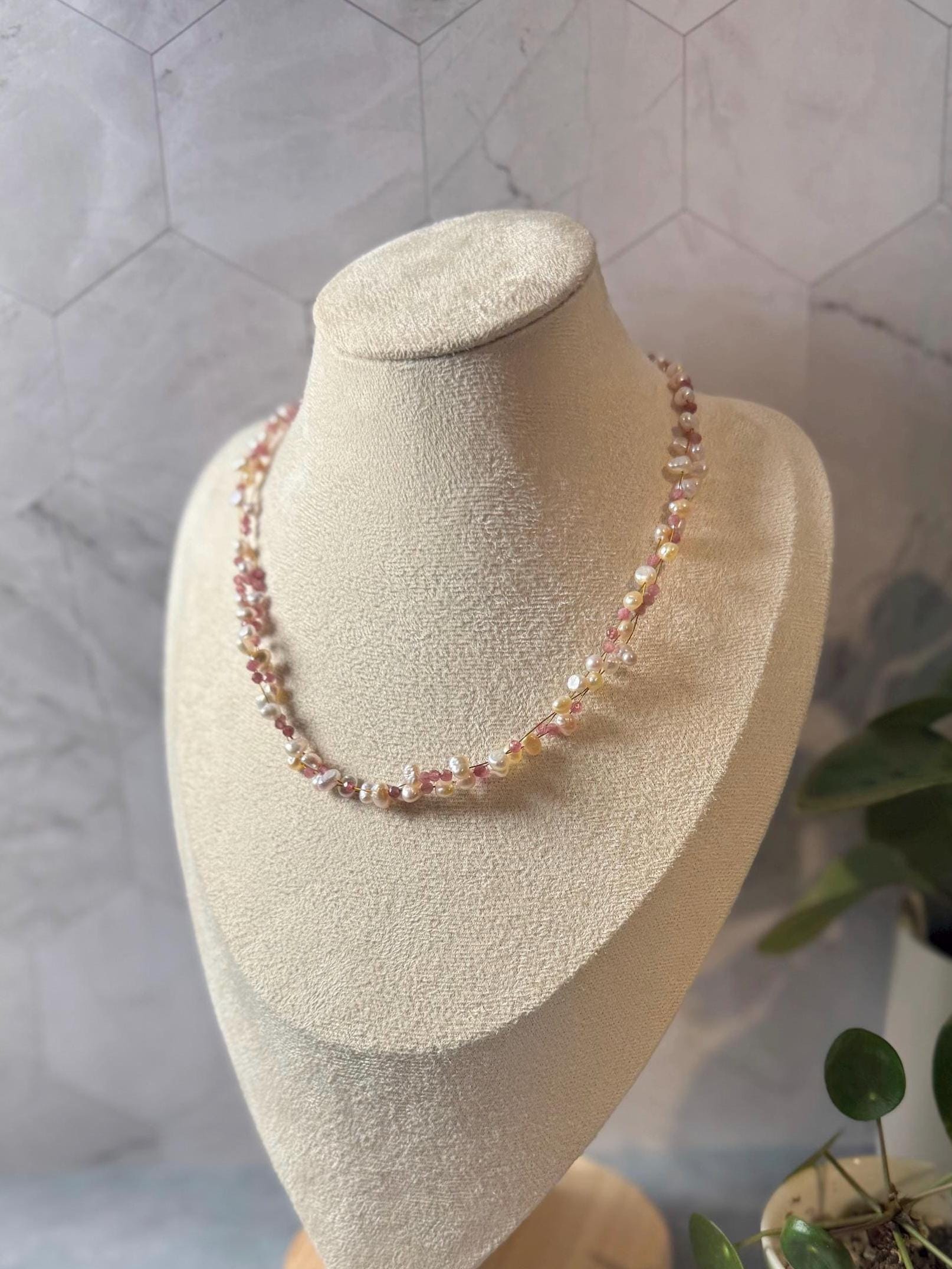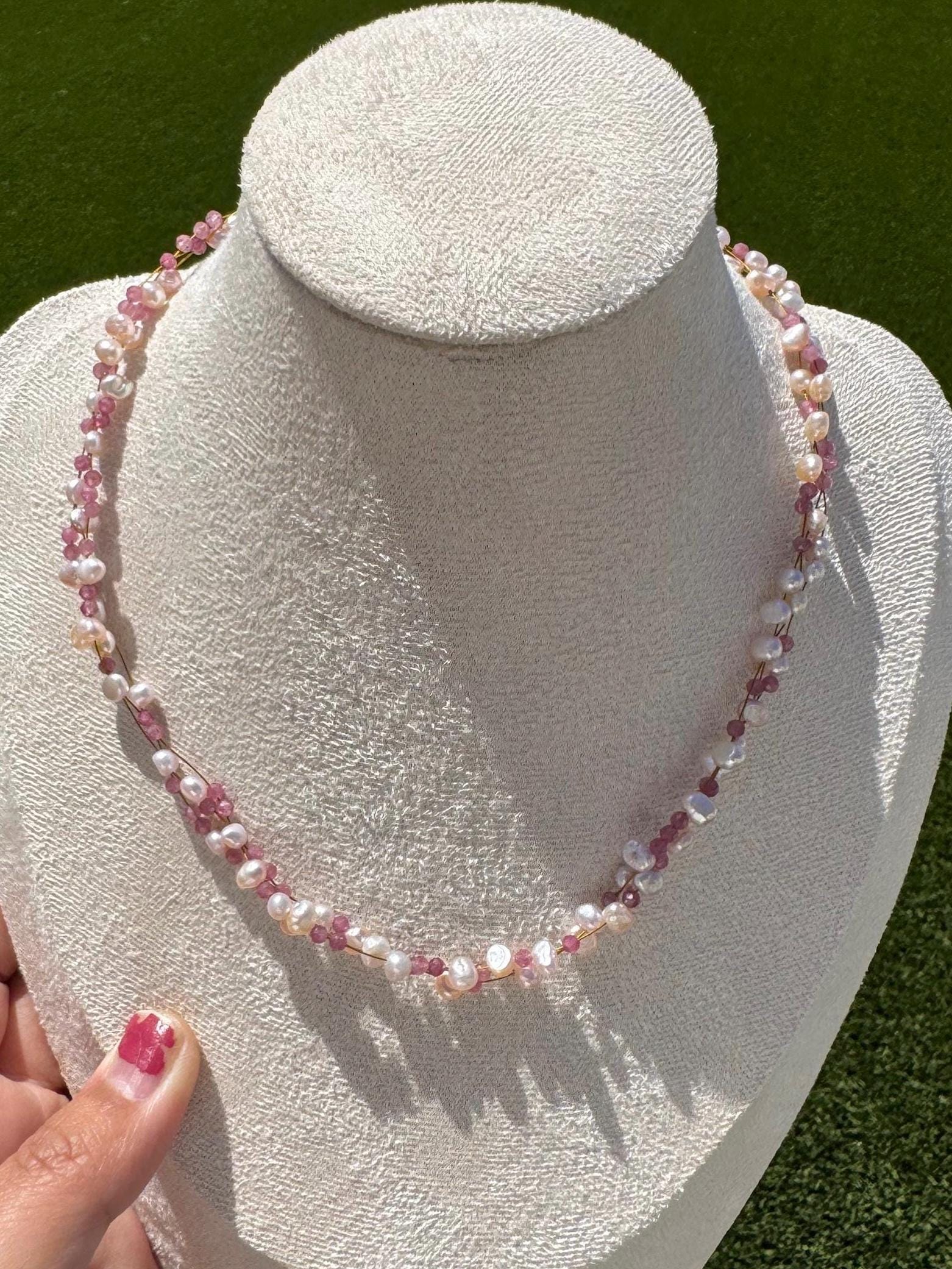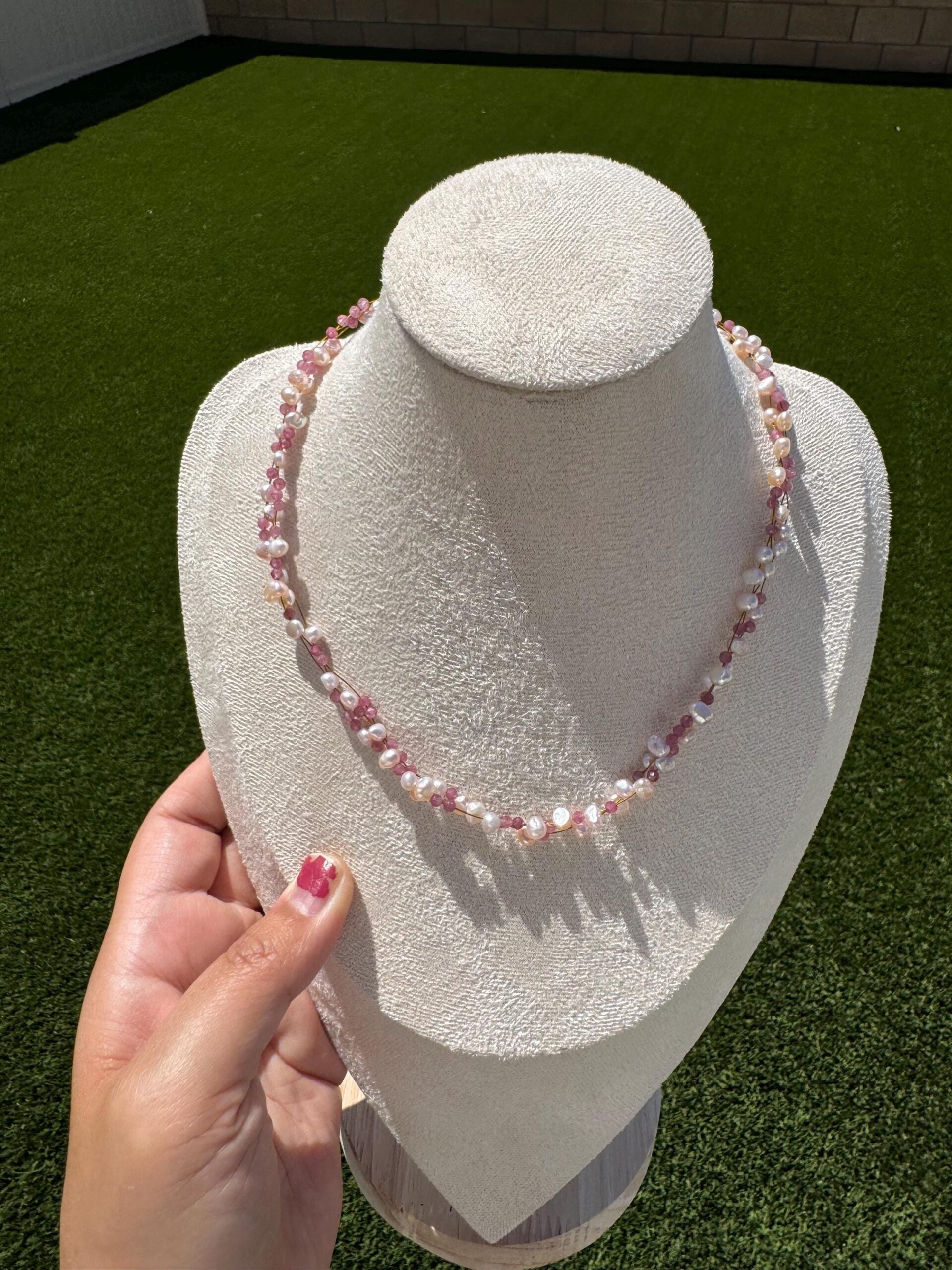 I was inspired by cotton candy. The pink keshi pearls remind me of pink cloudy looking cotton candy. As you eat cotton candy you can find little sugar crystals on it similar to how the tourmaline is in the necklace.