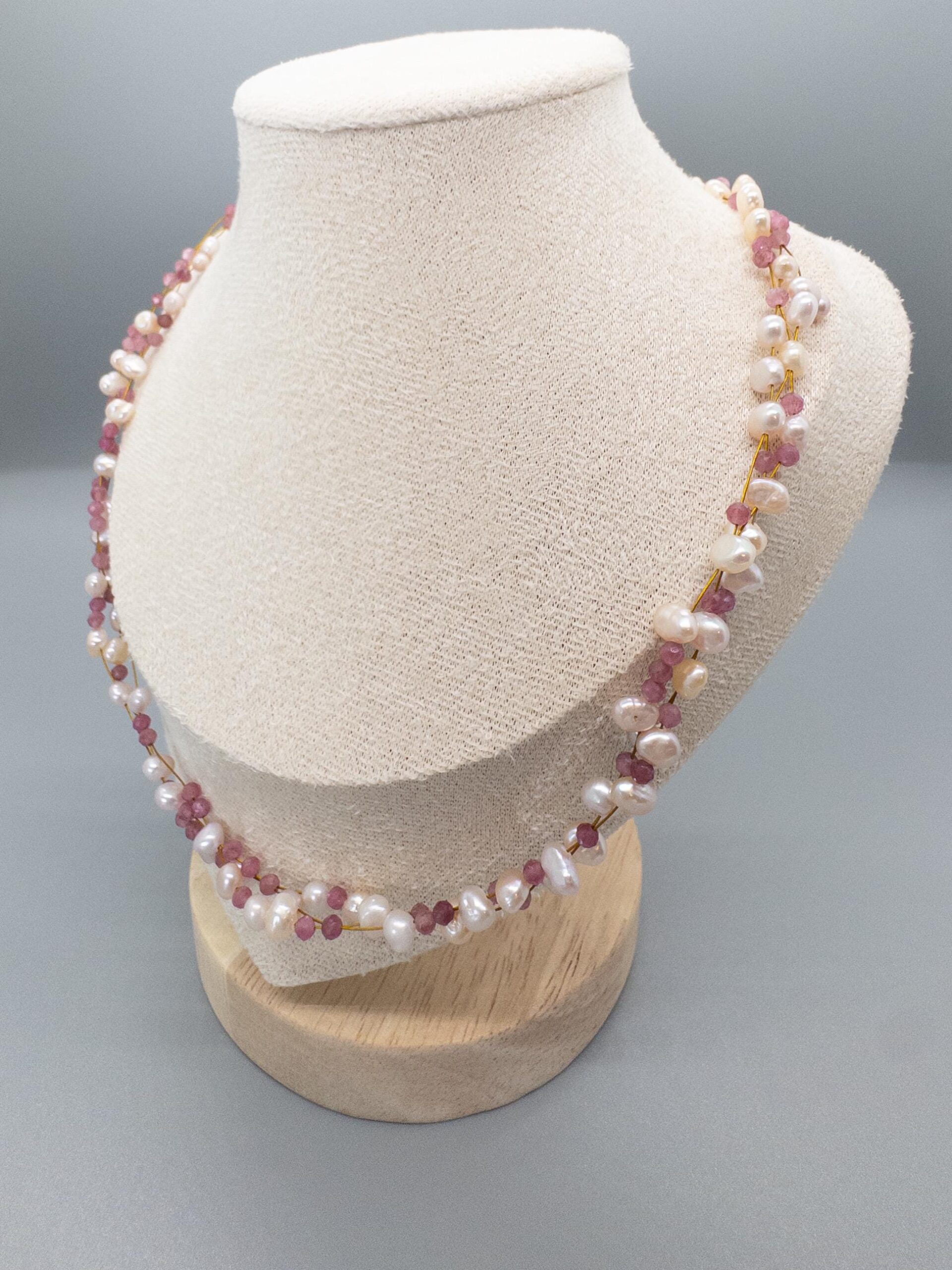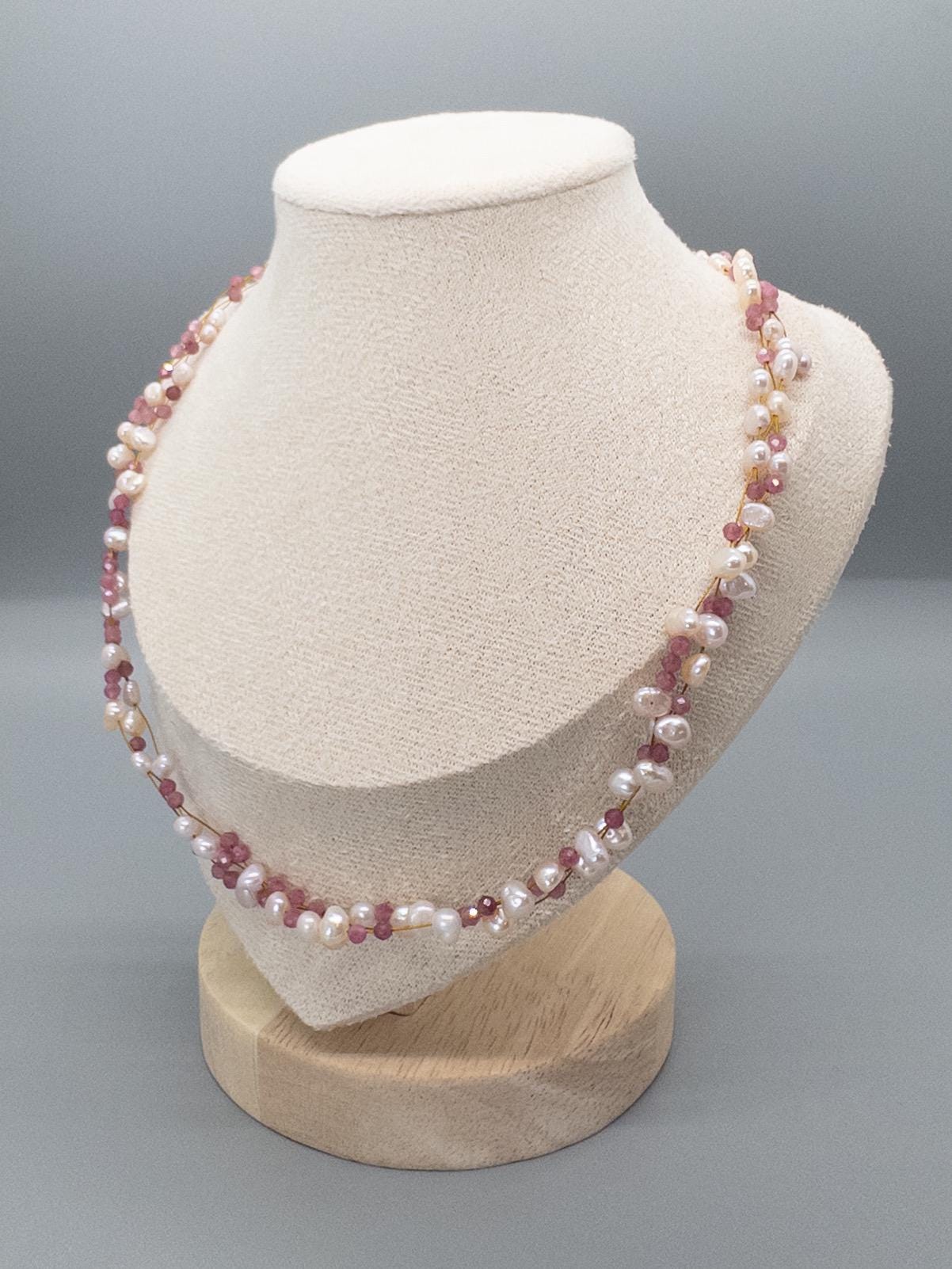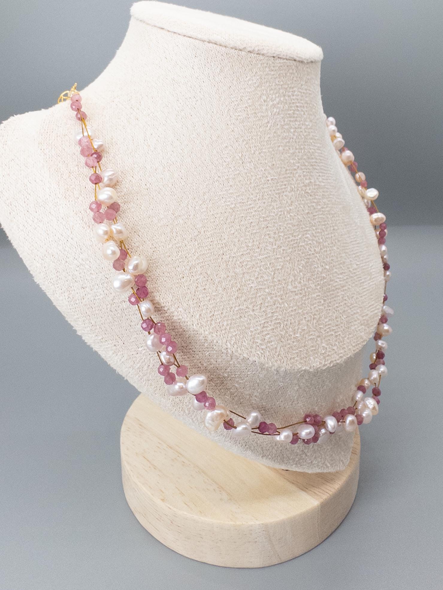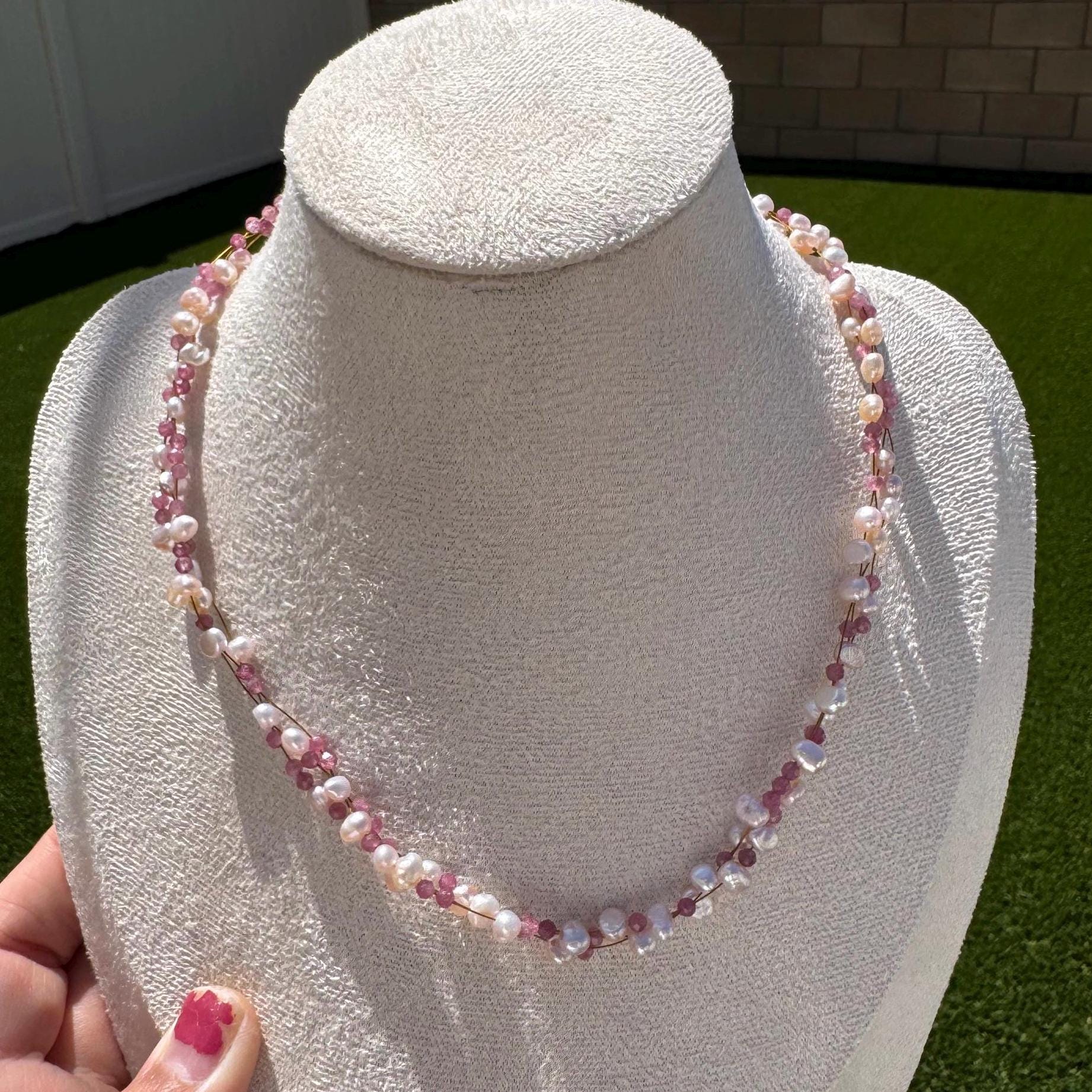 I was inspired by cotton candy. The pink keshi pearls remind me of pink cloudy looking cotton candy. As you eat cotton candy you can find little sugar crystals on it similar to how the tourmaline is in the necklace.