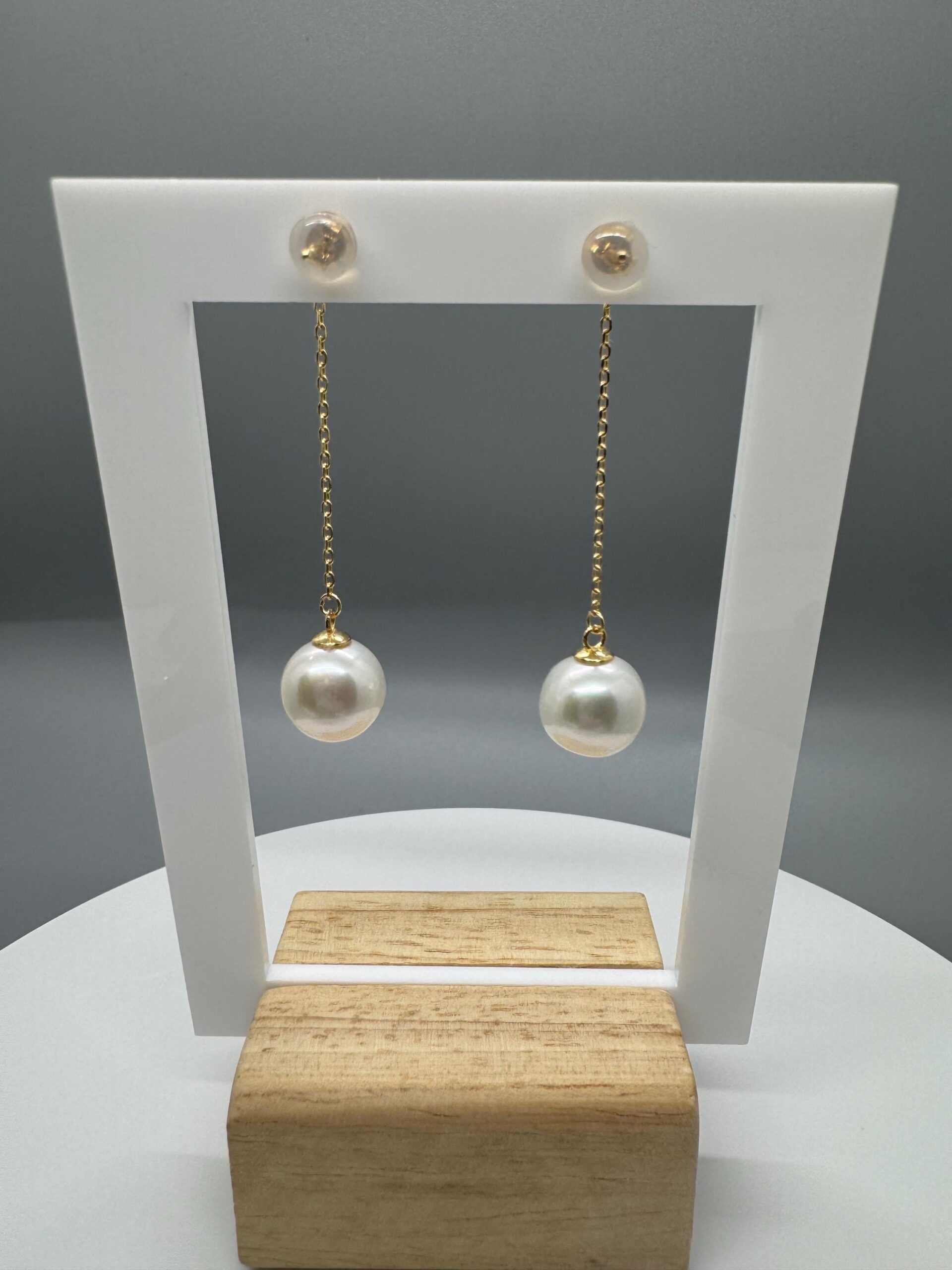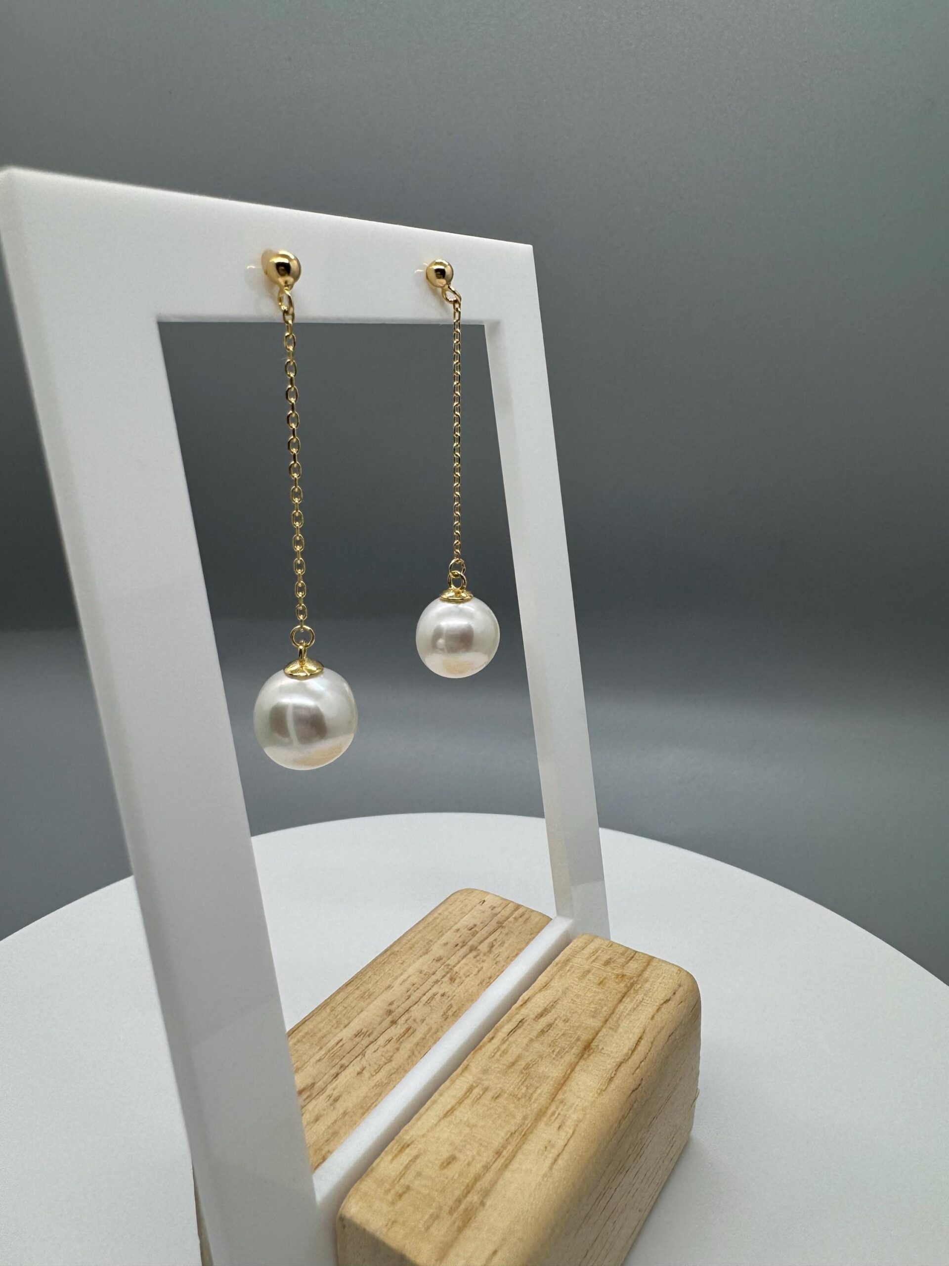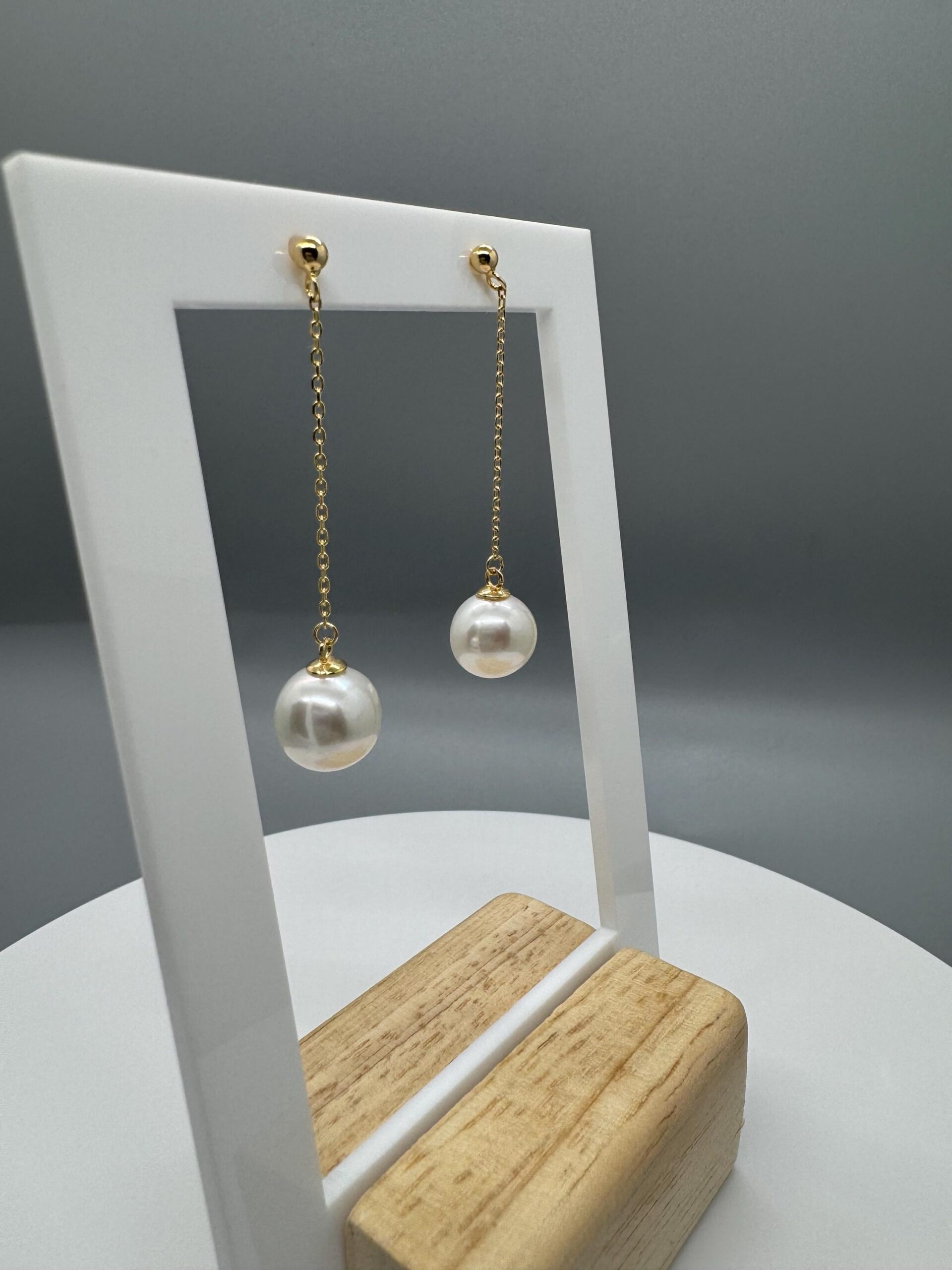 A pair of white round Edison dangling off 18k gold plated sterling silver s925 studs.