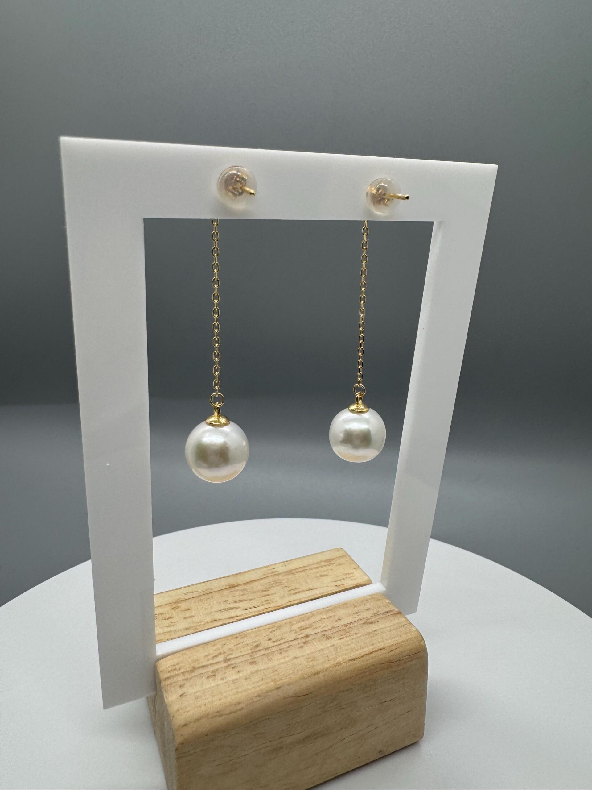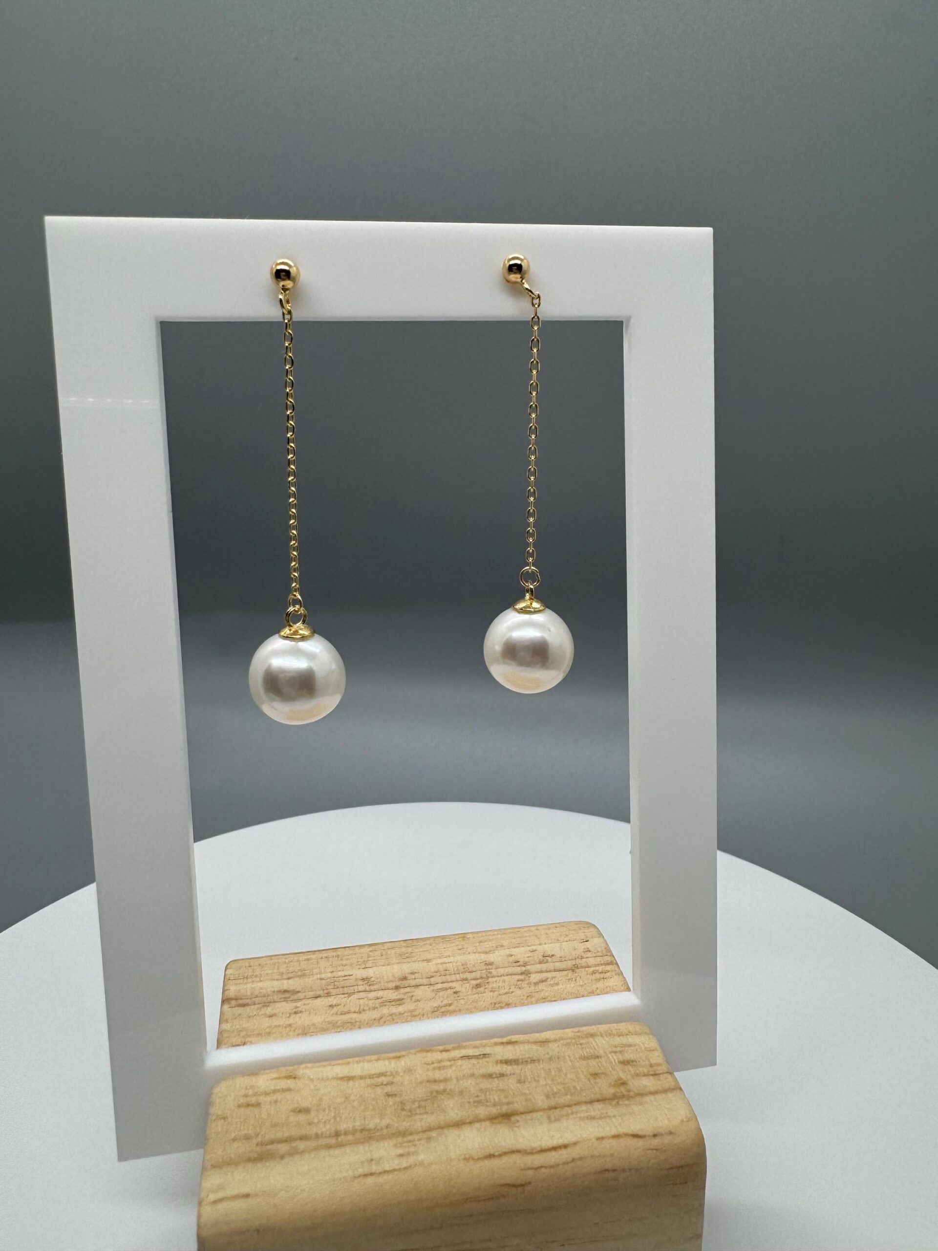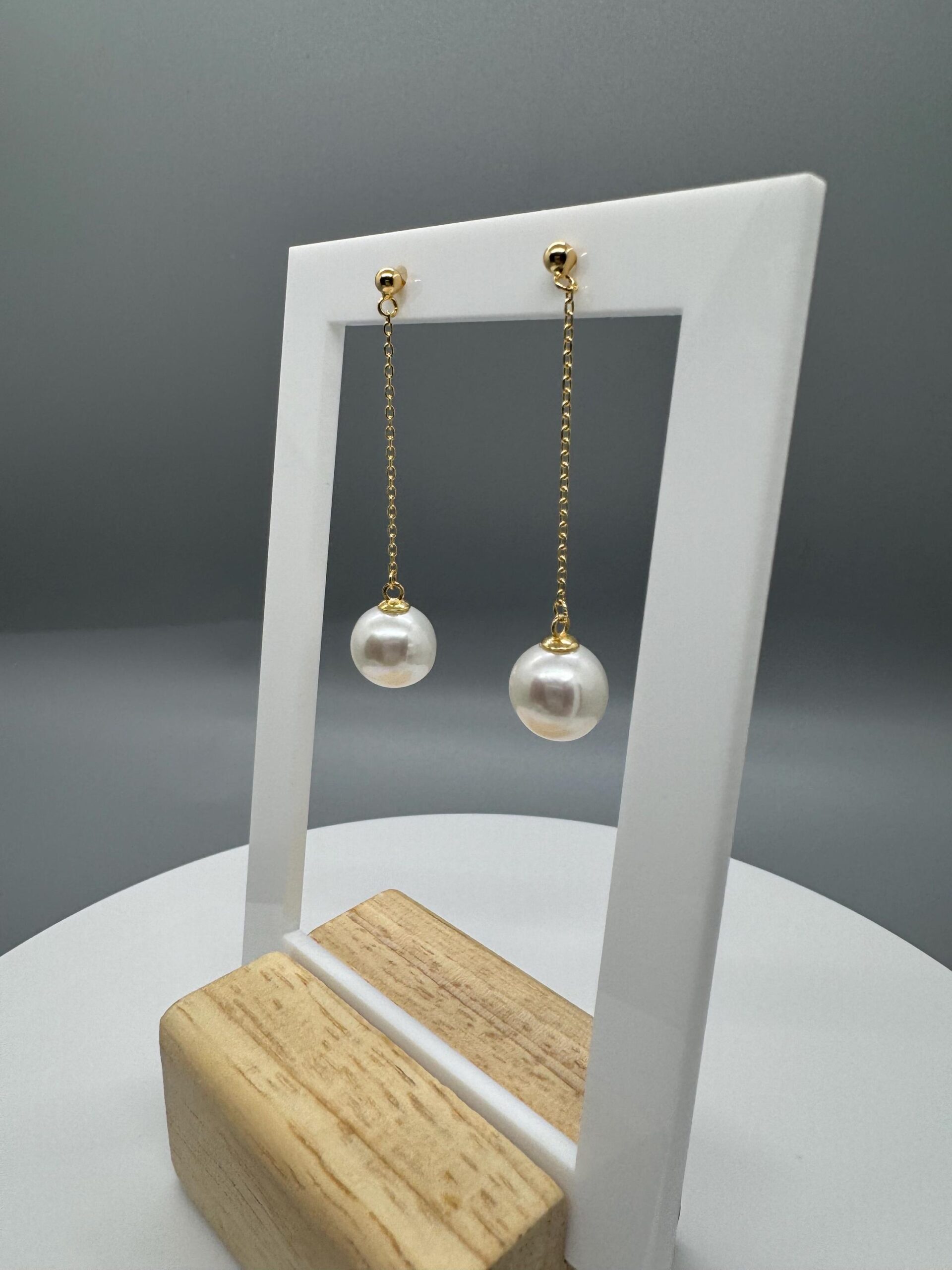 A pair of white round Edison dangling off 18k gold plated sterling silver s925 studs.