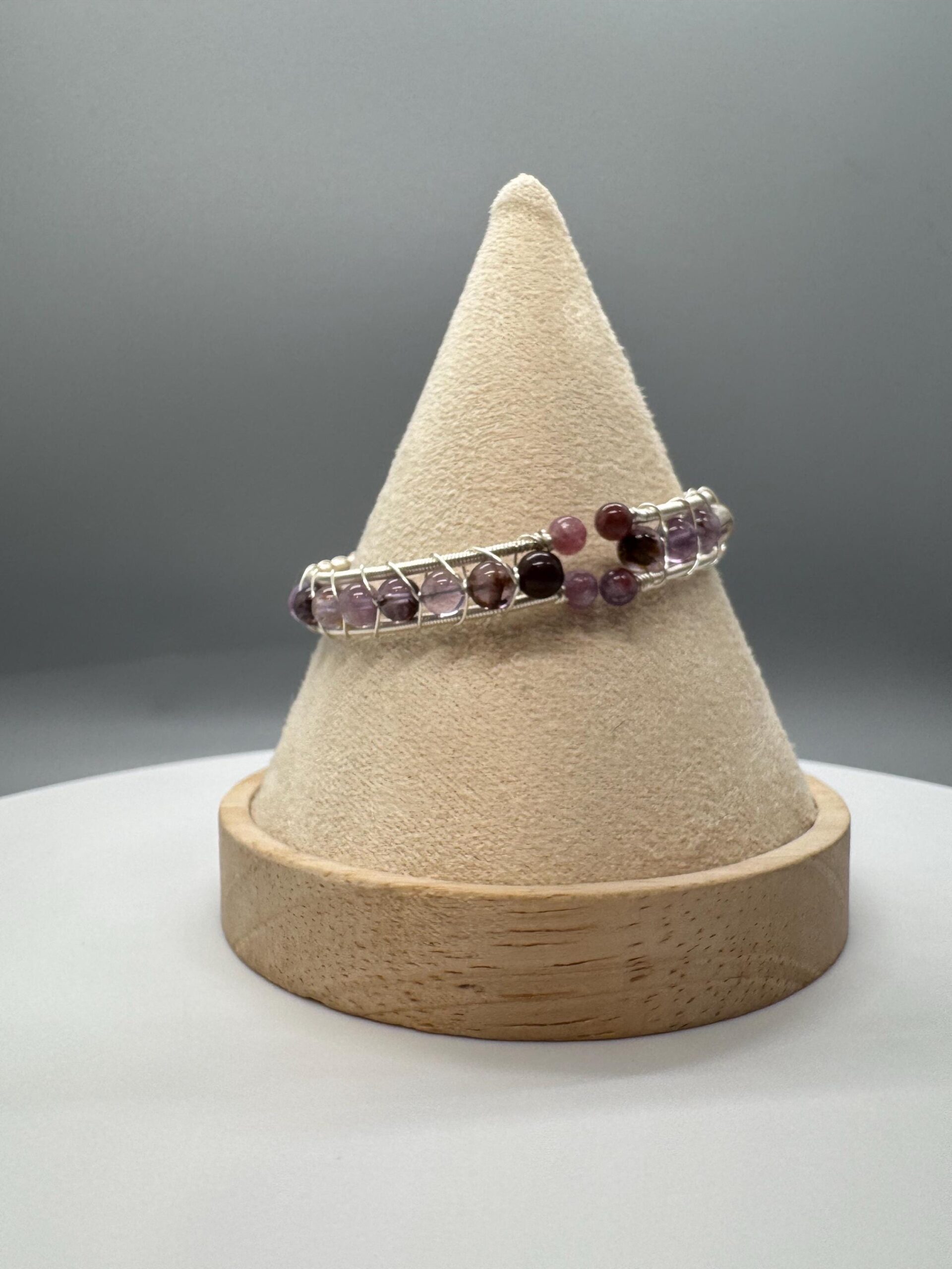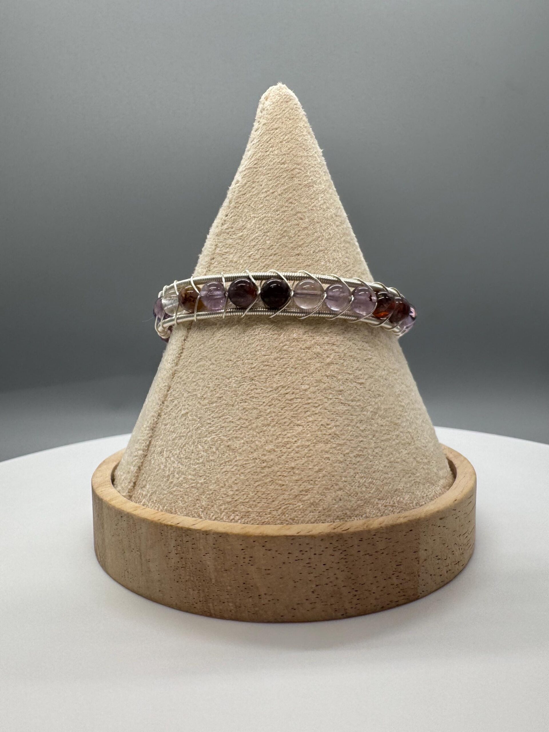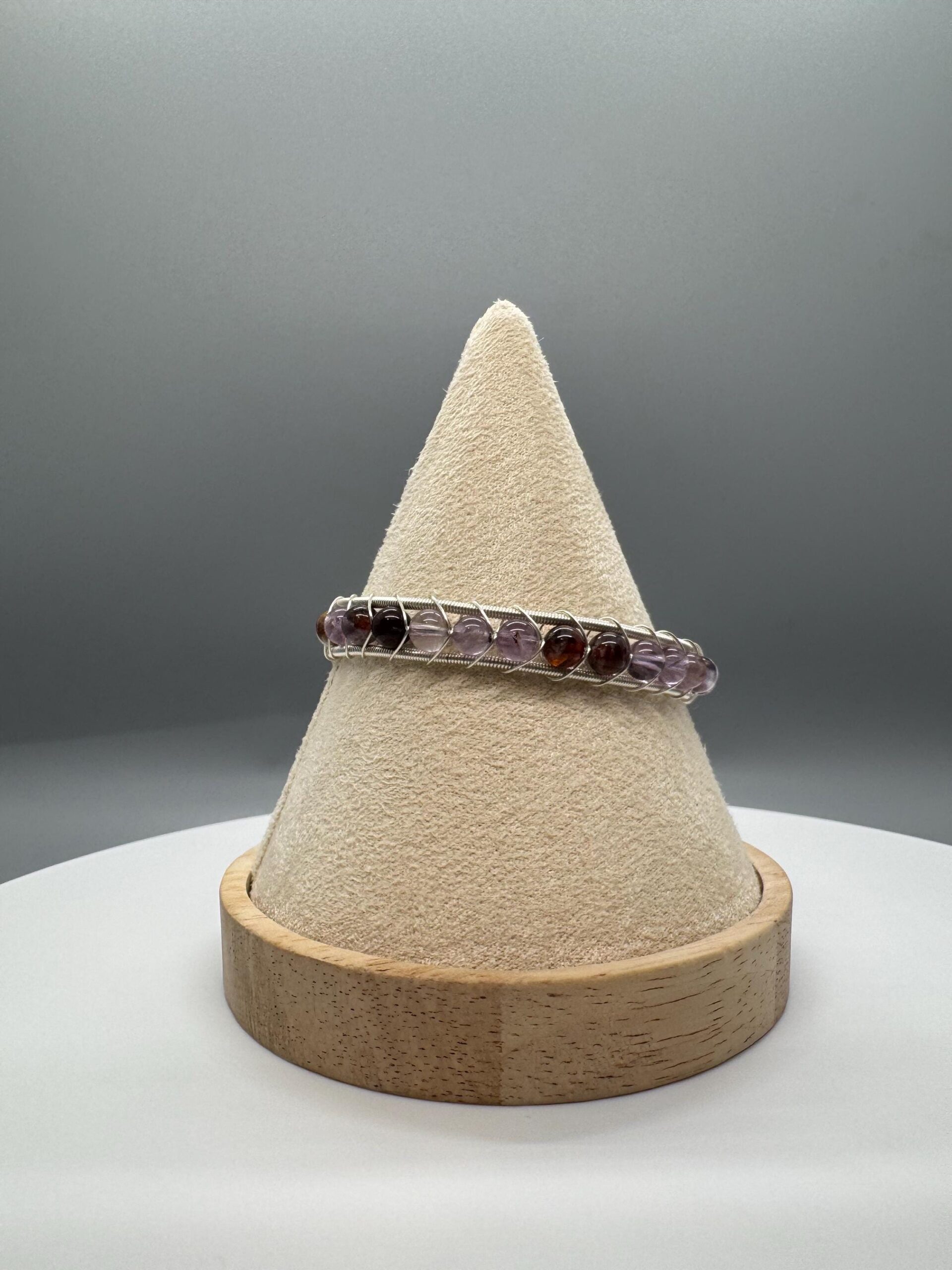 This bangle is made with garden amethyst beads. It is a cuff bangle and therefore will fit a wide range is wrist sizes as it can adjust to the shape of your wrist