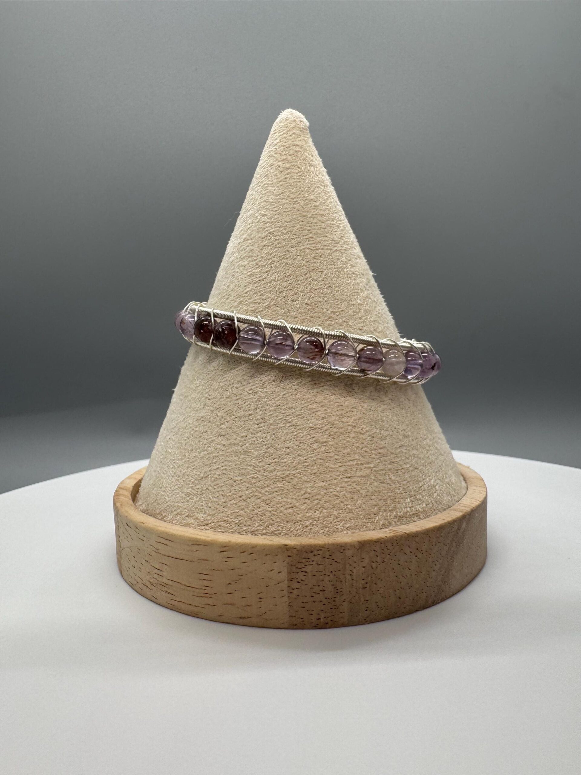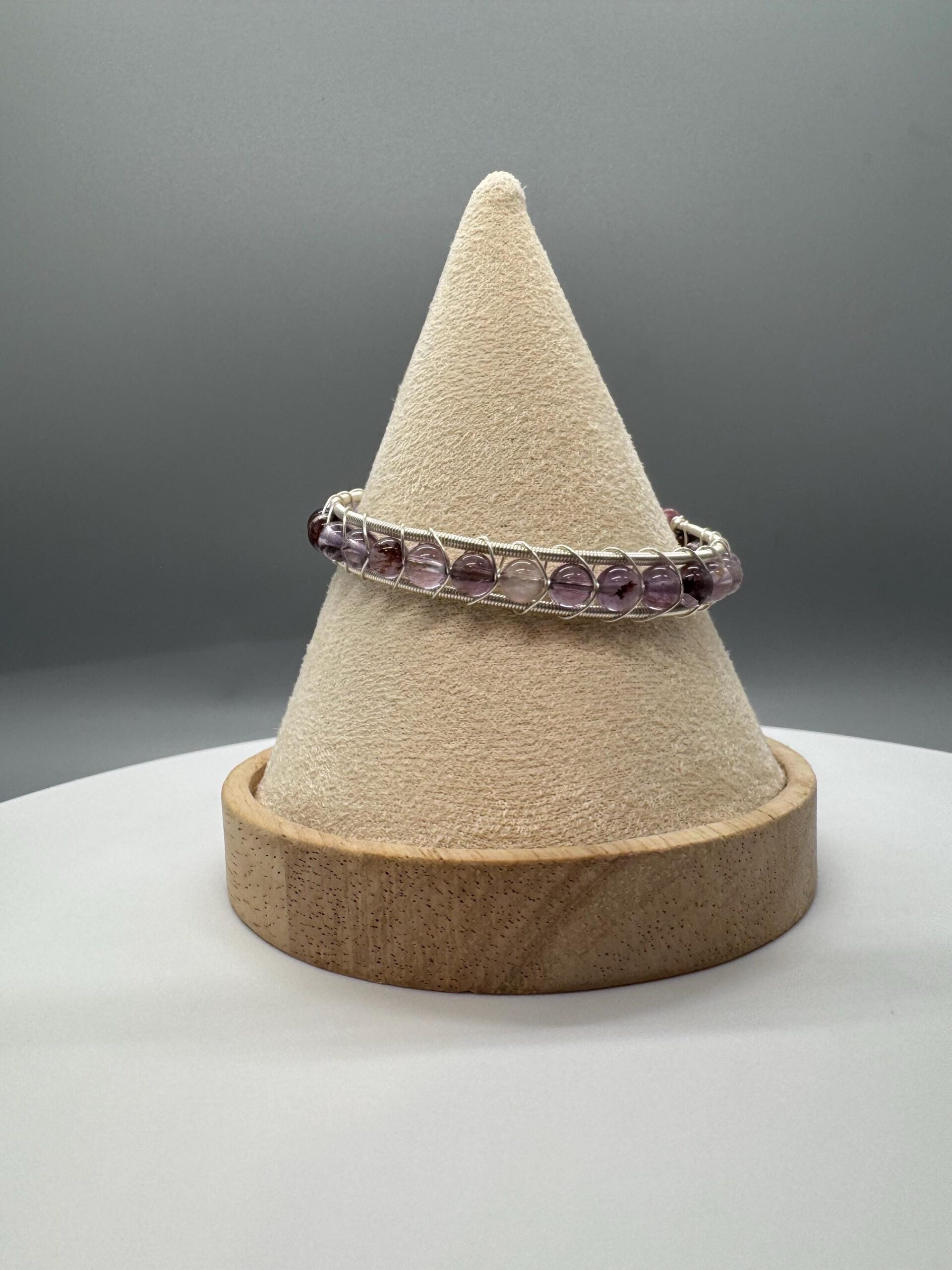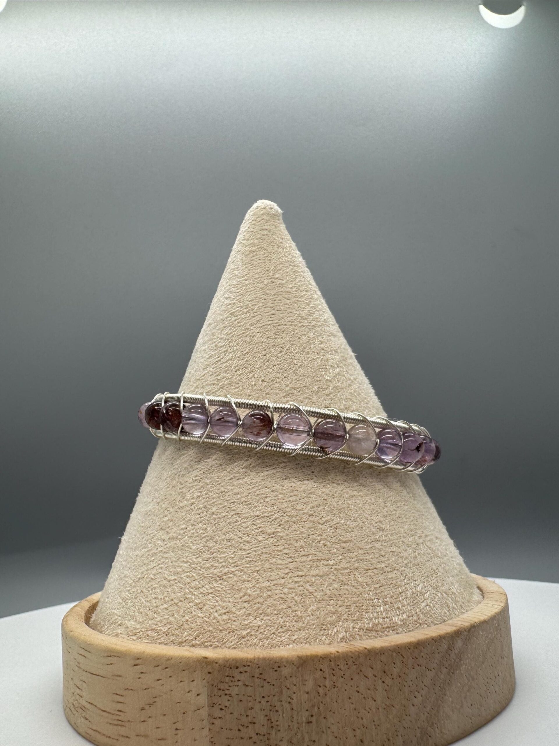 This bangle is made with garden amethyst beads. It is a cuff bangle and therefore will fit a wide range is wrist sizes as it can adjust to the shape of your wrist