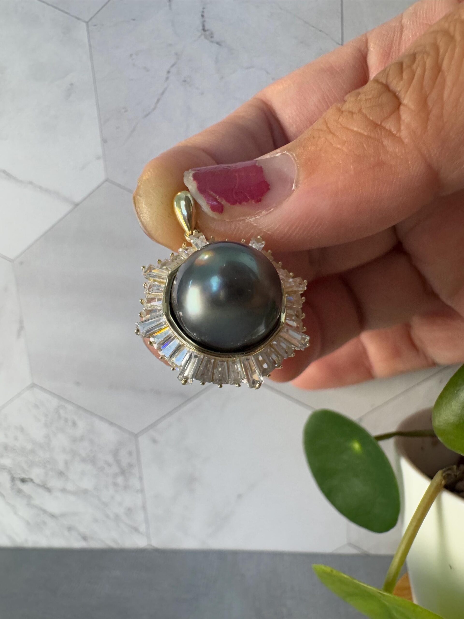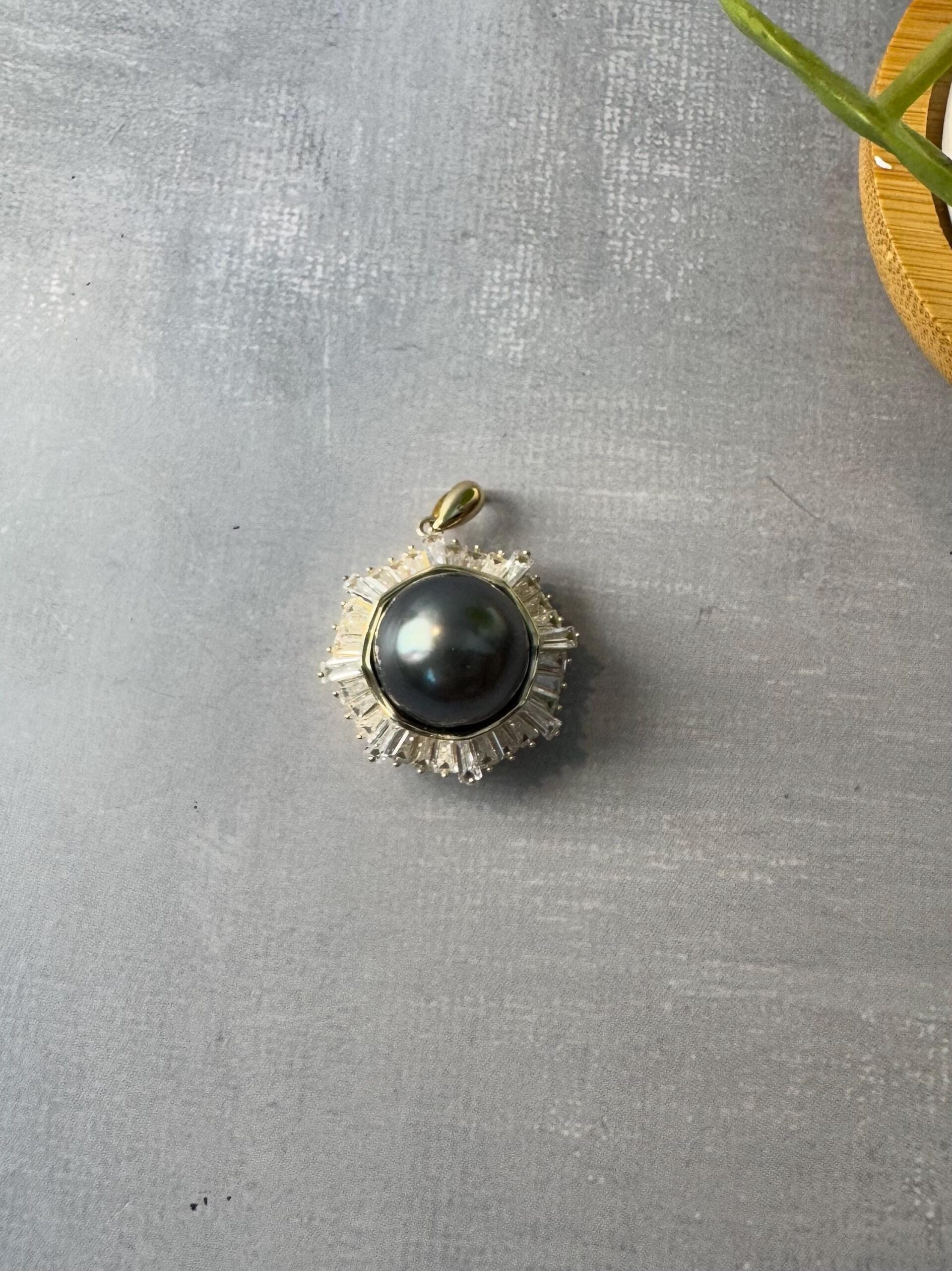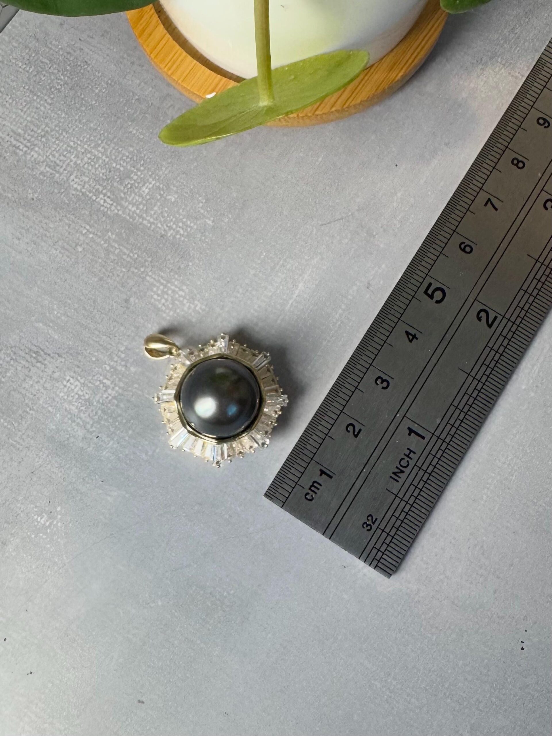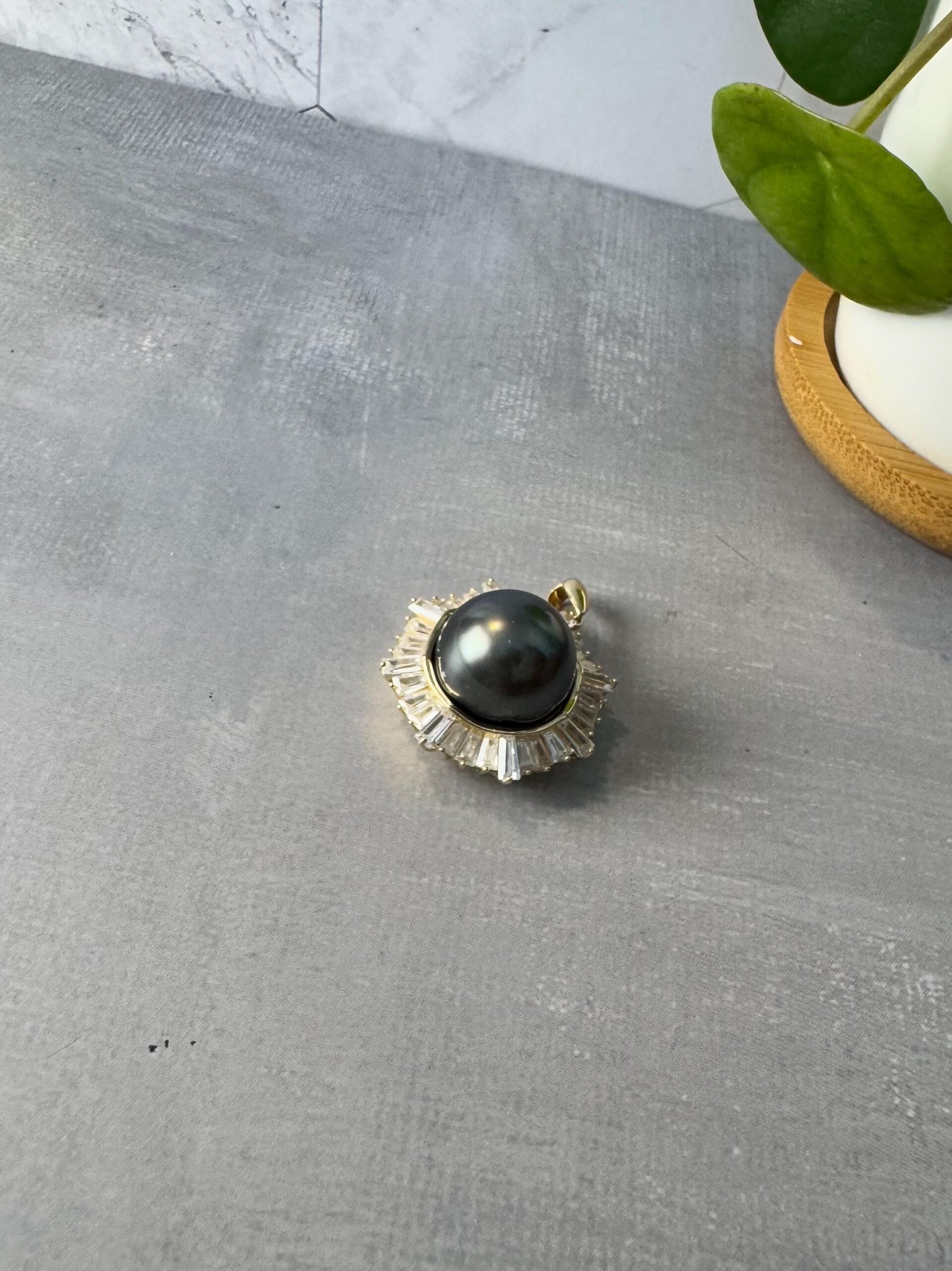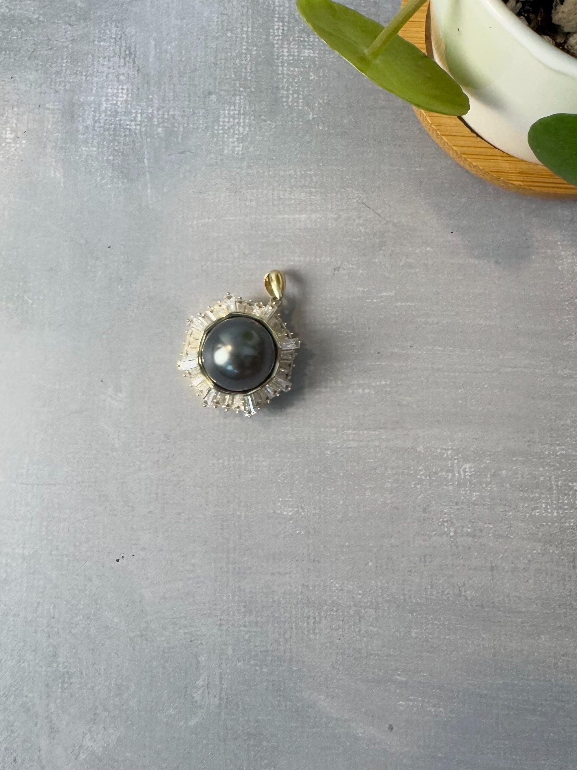 Add timeless elegance to your jewelry collection with this genuine Tahitian black pearl pendant. Set in sterling silver with a luxurious 18K gold plating, this pendant features a radiant black pearl surrounded by a sparkling halo of high-quality cubic zirconia baguettes.