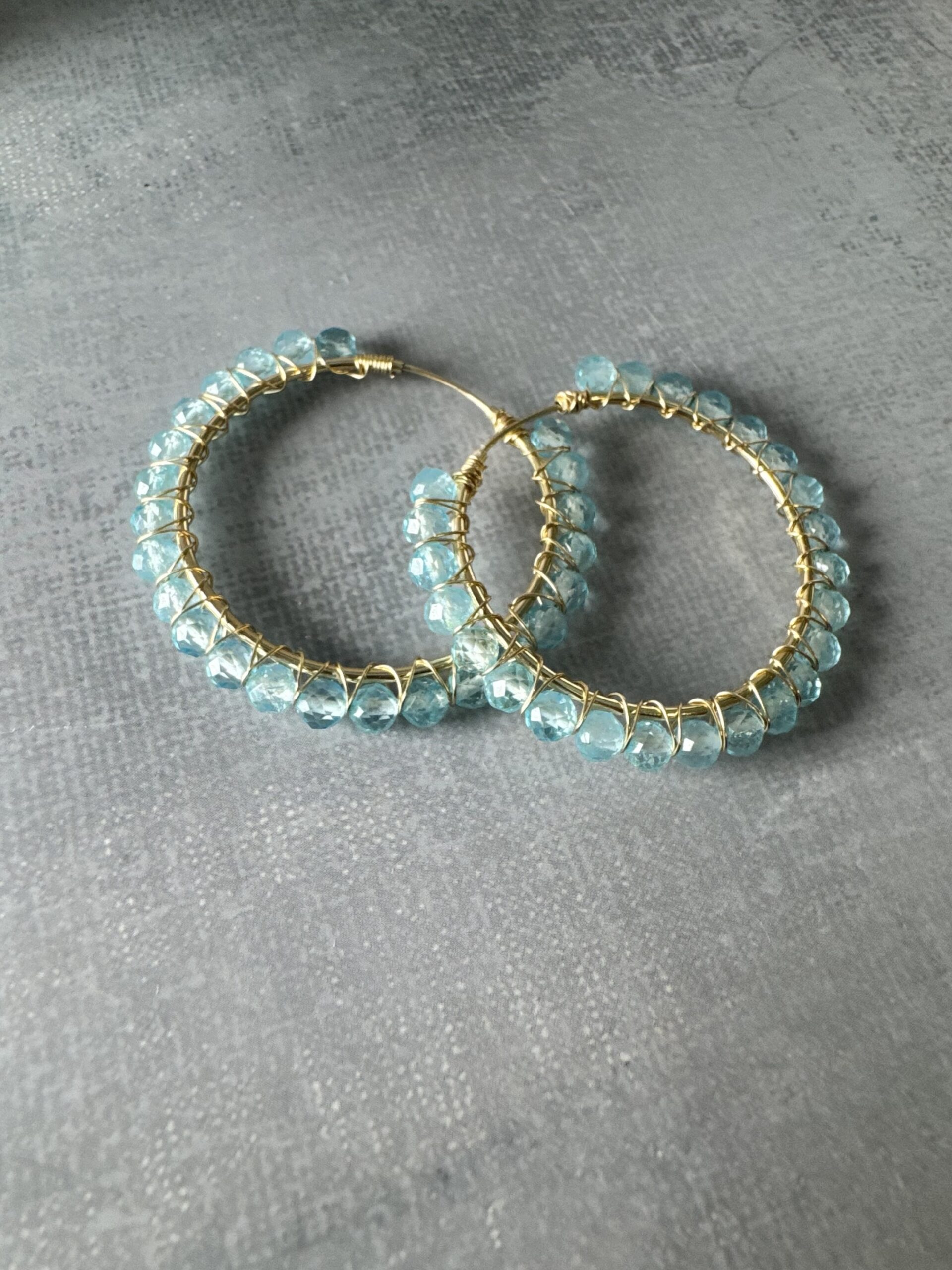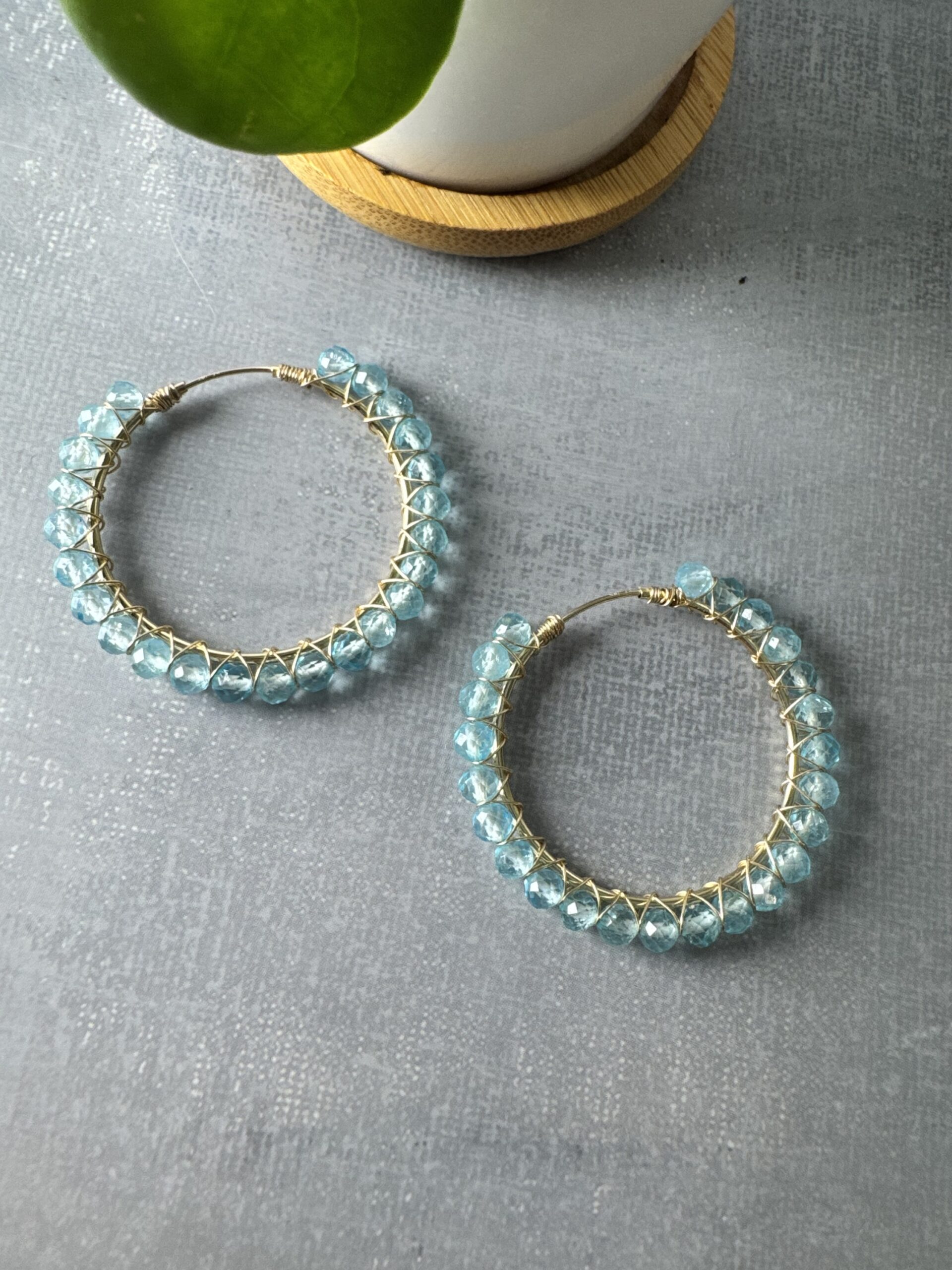 Handcrafted gold filled hoop earrings adorned with genuine blue topaz gemstones. Each 34.5mm hoop is wire-wrapped by hand using 14/20 gold-filled wire, creating a timeless, radiant shimmer. Lightweight, durable, and elegant — perfect for everyday wear or special occasions.