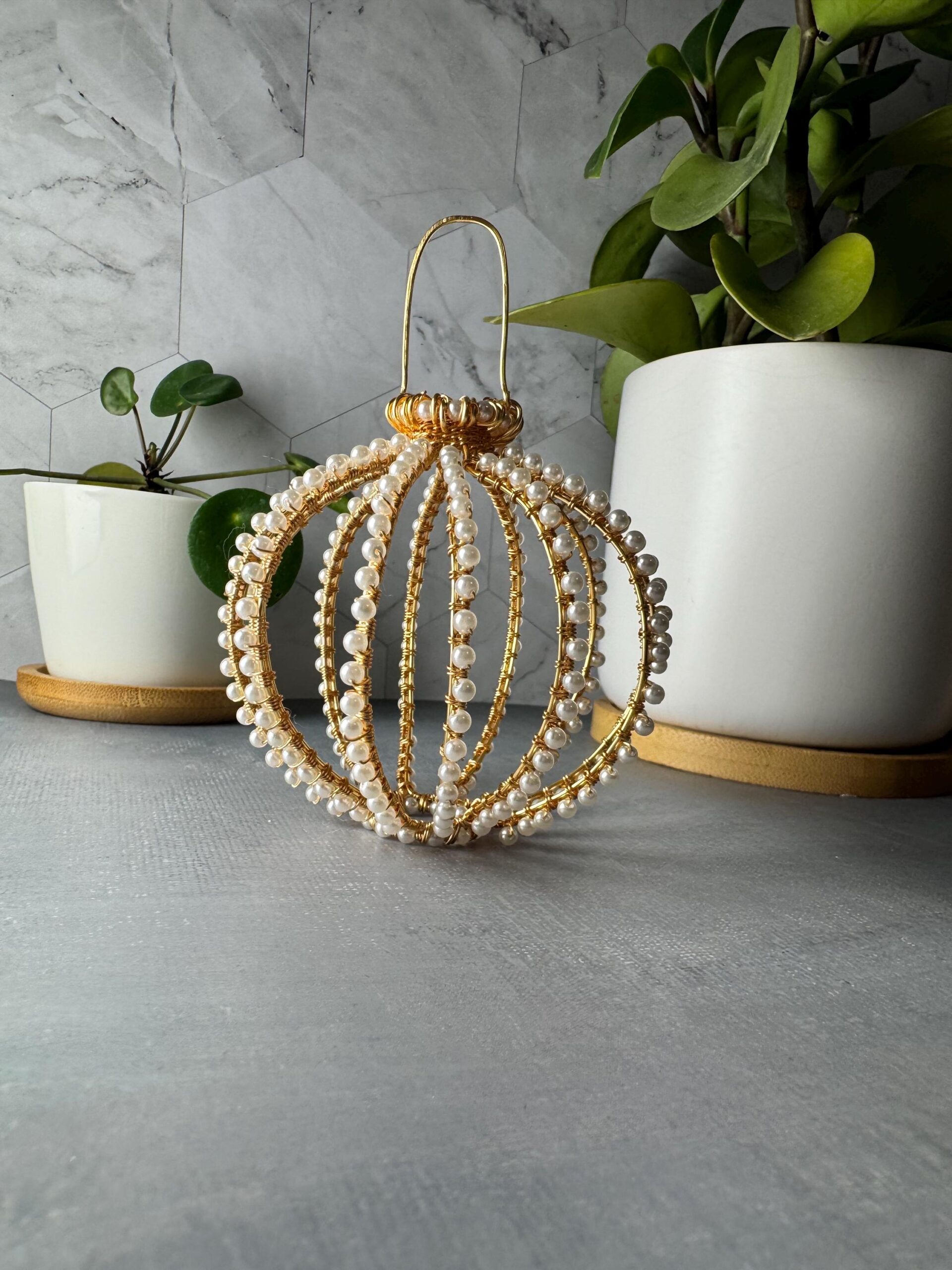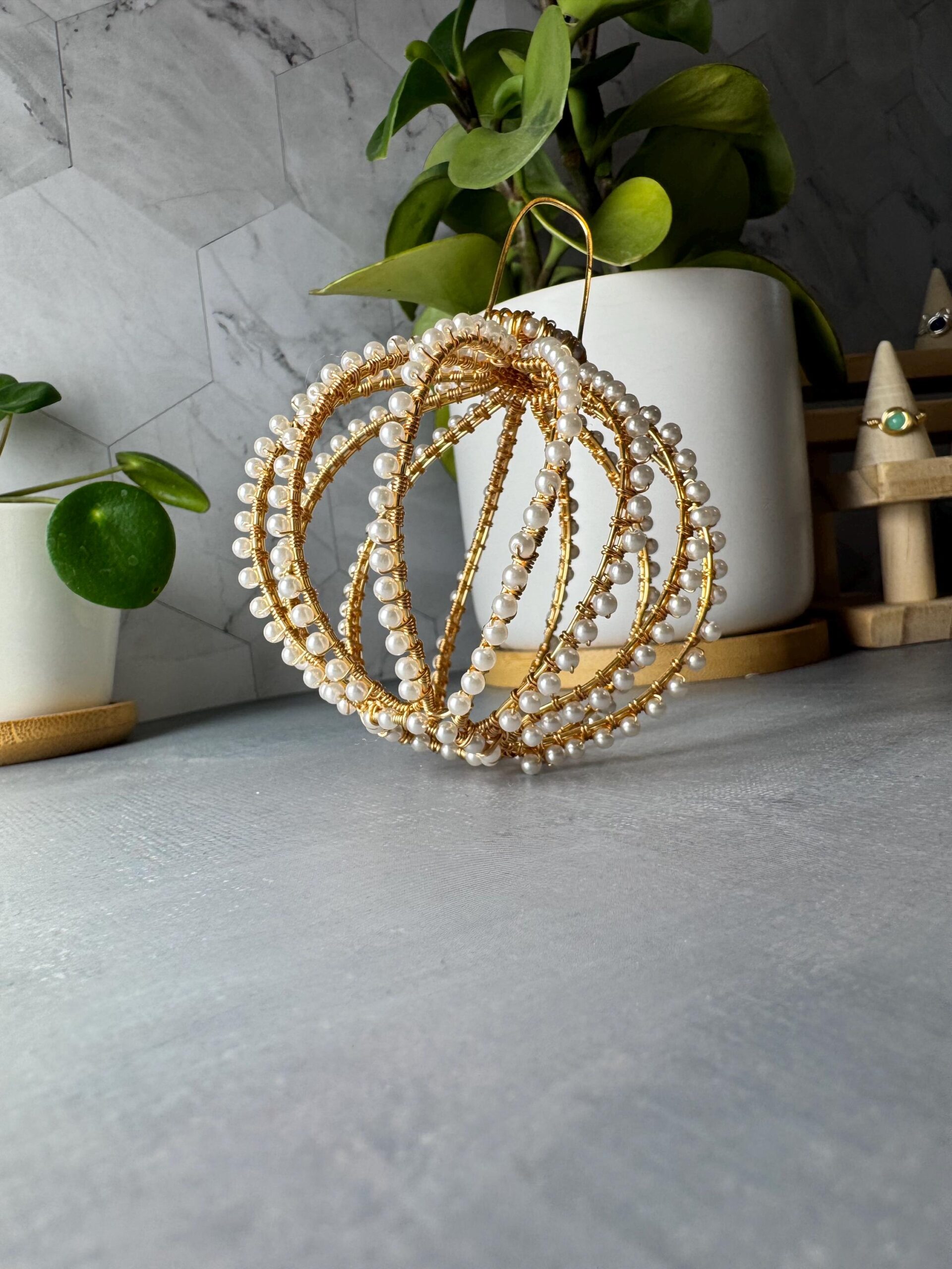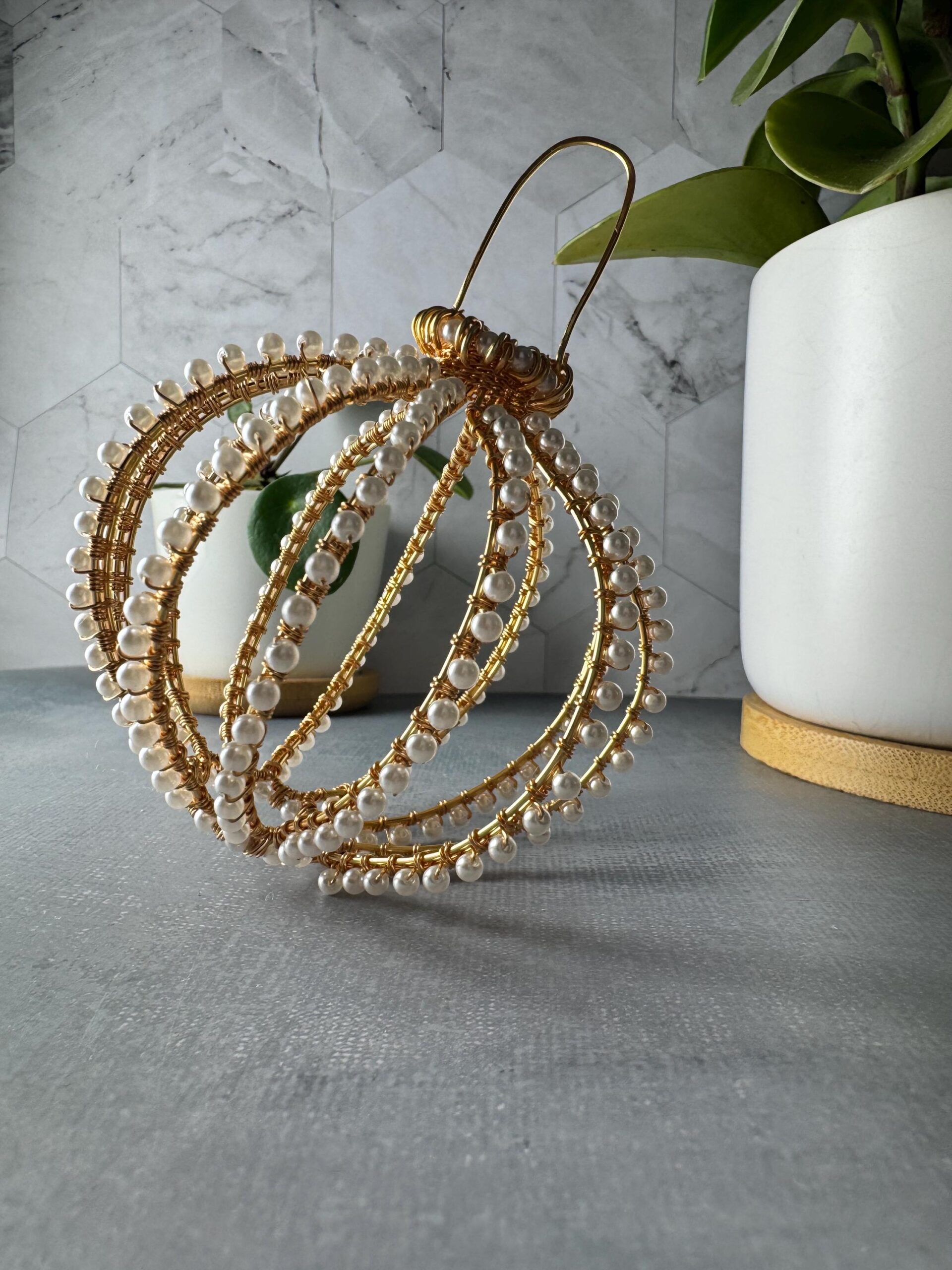 Each sphere is meticulously shaped using gold-plated wire and individually wrapped crystal pearls (Swarovski-style, but not the Swarovski brand). Every rib is formed and beaded by hand, requiring over 12 hours of precision wirework, weaving, and shaping.