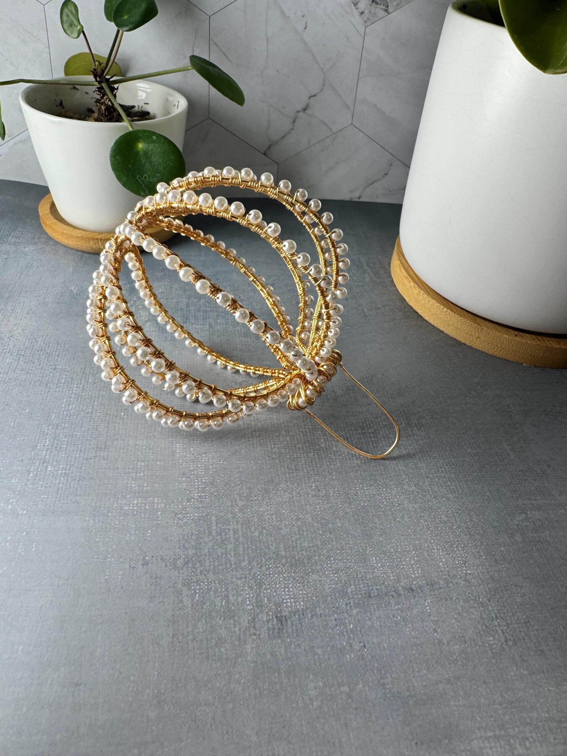 • Materials: Gold plated wire, crystal pearls