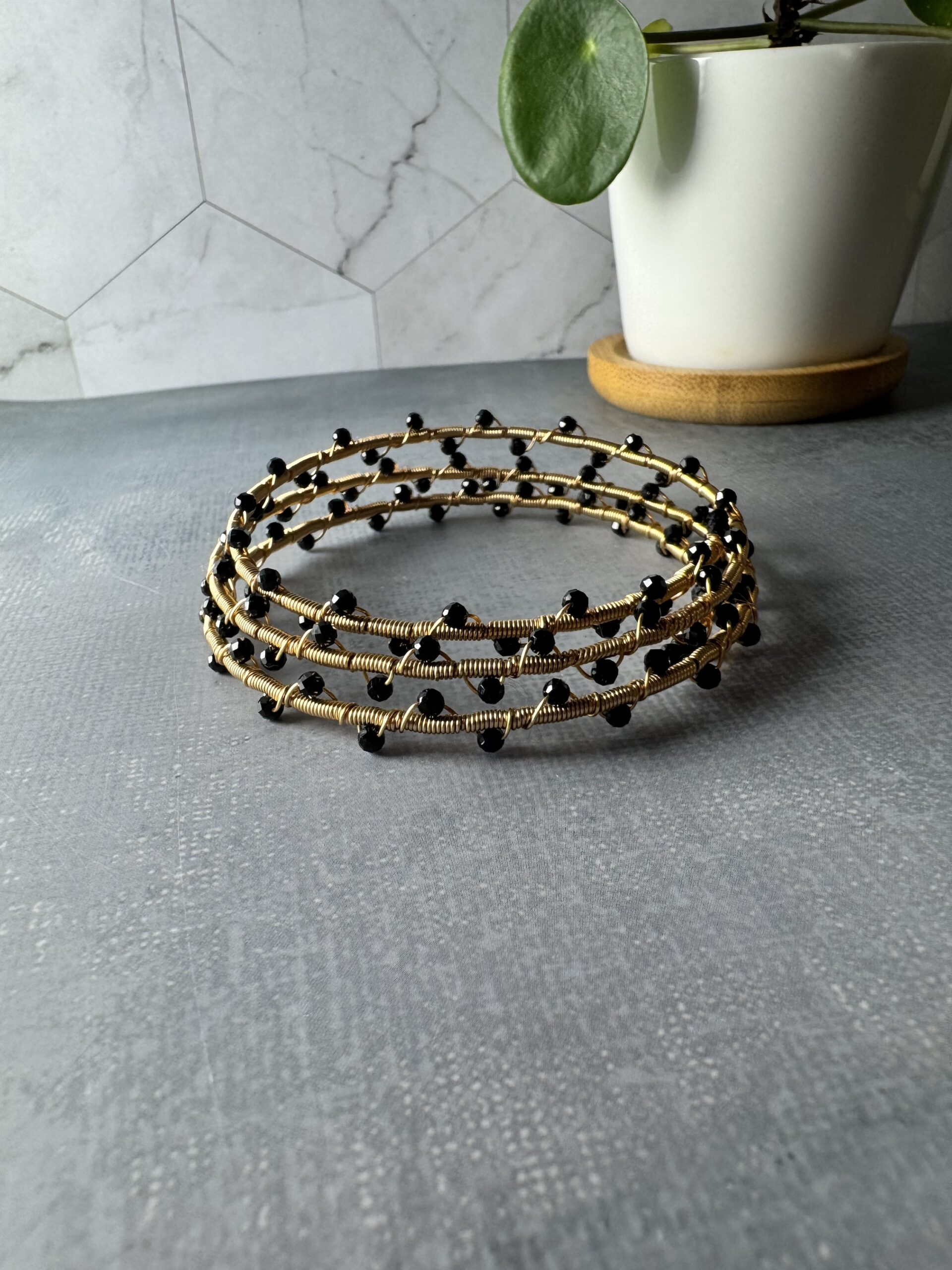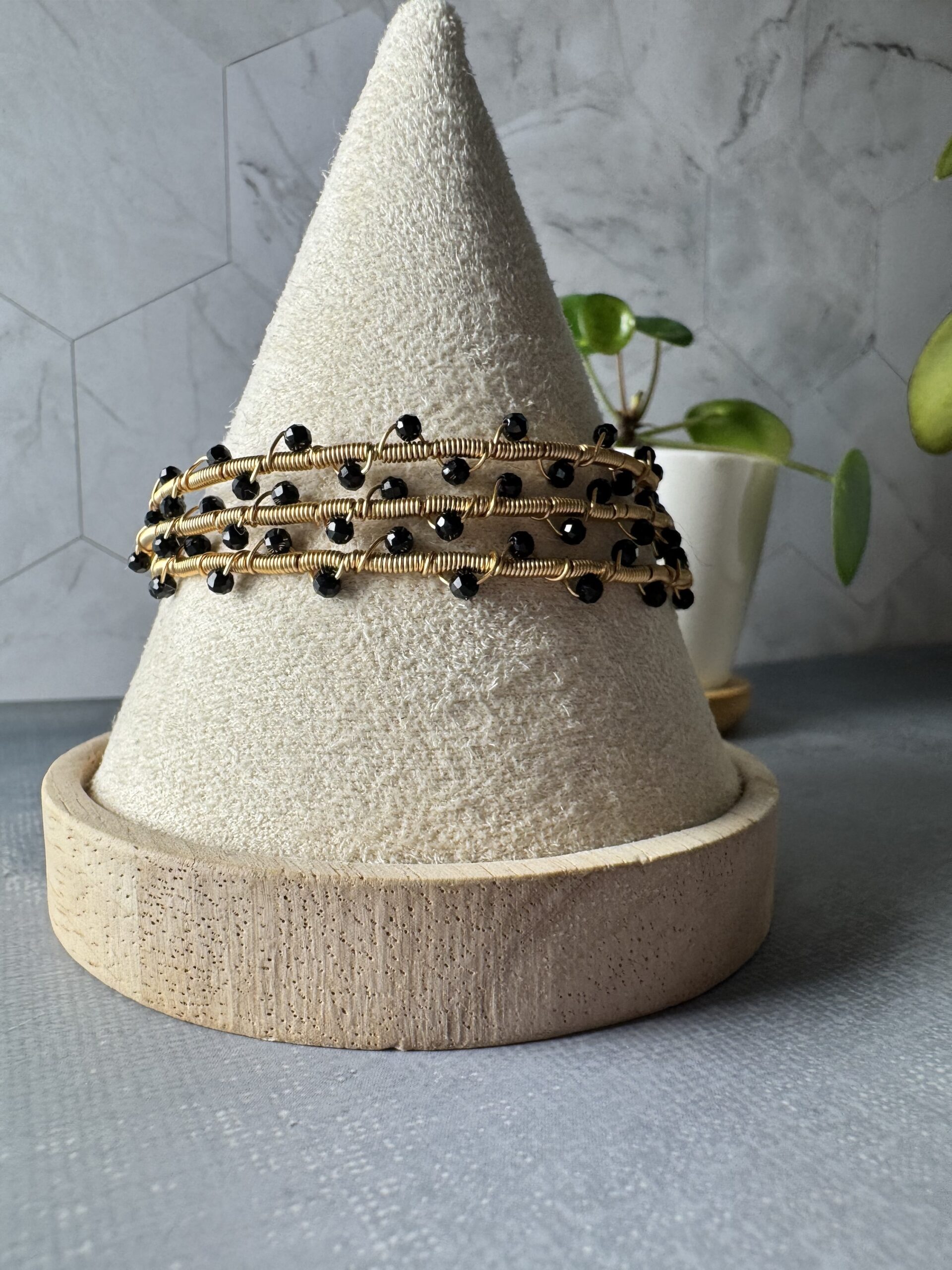 This handcrafted bracelet features sparkling 2mm black spinel gemstones wrapped around a flexible gold-tone memory wire base. Each bead catches the light with a subtle shimmer, giving the piece a chic and refined look.