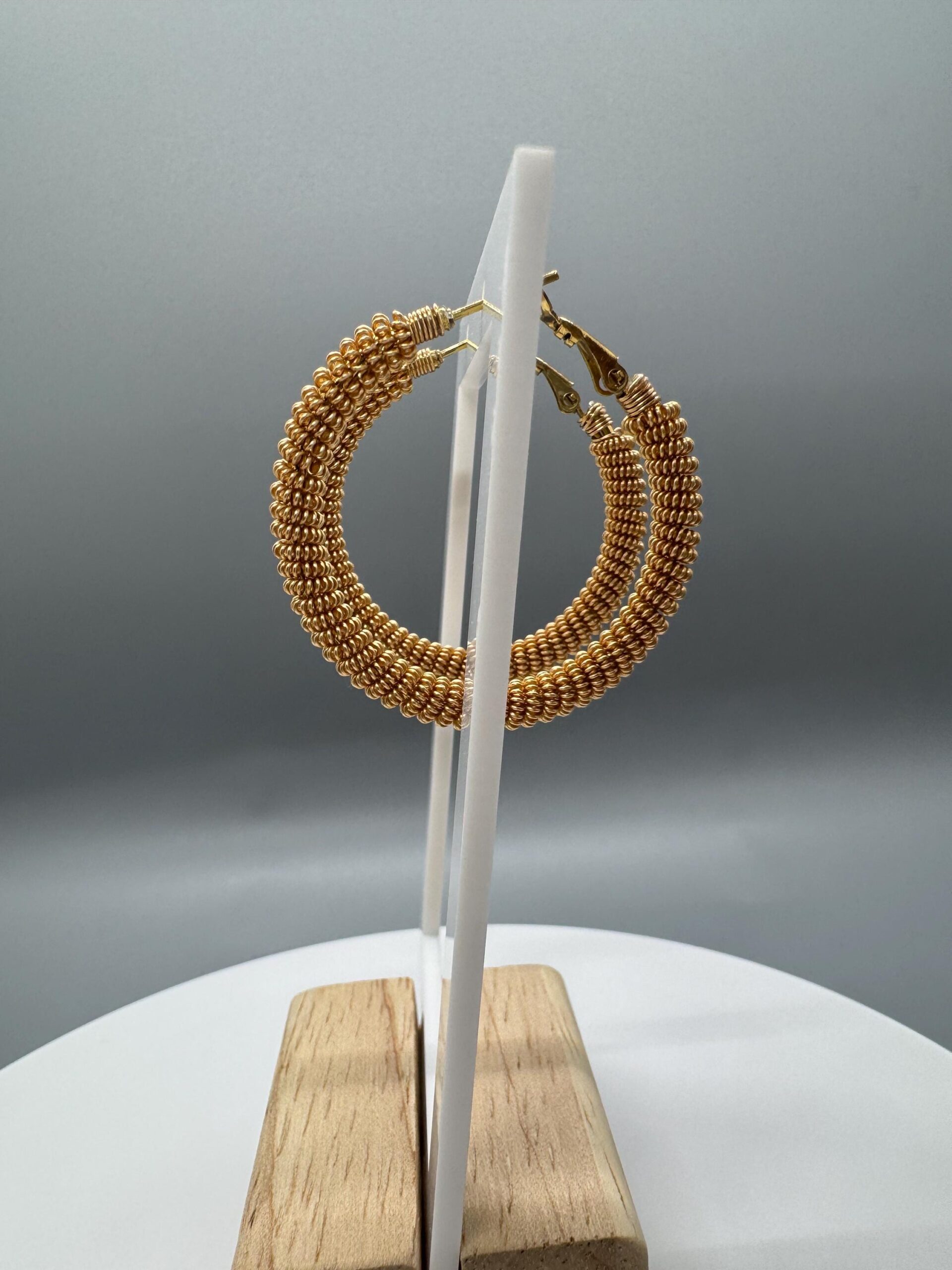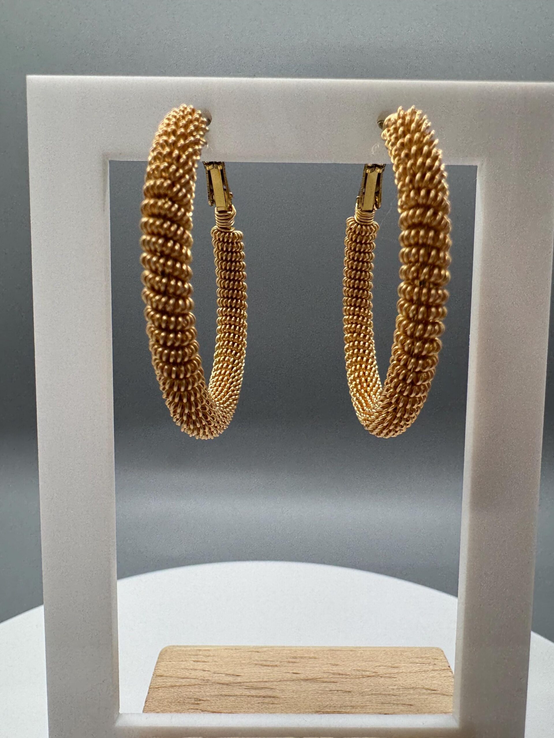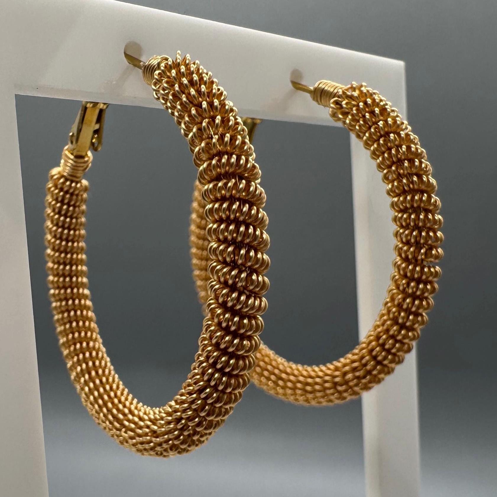The earrings are made with 18k PVD plated stainless steel. The textured on the outside is made with gold platted copper wires.