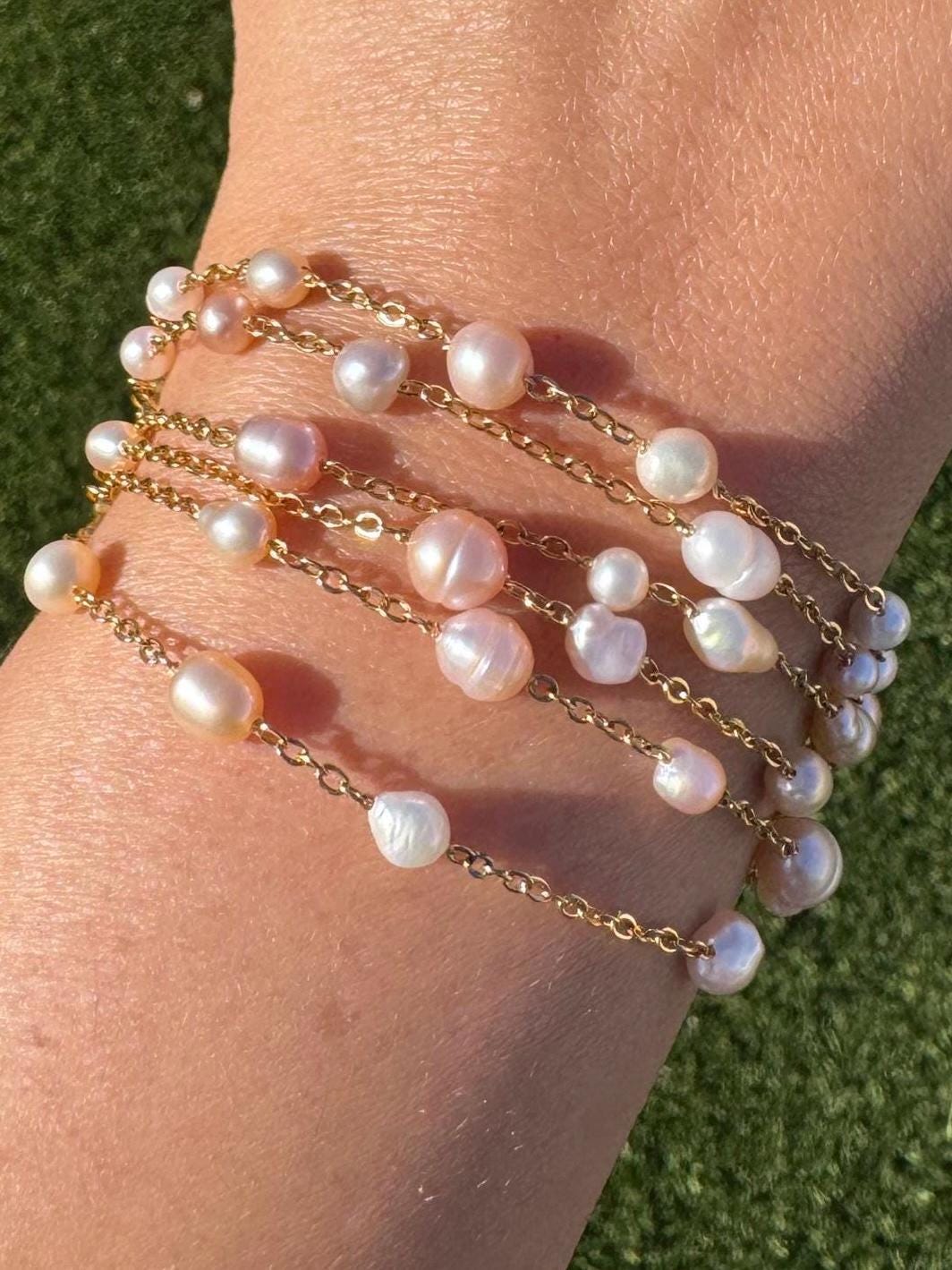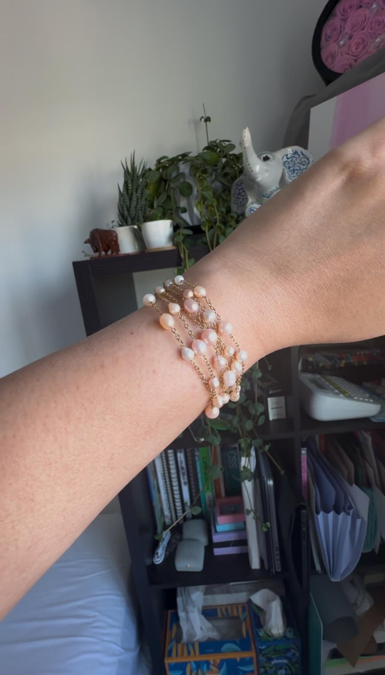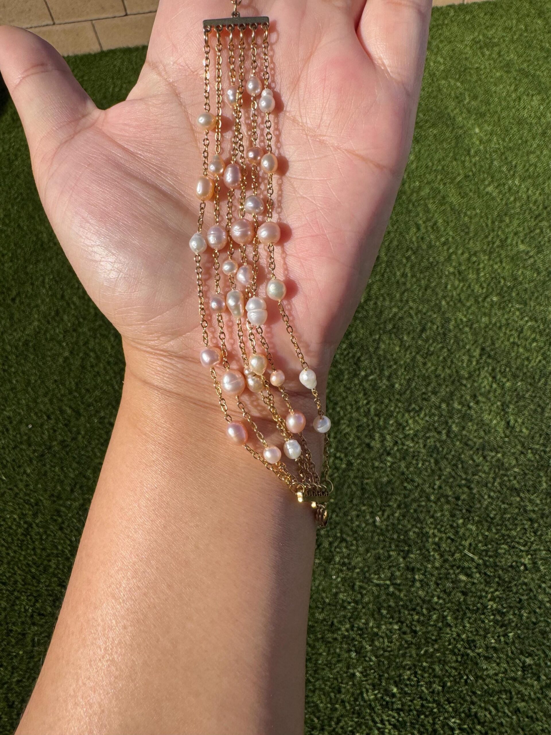 Pink tone baroque freshwater pearls strung together with copper links on six layers of 18K PVD Stainless Steel chains.