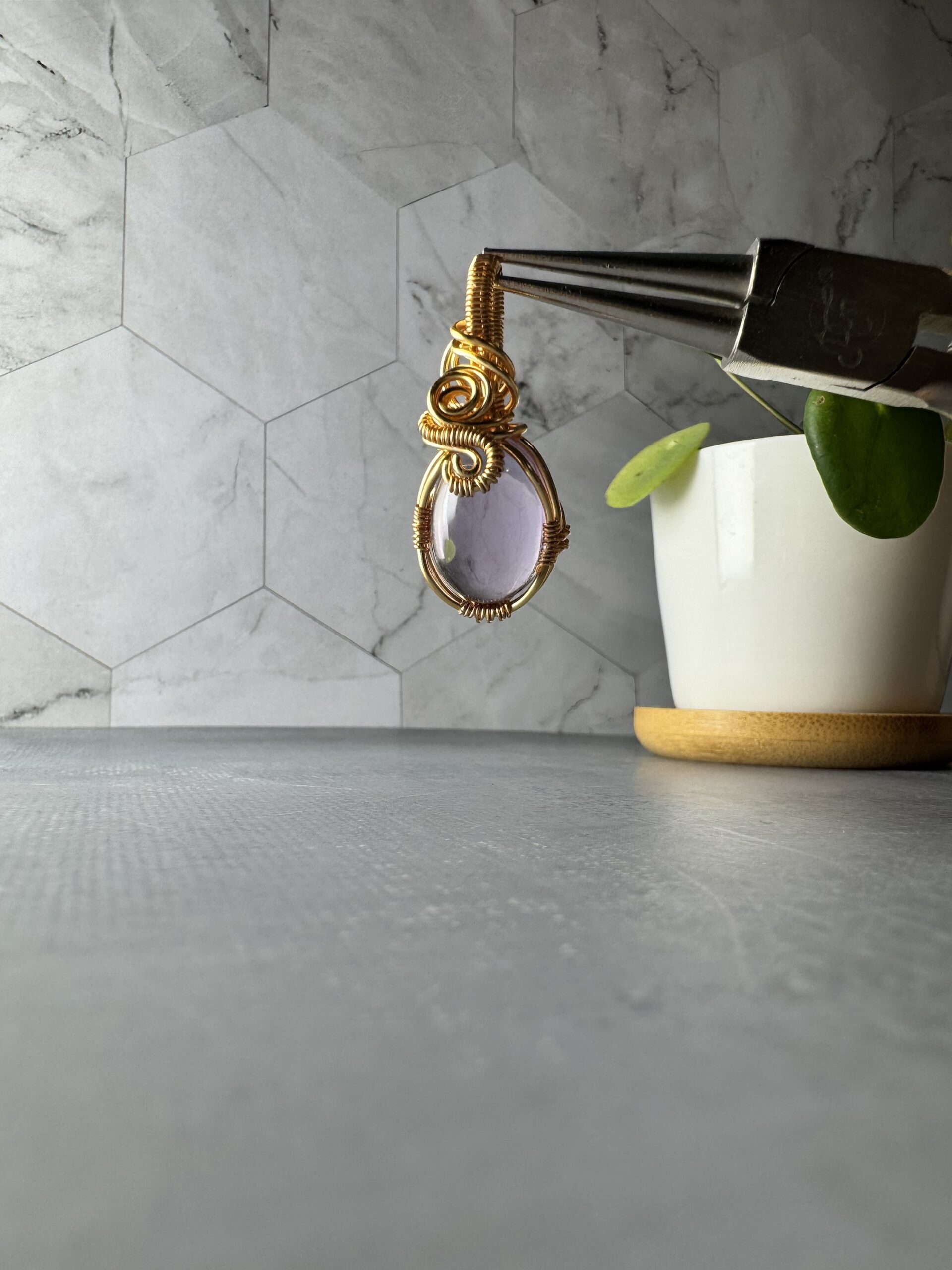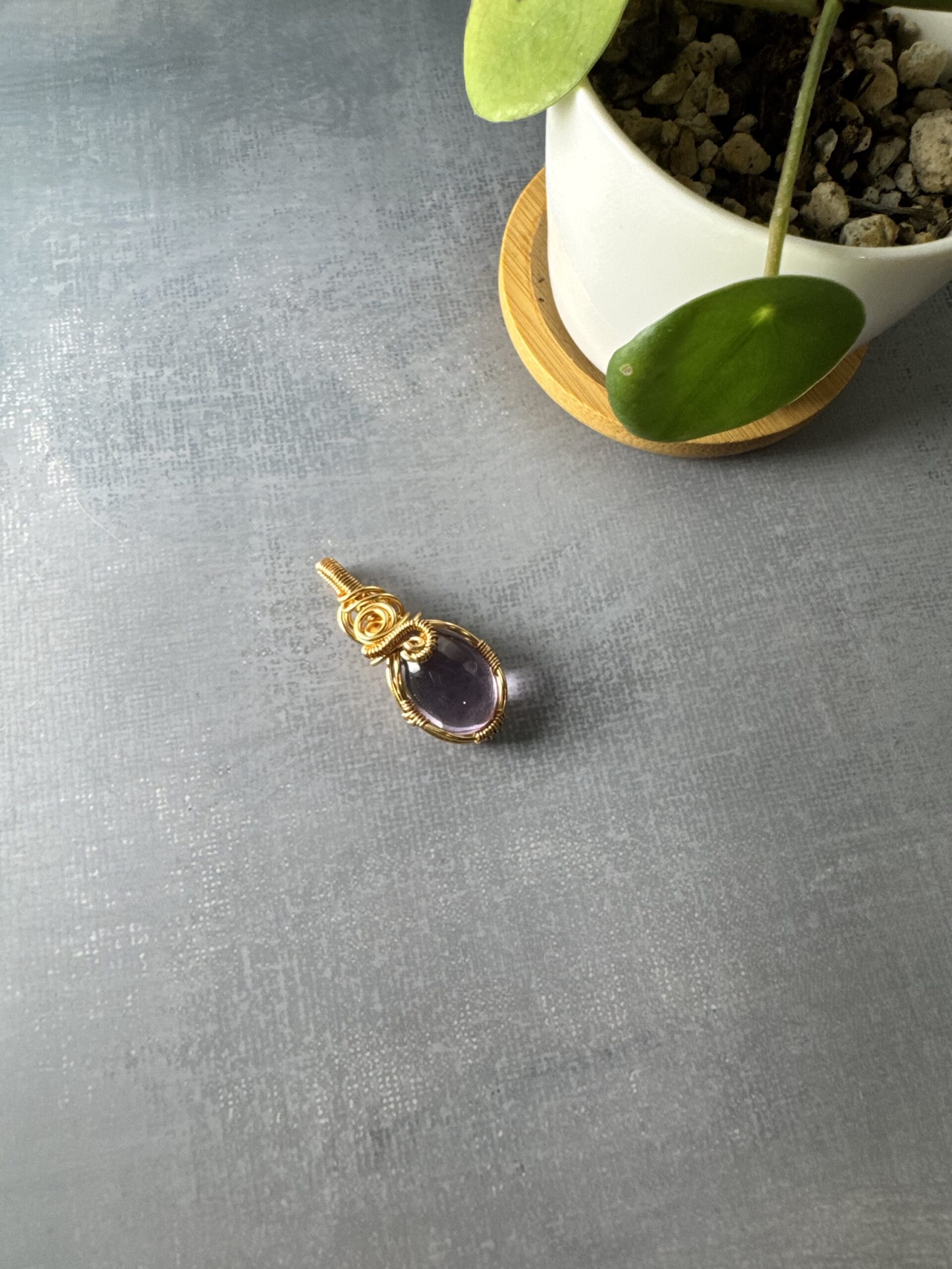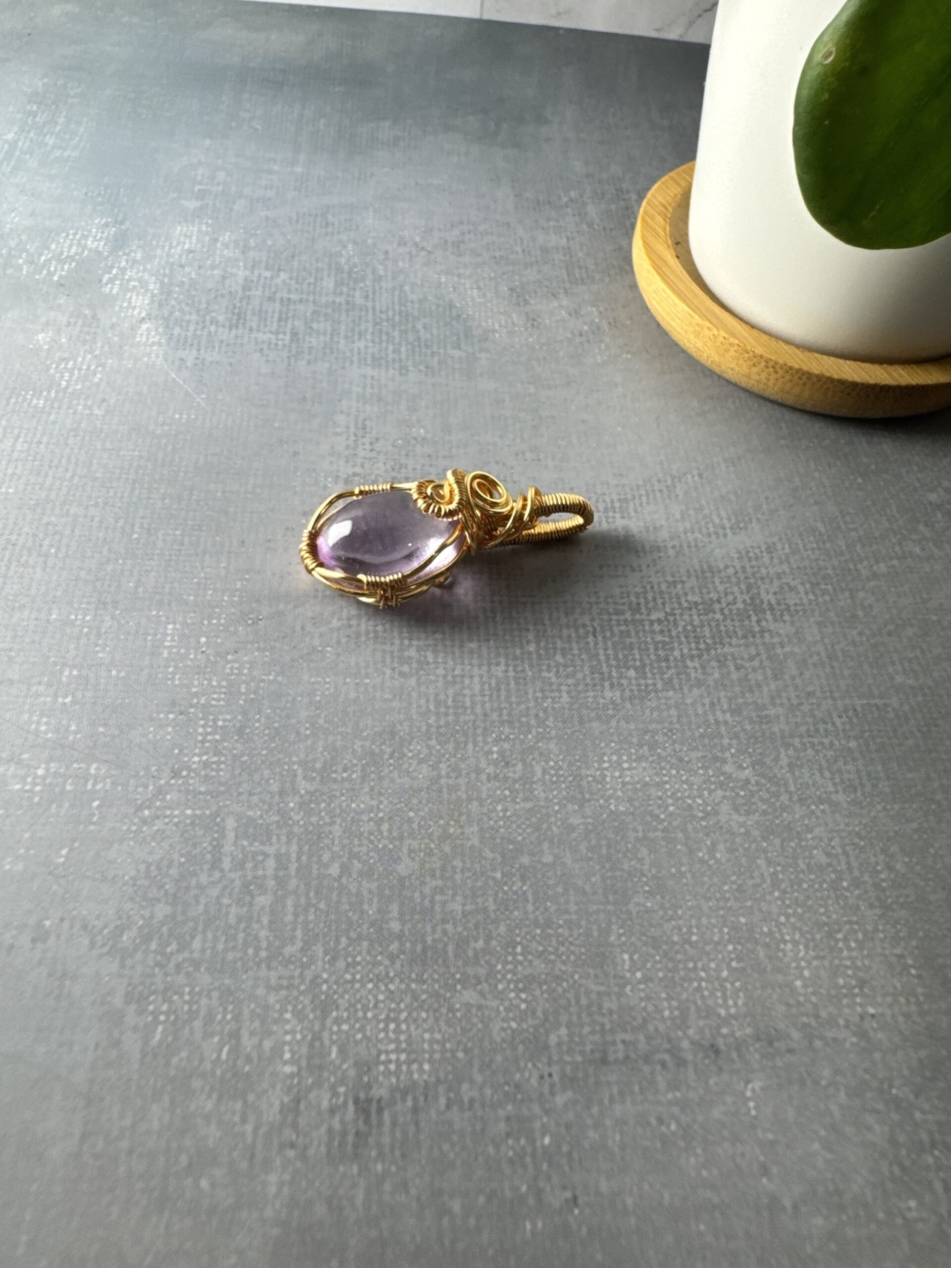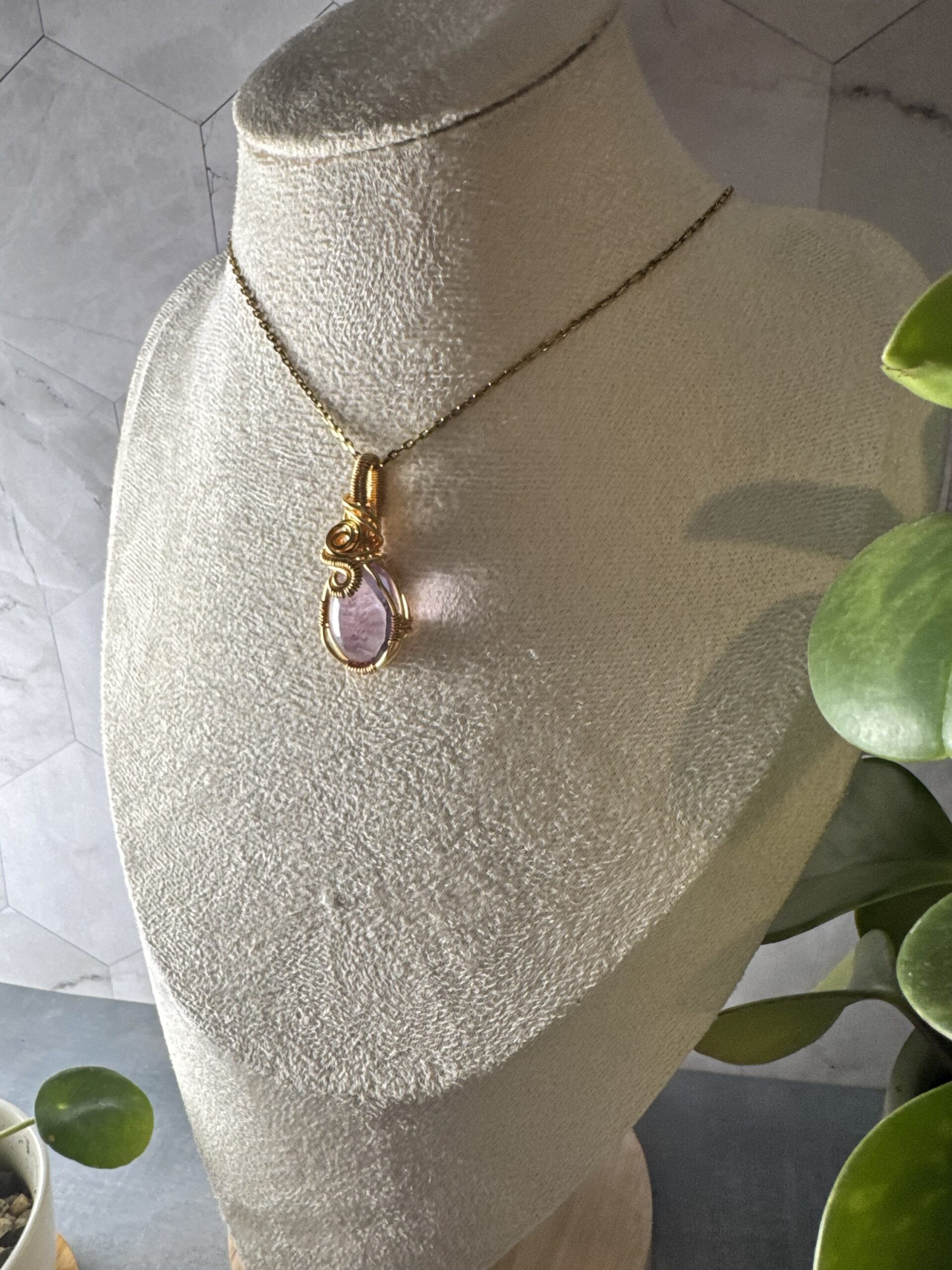 The amethyst is hand-wrapped in gold-plated wire, with intricate coils and swirls that frame the gemstone while adding a touch of artistry. Its design balances delicacy with strength, making it a versatile pendant that can be worn every day or saved for special occasions.