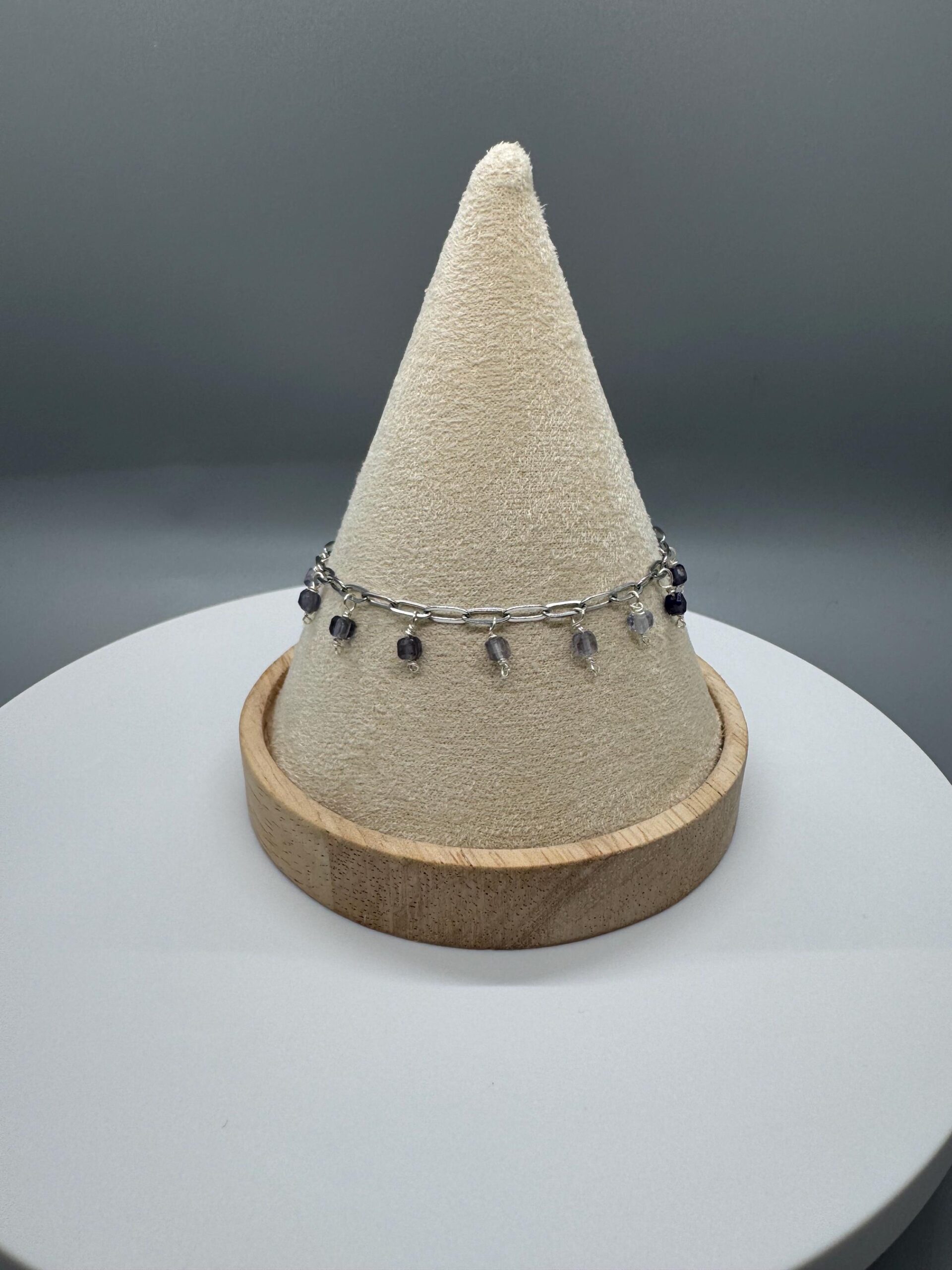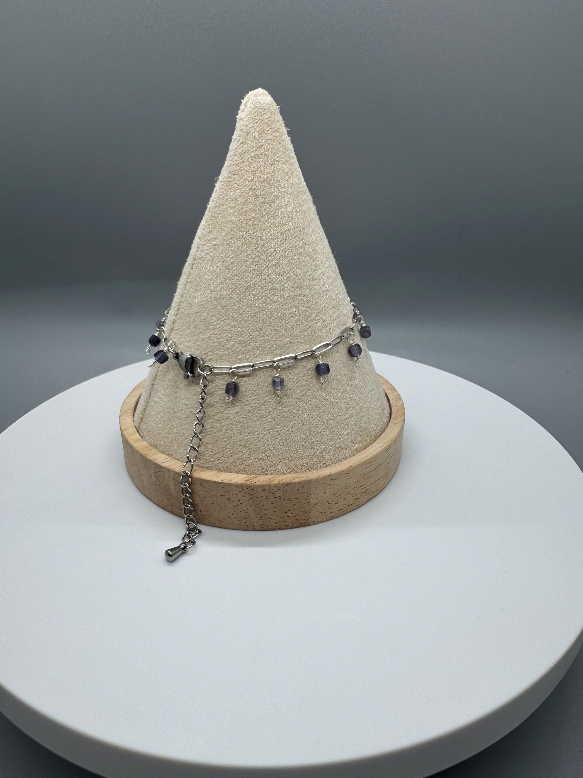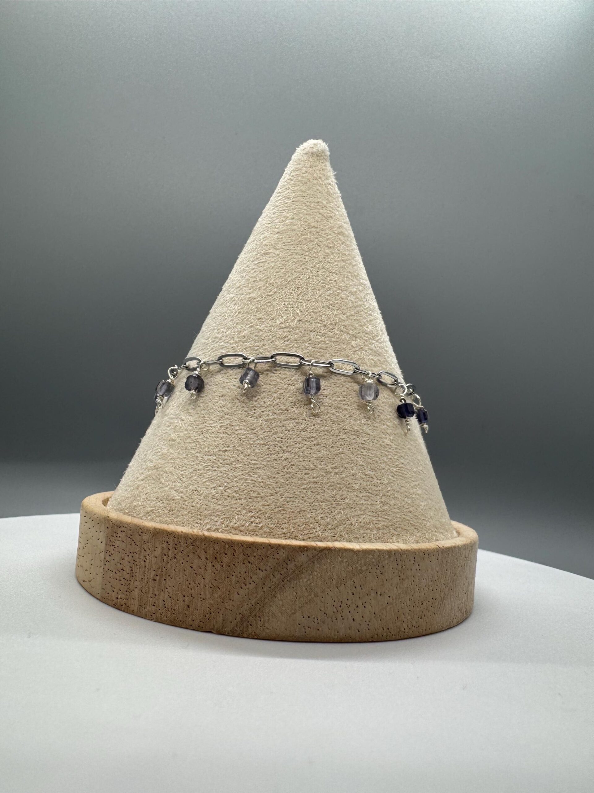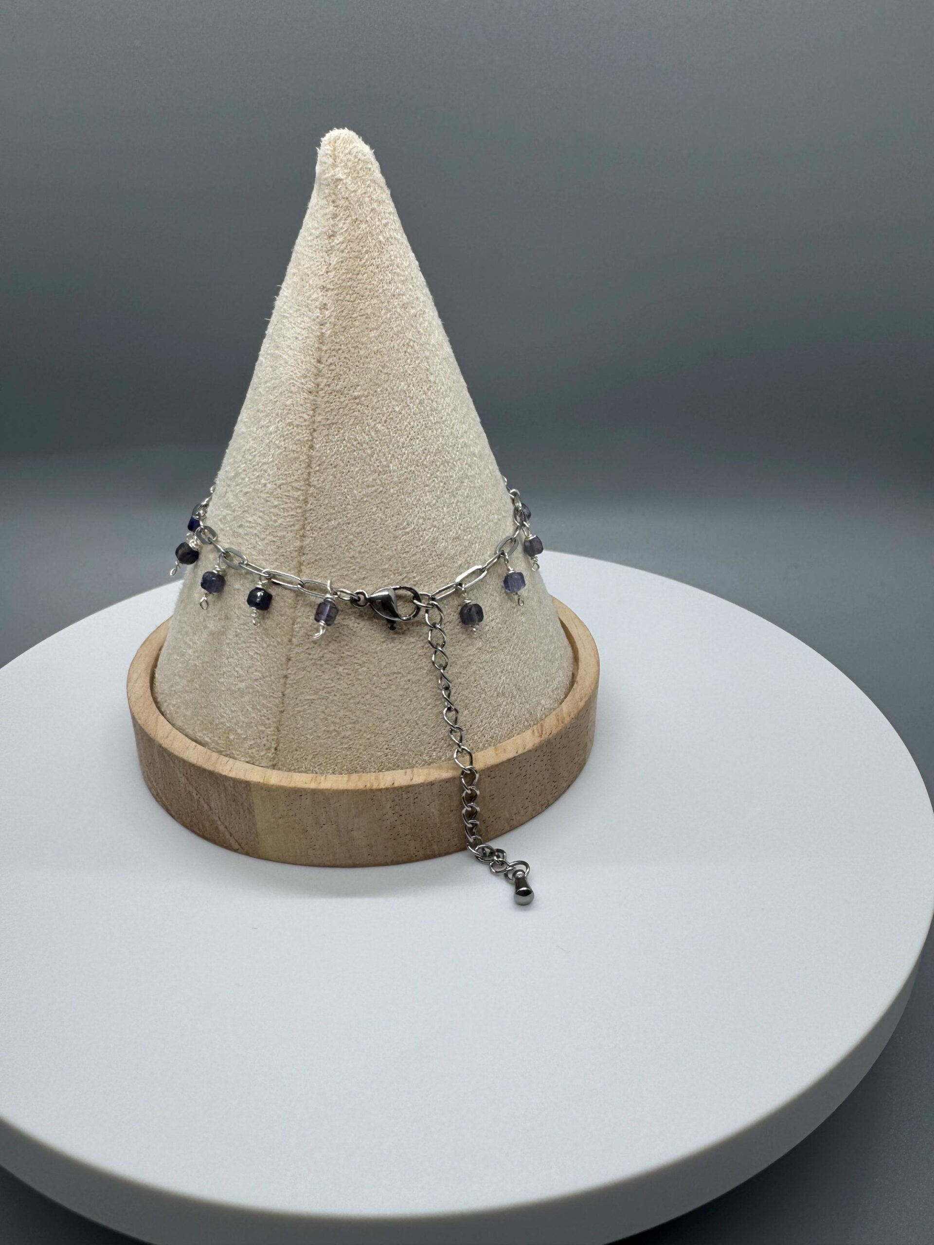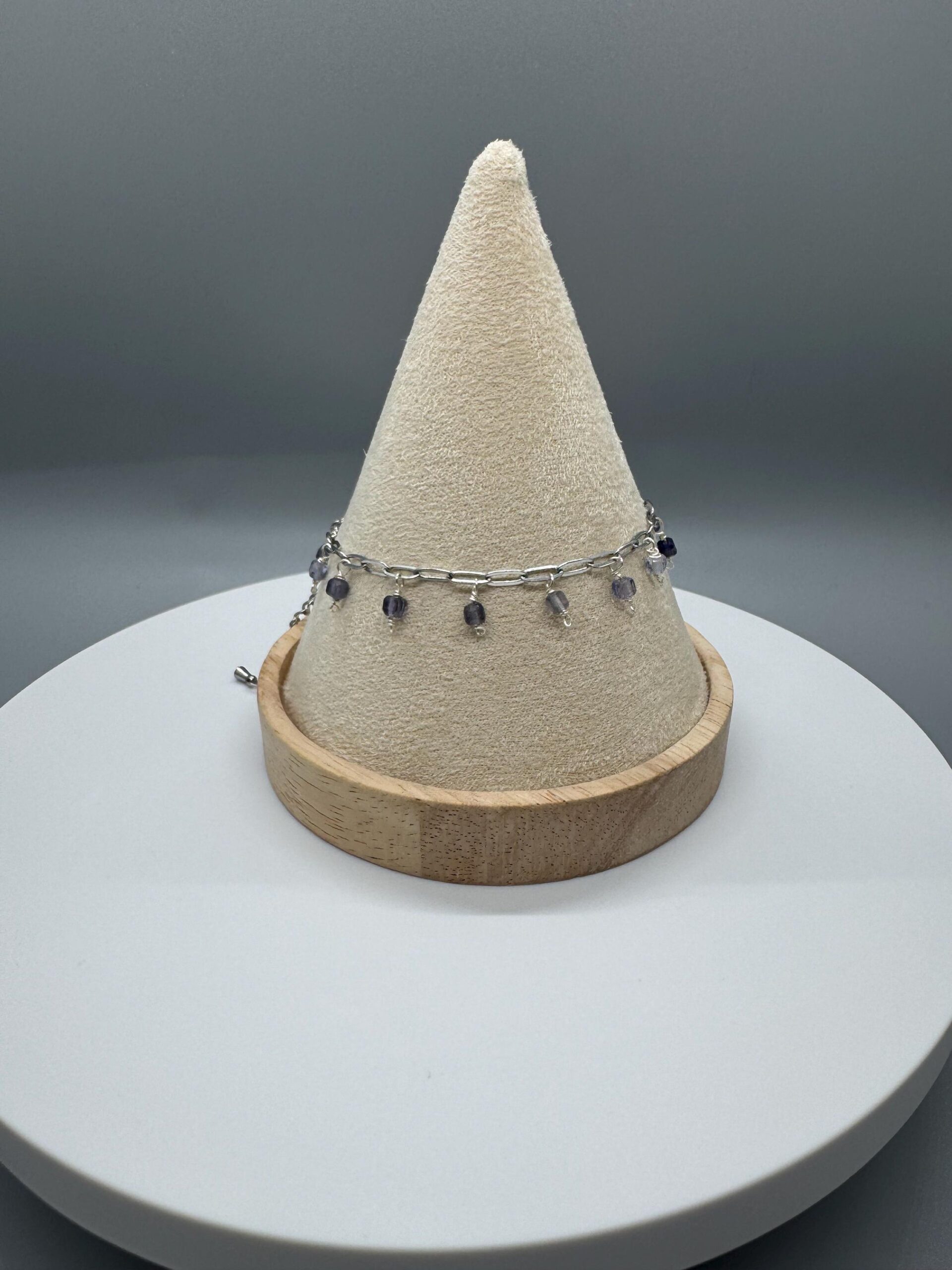 This bracelet is made with Antitarnish stainless steel and has Iolite crystals charms dangle across it using copper wires plated to be silver.