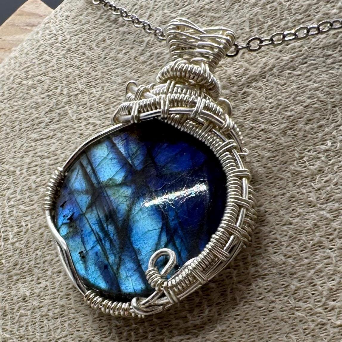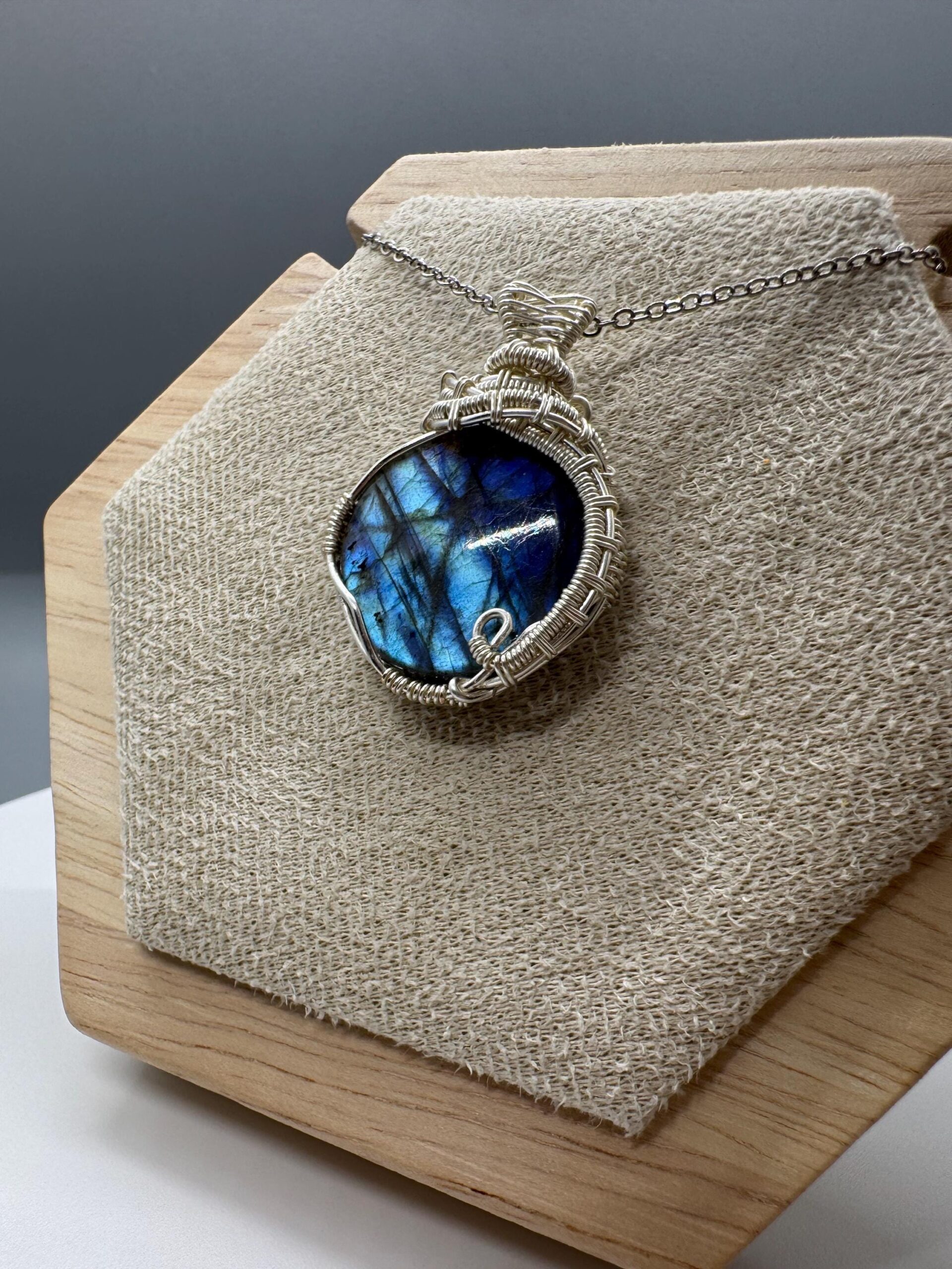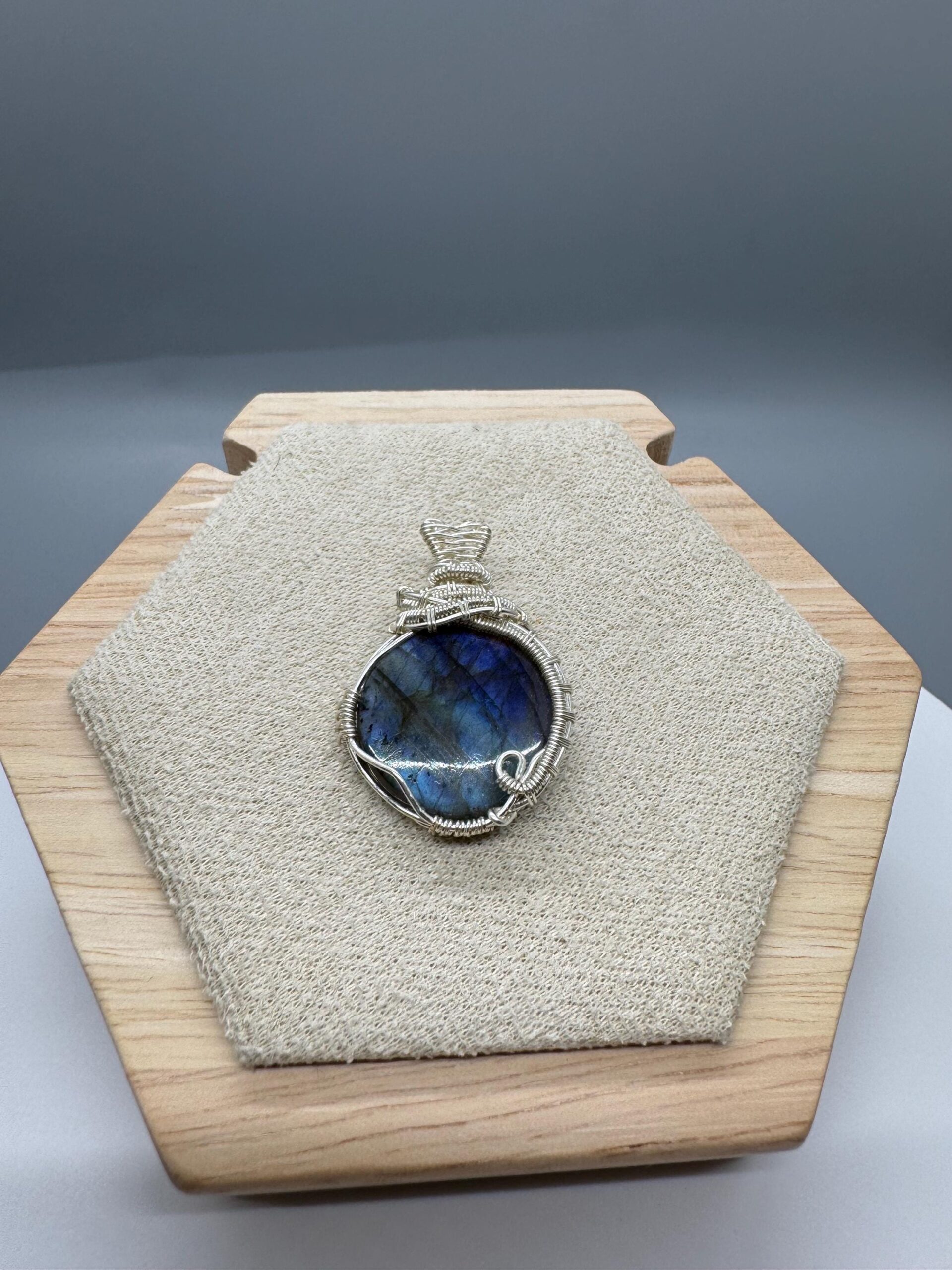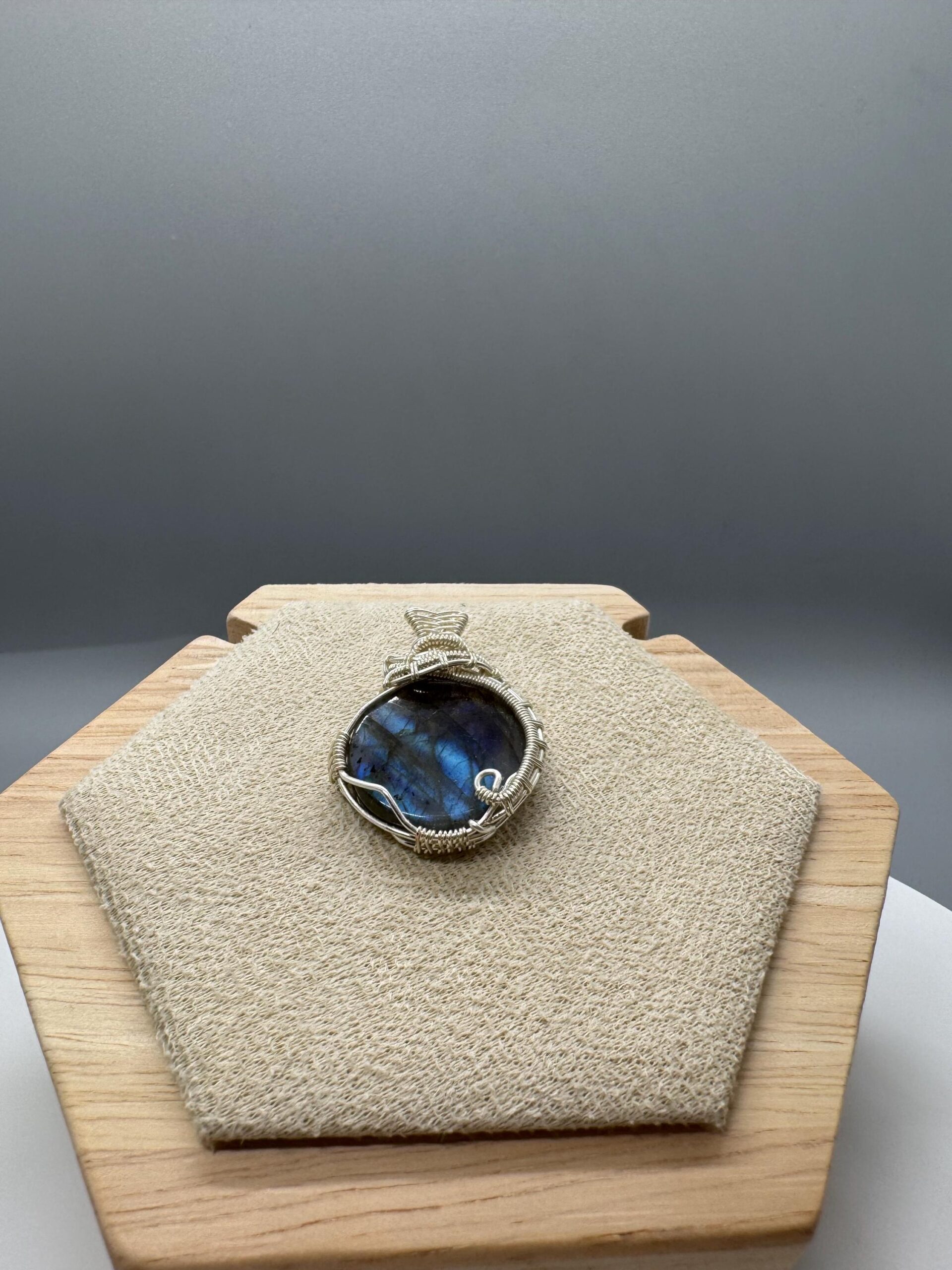 A round labradorite stone wrapped with silver color plated copper wires.