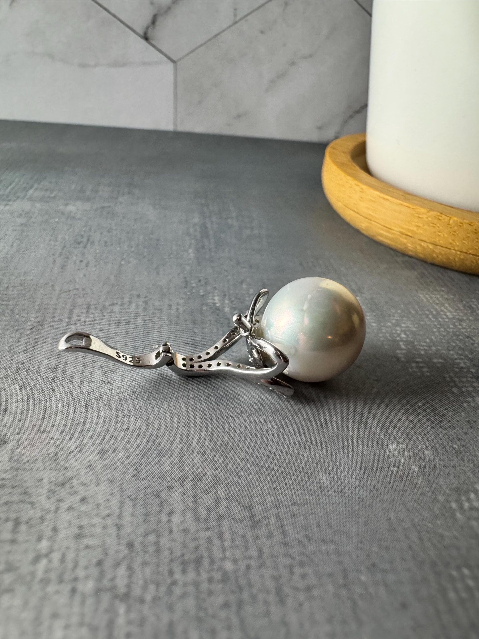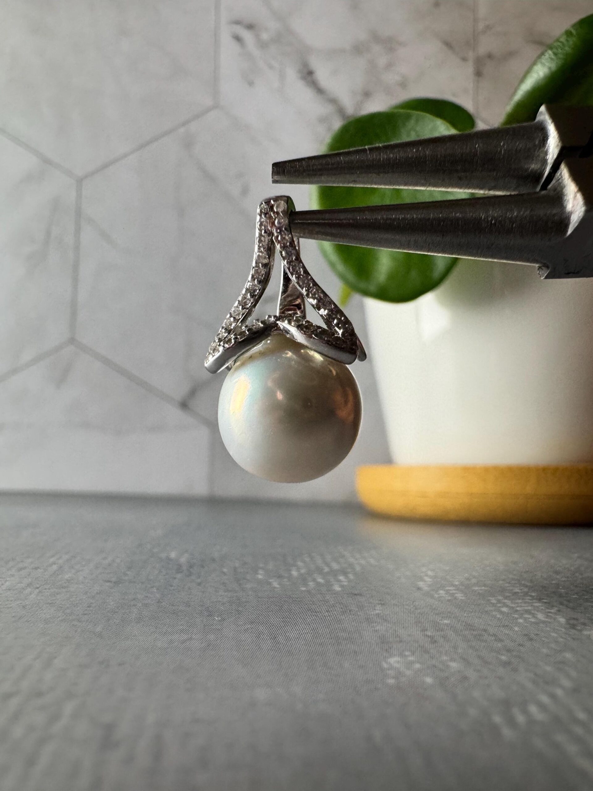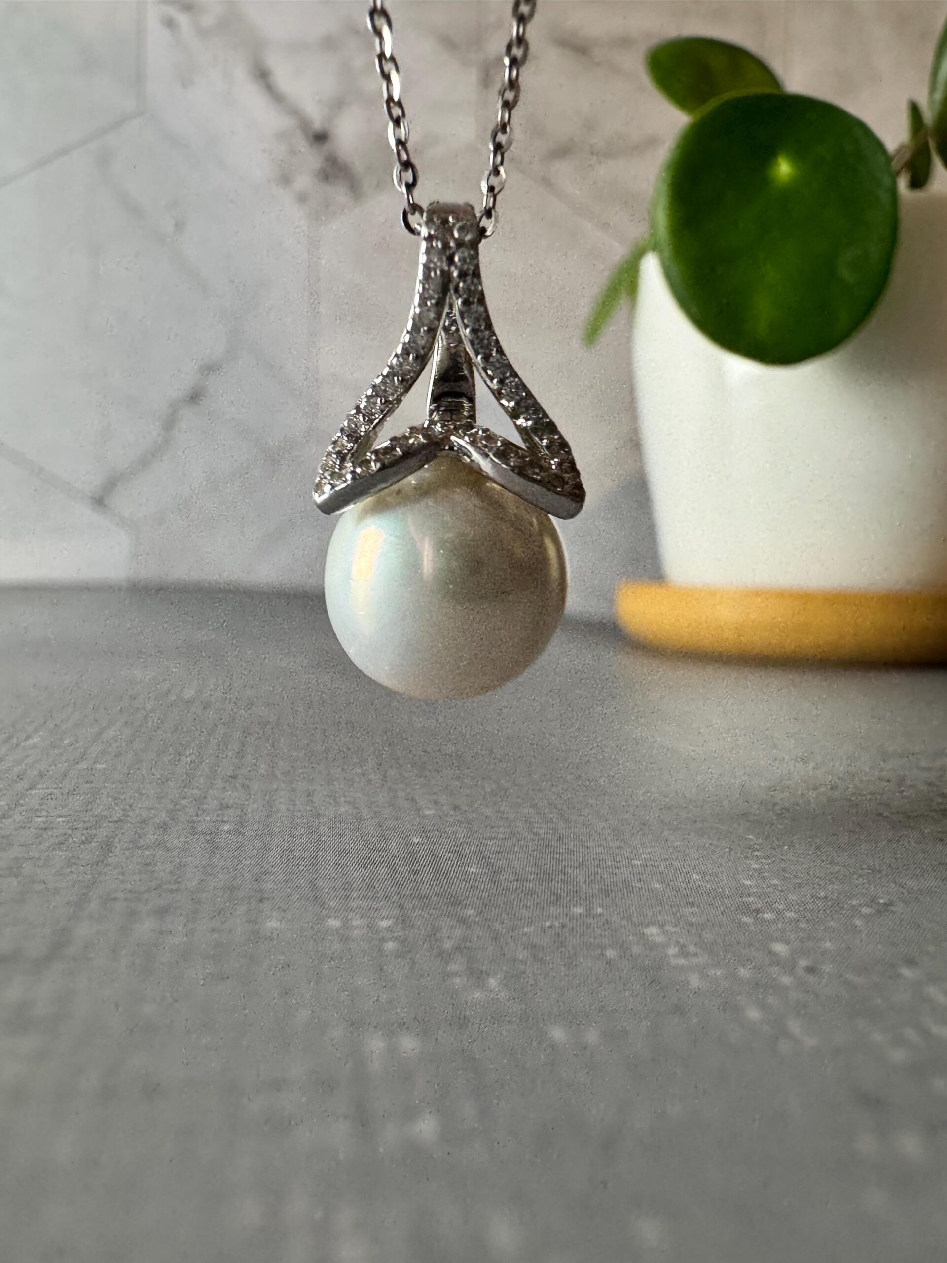This striking mermaid tail pendant features a luminous 11mm white Edison pearl with an incredibly intense, metallic luster. The silvery mirror-like tone of the pearl catches light beautifully, making it a captivating statement piece. The pendant is shaped like an elegant mermaid tail, with pavé-set details that shimmer subtly against the gleaming pearl.