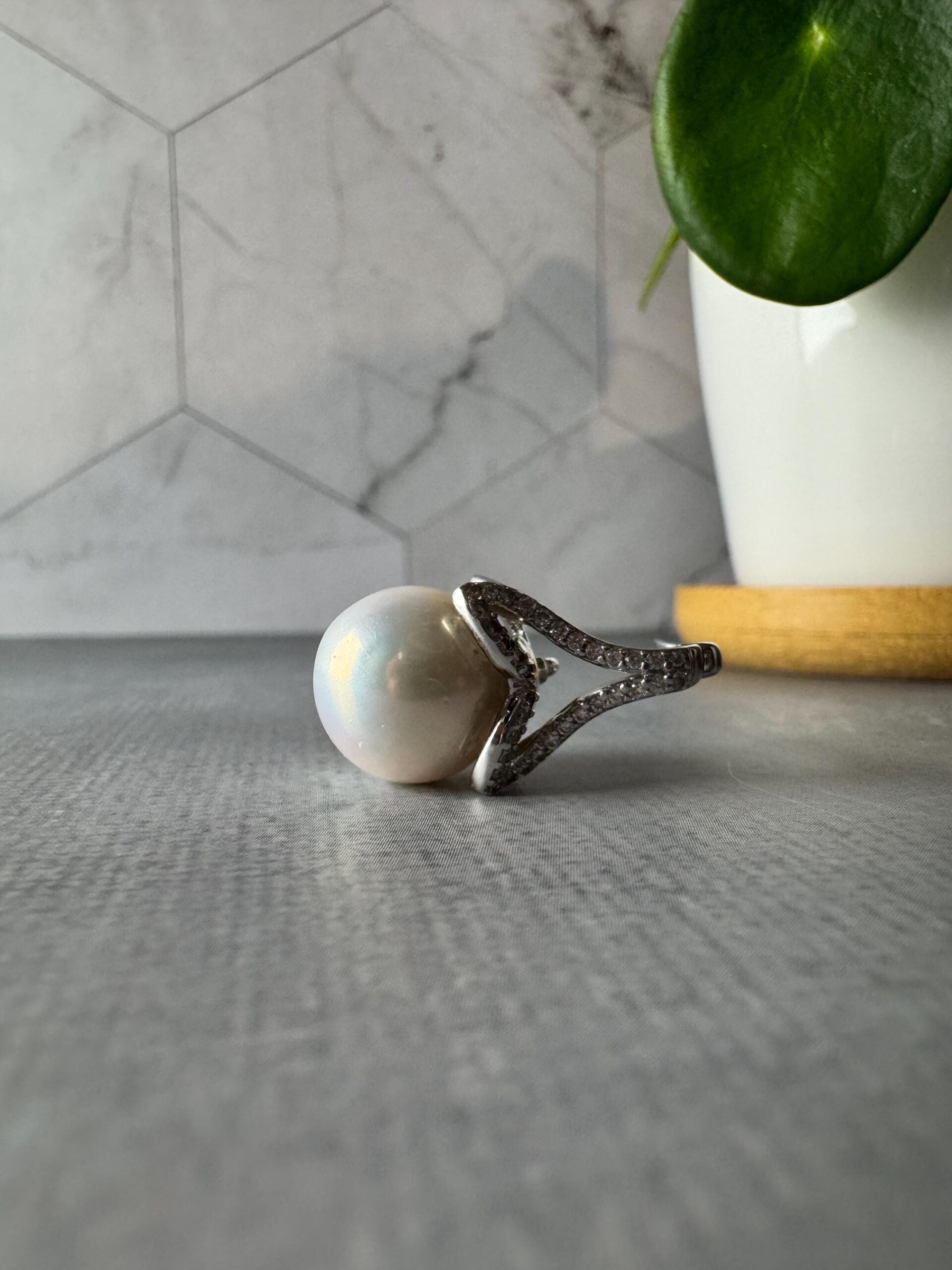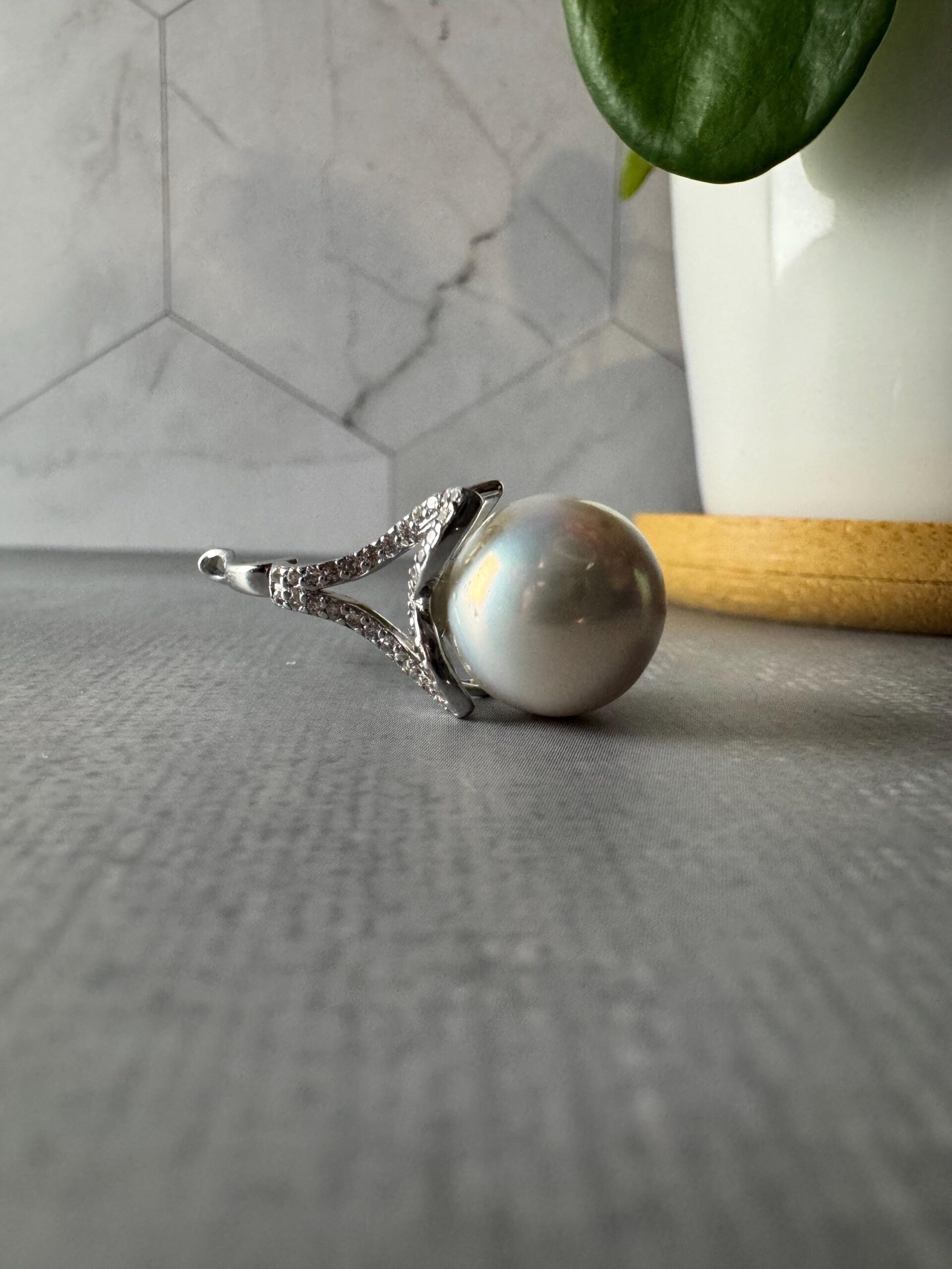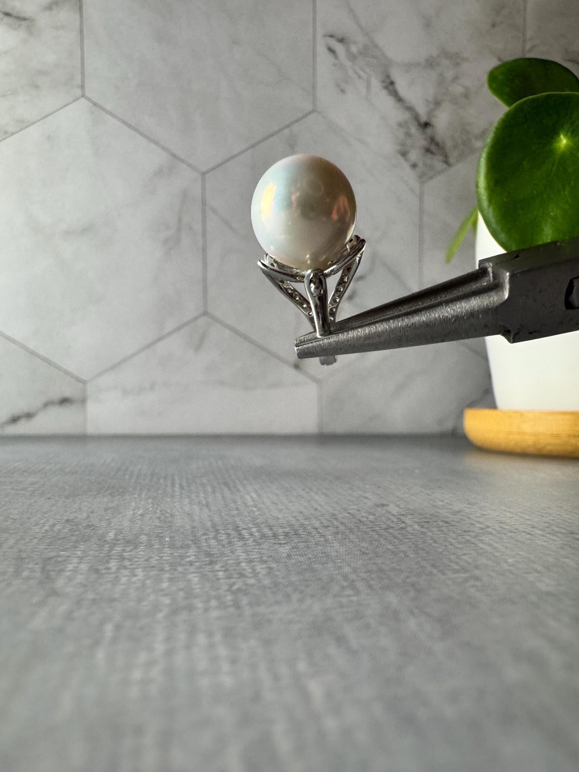 This striking mermaid tail pendant features a luminous 11mm white Edison pearl with an incredibly intense, metallic luster. The silvery mirror-like tone of the pearl catches light beautifully, making it a captivating statement piece. The pendant is shaped like an elegant mermaid tail, with pavé-set details that shimmer subtly against the gleaming pearl.