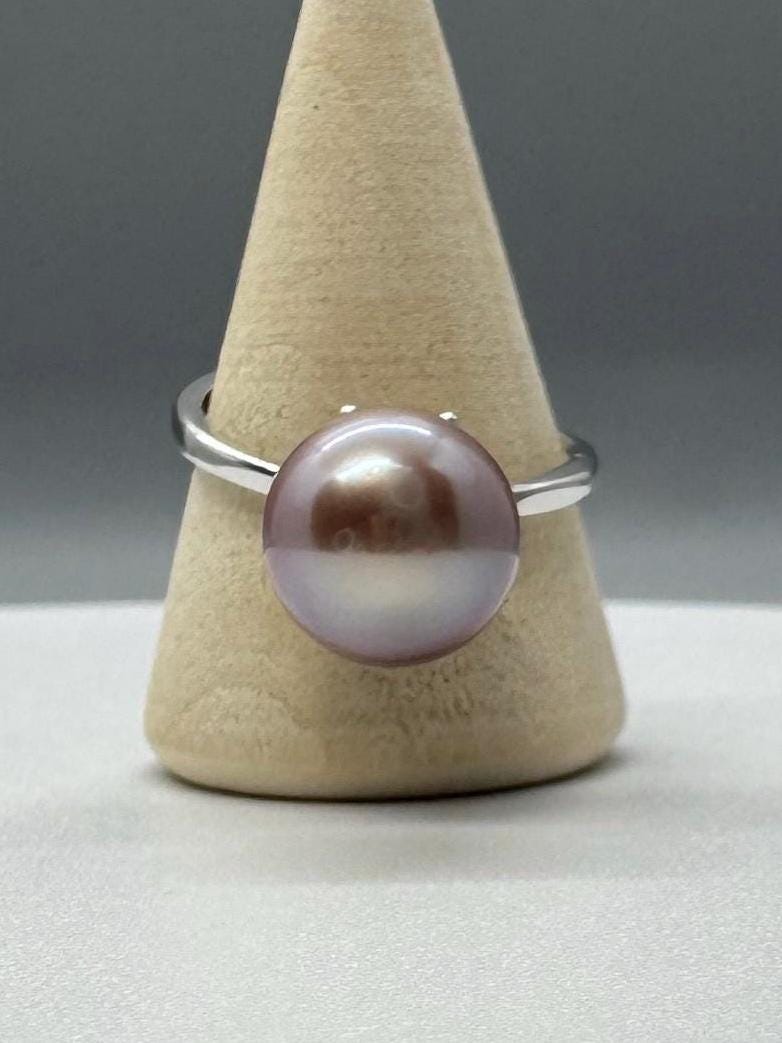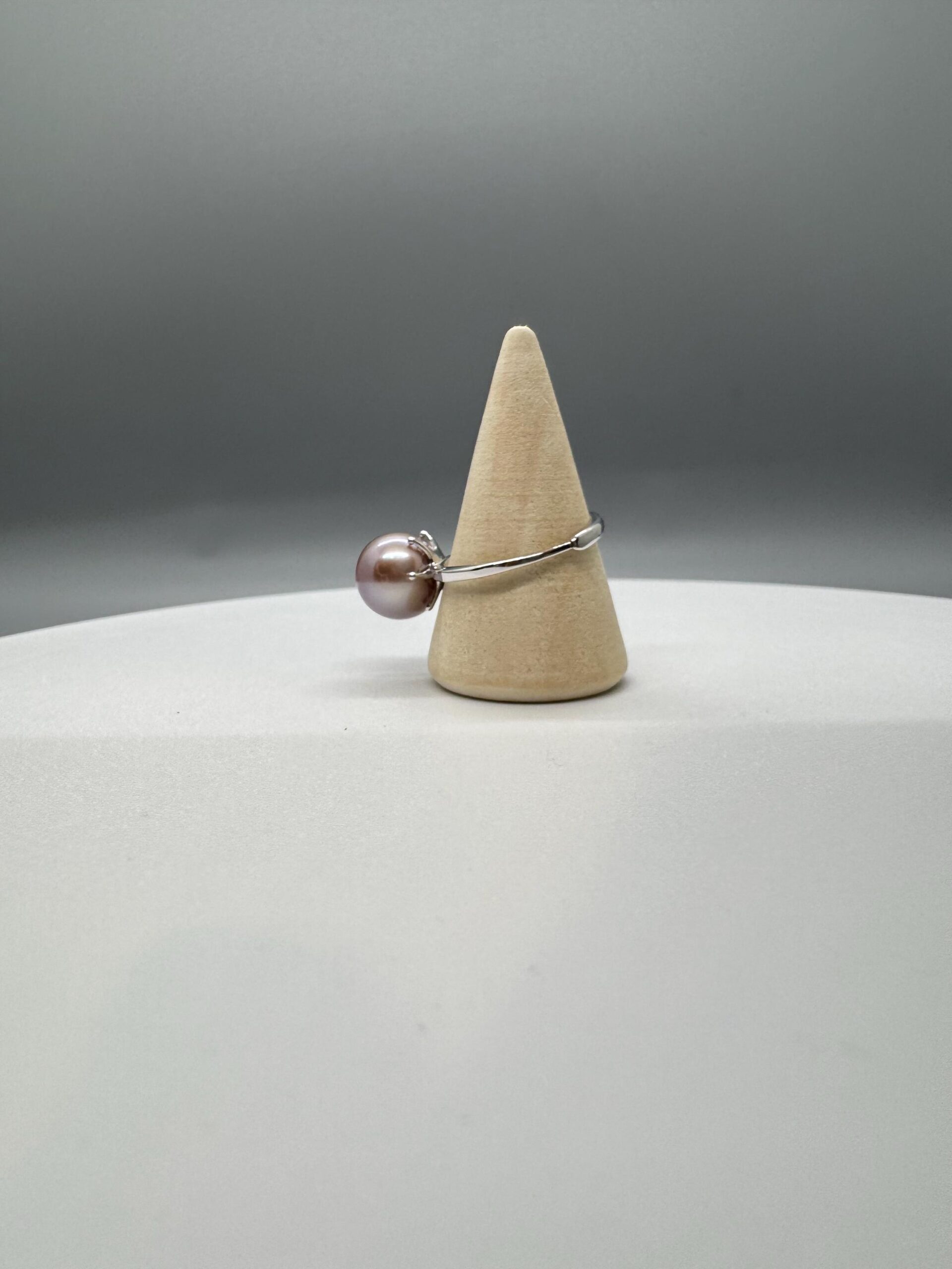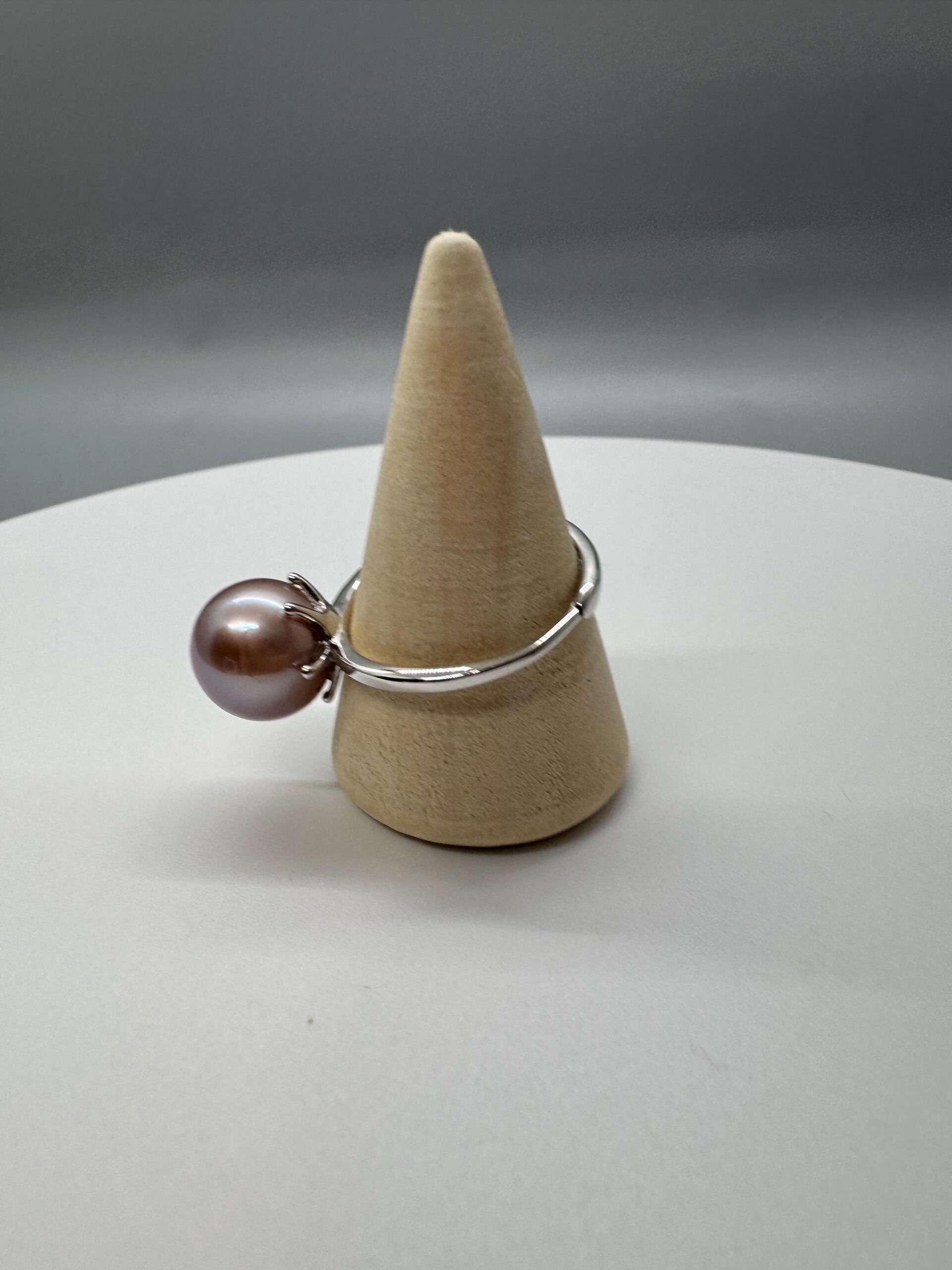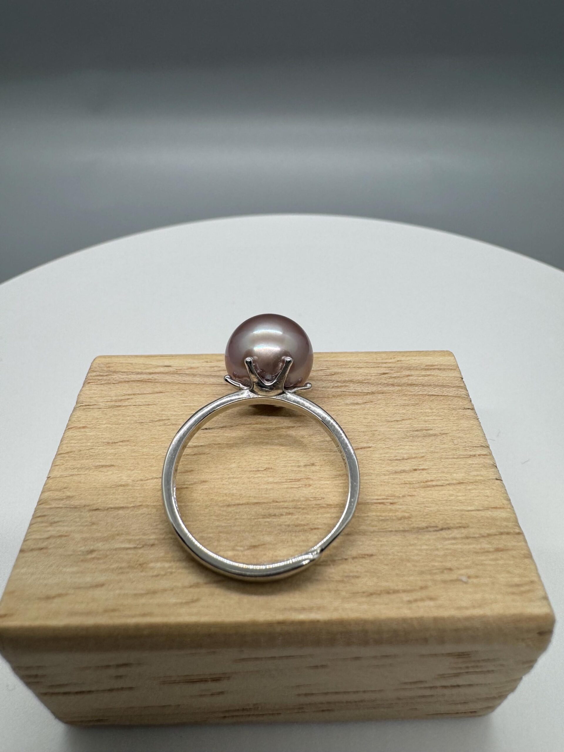 This ring is made of S925 sterling silver. It has a Deep Purple freshwater pearl mount it in the middle. The setting looks like a flower with the pearl in the middle.