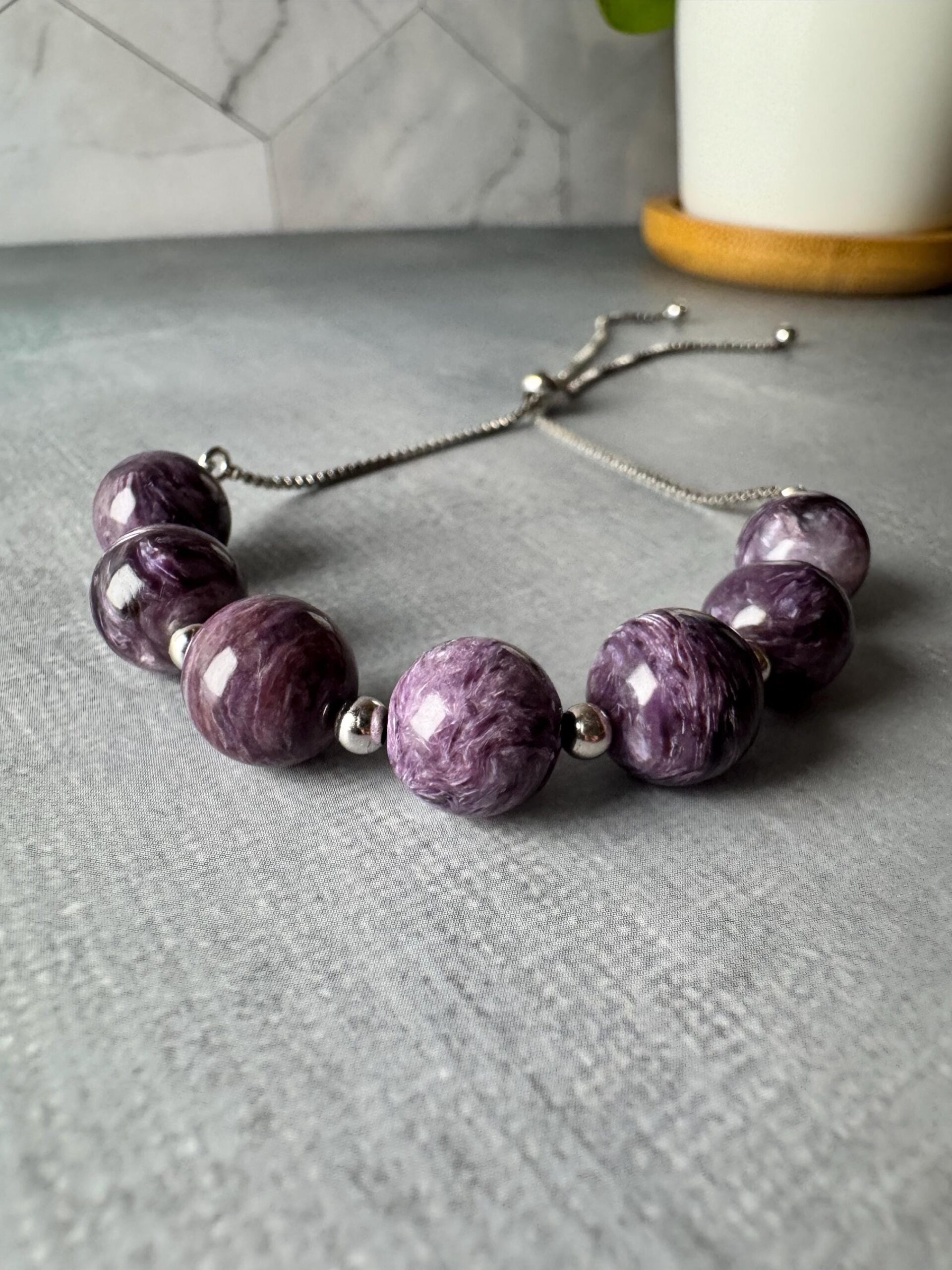 This elegant bracelet features genuine natural Charoite beads with rich lavender and purple hues, accented by solid sterling silver beads and a sleek adjustable sterling silver slider chain. Each stone is naturally formed and polished to reveal its beautiful swirling patterns and soft chatoyancy — no dyes, no synthetic material, no reconstituted stone.