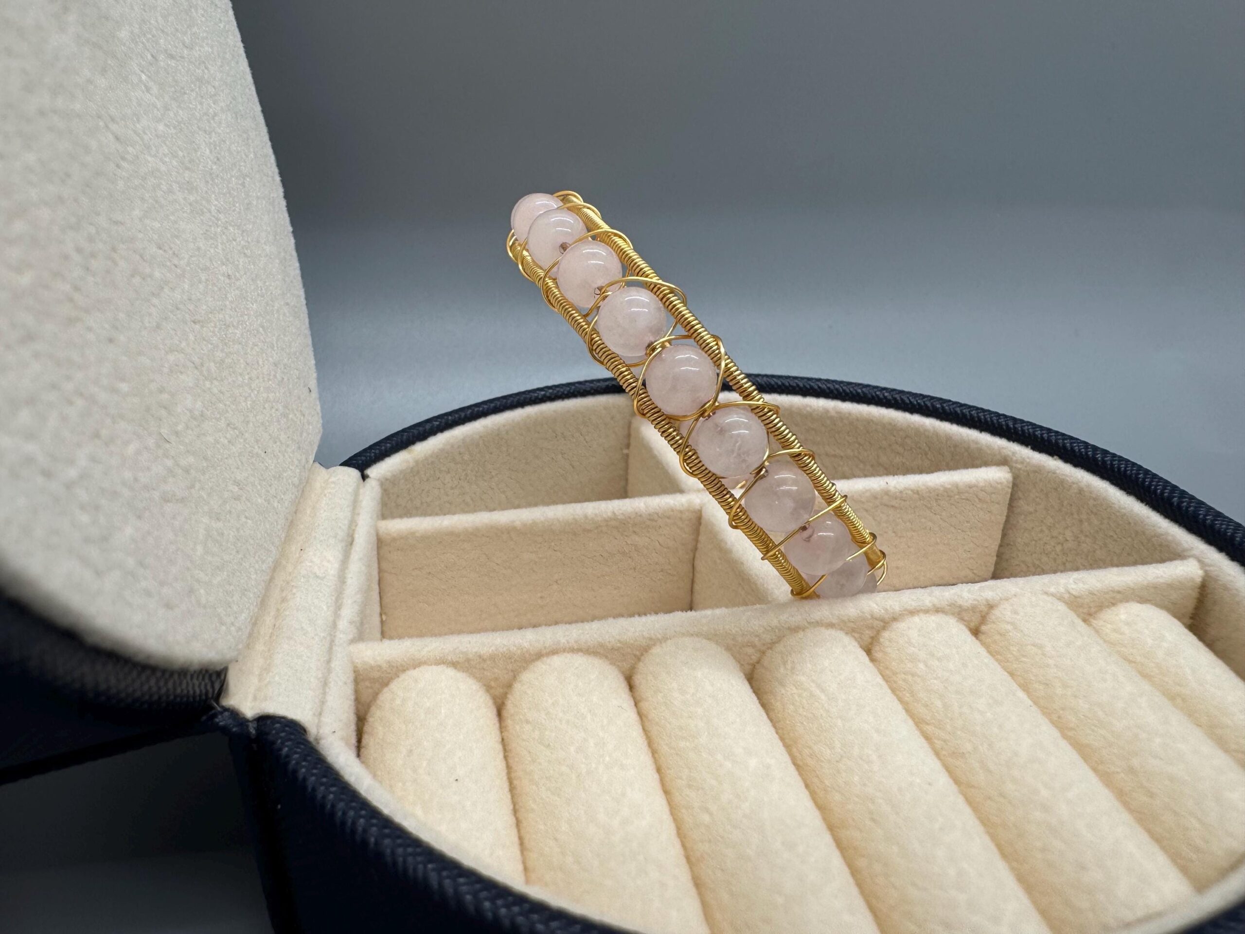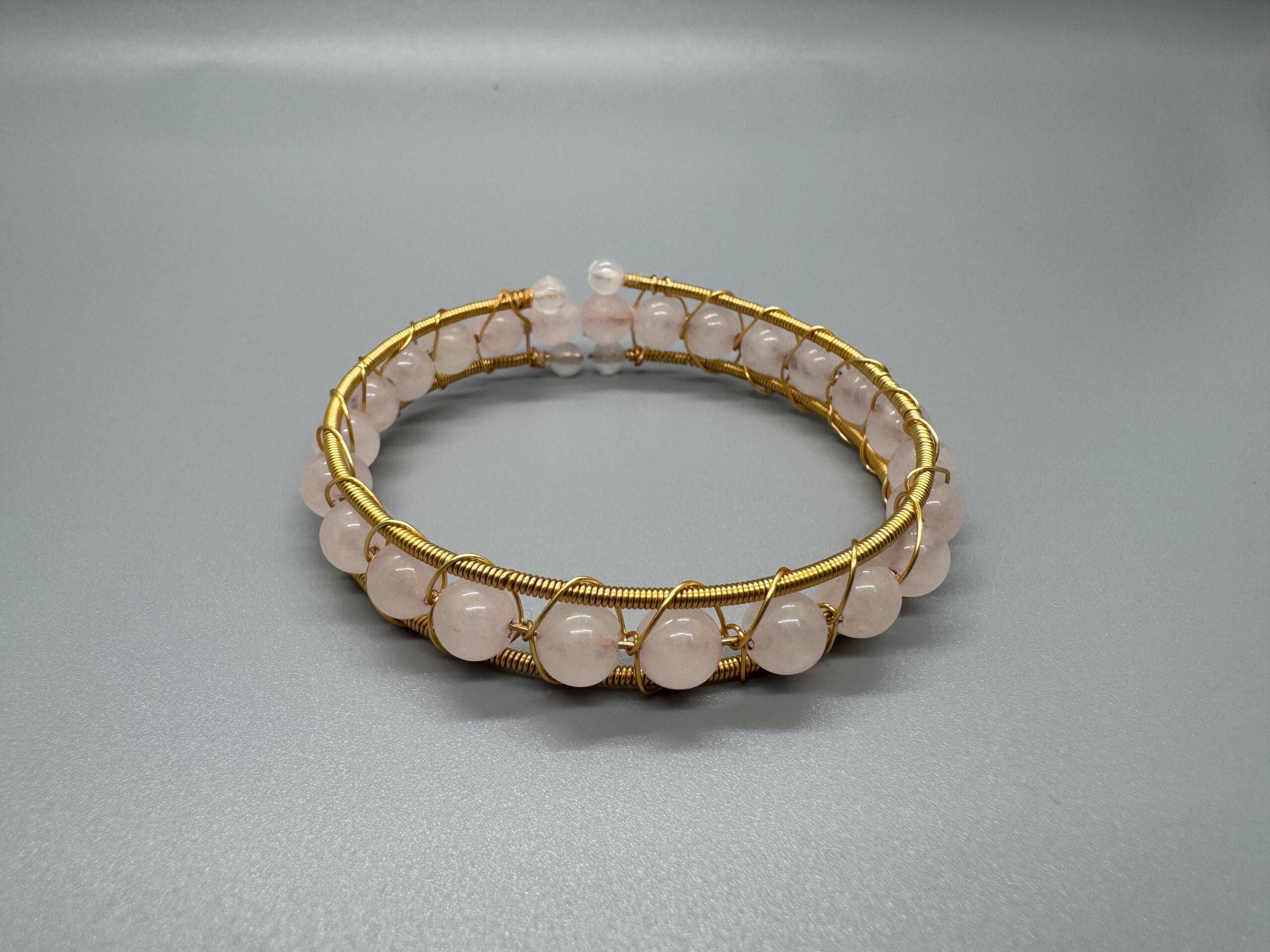 My best friend loves pink and she also loves wearing only gold jewelry. She believe that stones can be healing and can absorb bad energy. Rose Quartz is one that is known to do this and is also pink. Knowing this I decided to gather materials to make her something. I was inspired to make a wired wrapped bangle using gold wires and pink rose quartz. This is how one of my plans came out. I will continue to try different designs, but in the meantime this one can be yours.
