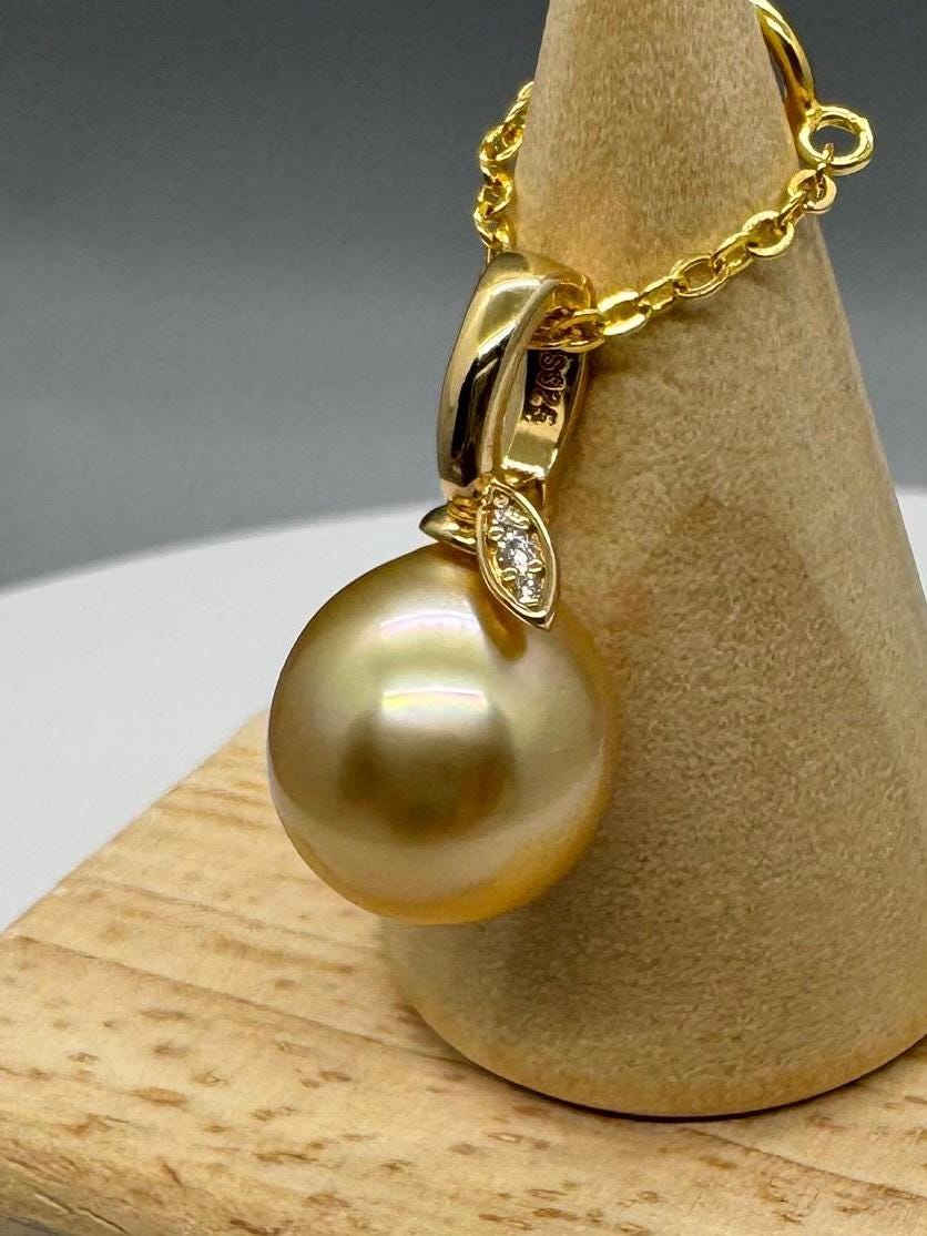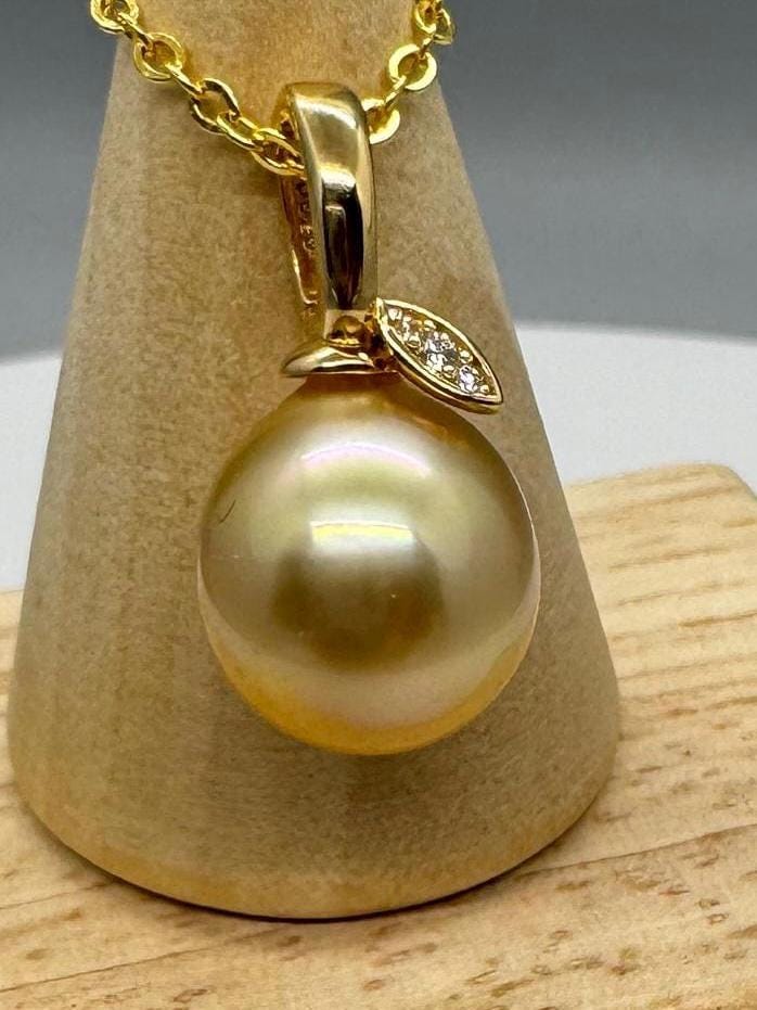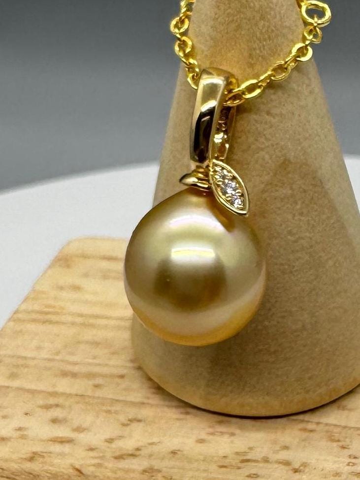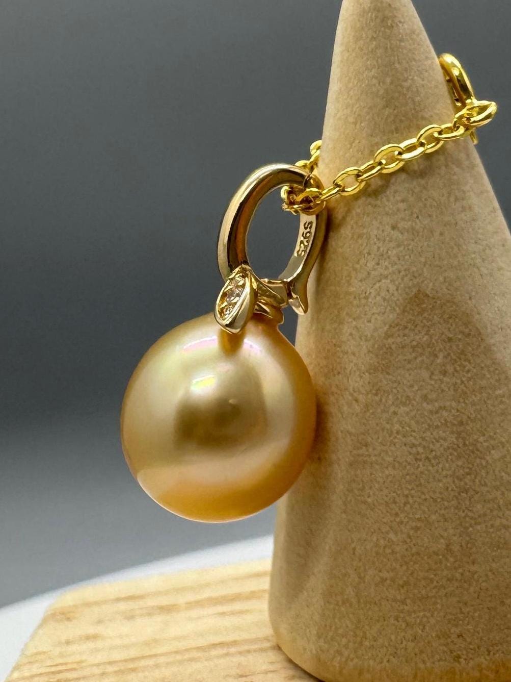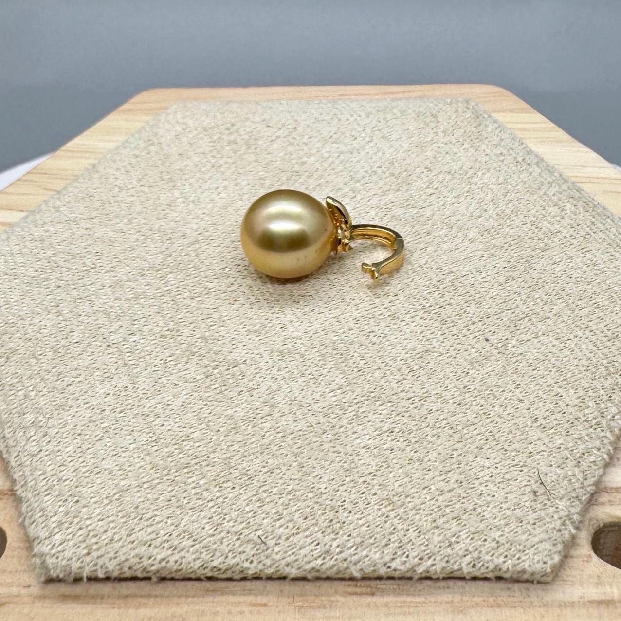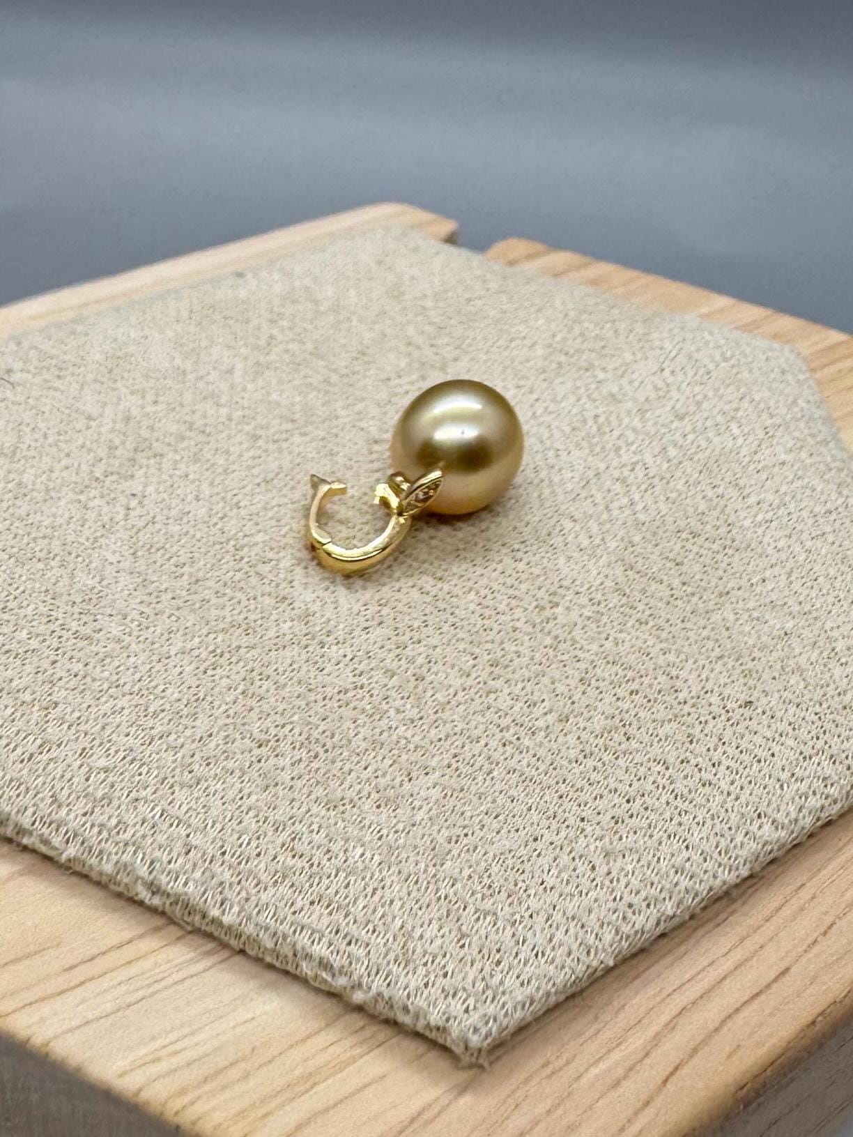Tear drop south sea golden pearl as a Fruit pendant. The pendant is made of 18k plated s925 sterling silver. The pendant has a universal clasp that can open up and be used with full string pearl necklaces