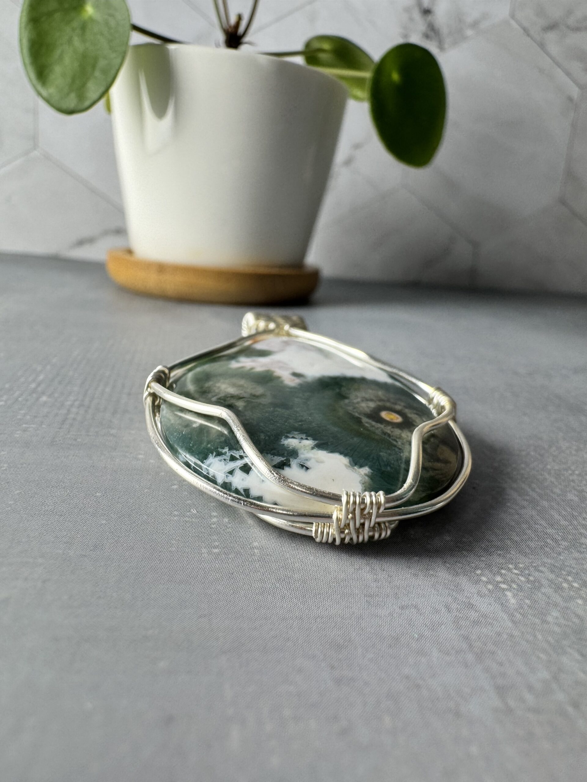 This pendant showcases a polished Ocean Jasper cabochon, hand wrapped in silver plated wire. The wrap design follows the curves of the stone, creating an organic yet refined style.