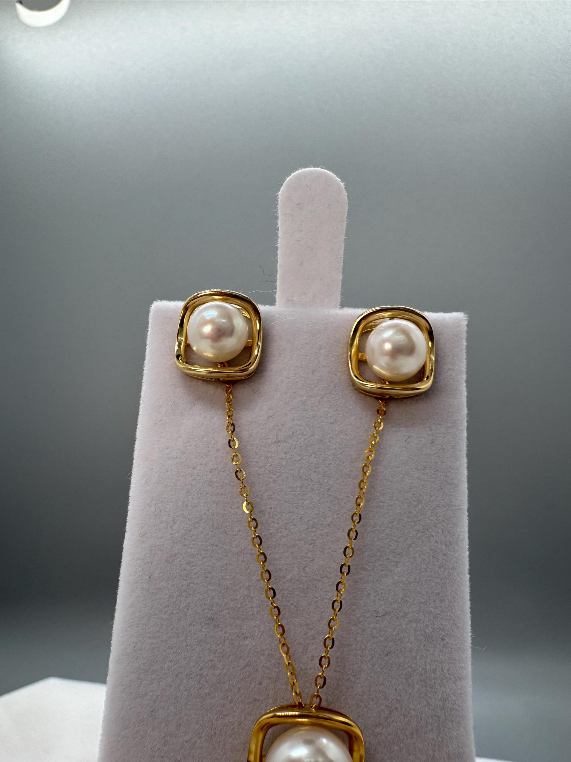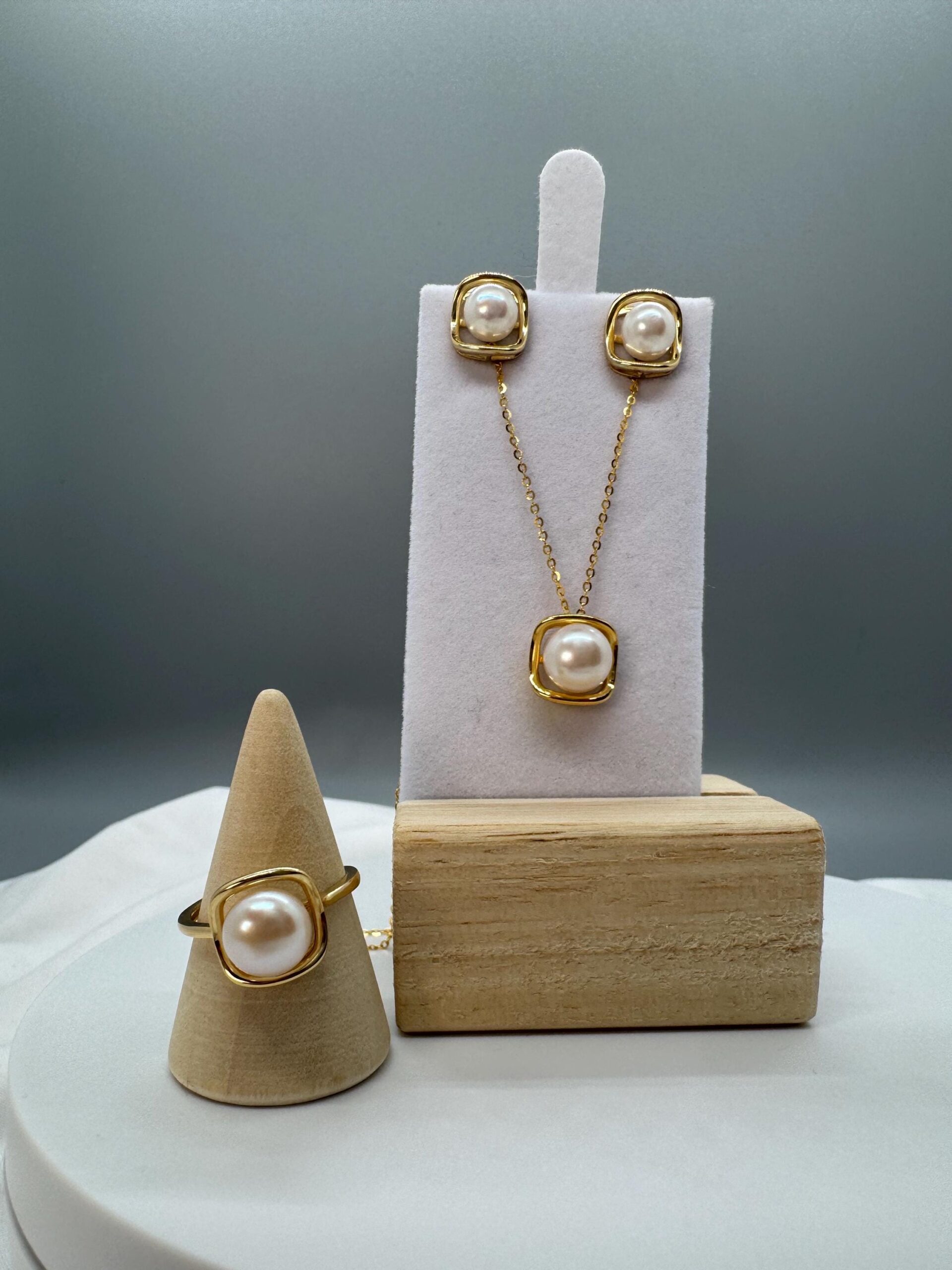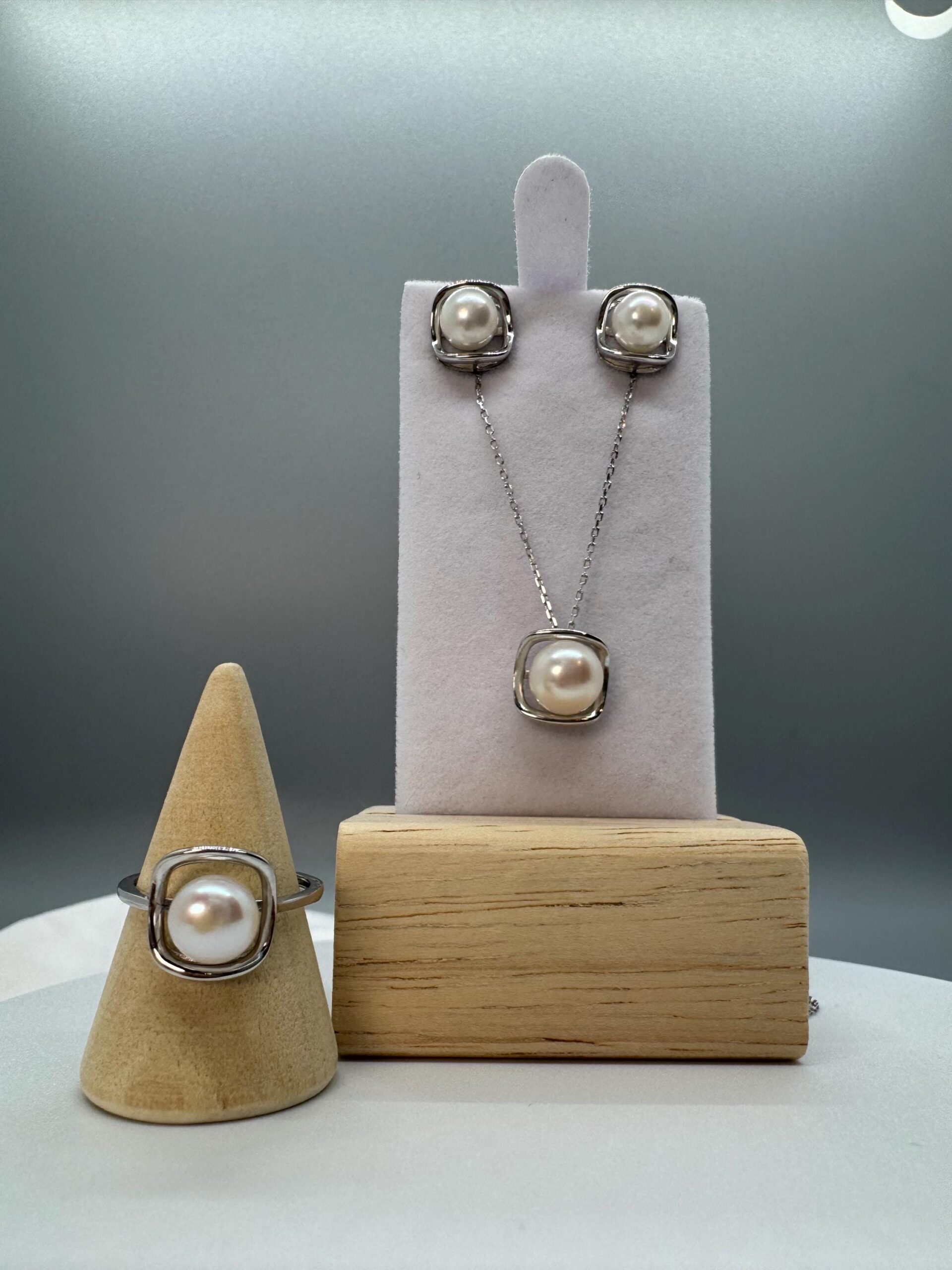 Set includes Pendant with chain, one pair of earrings and an adjustable ring