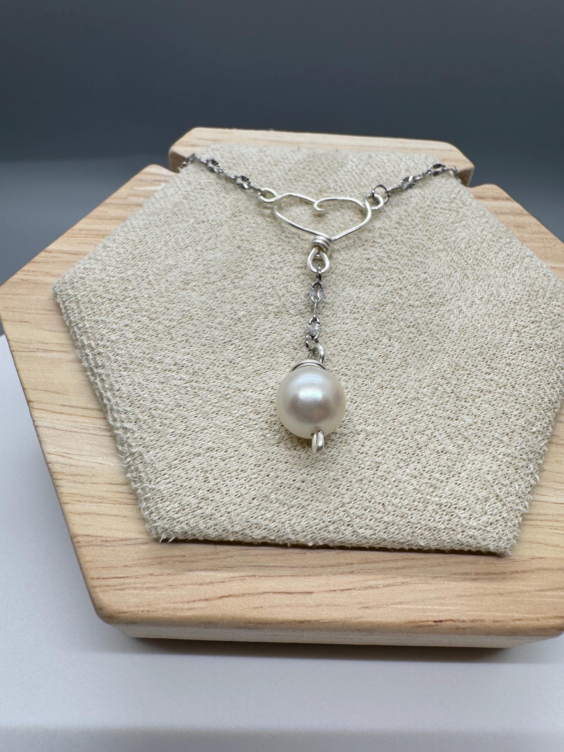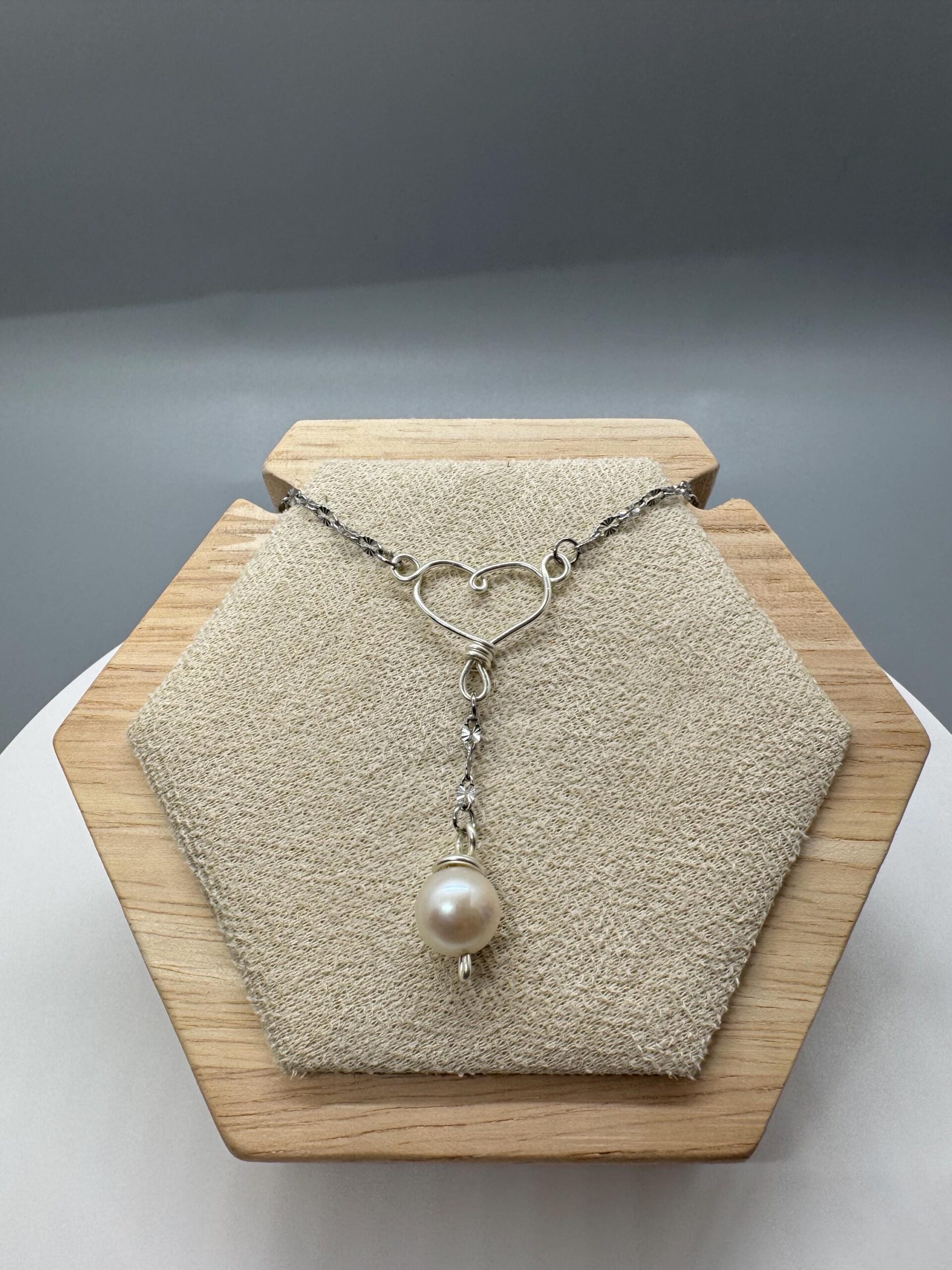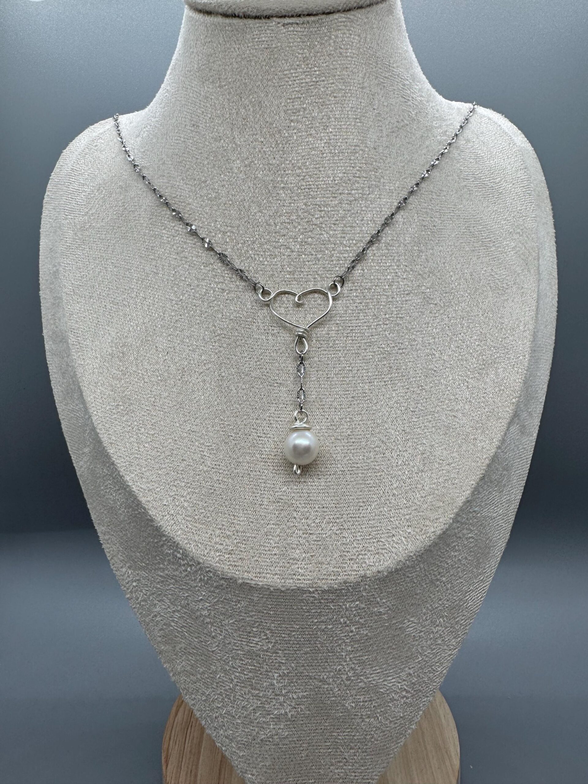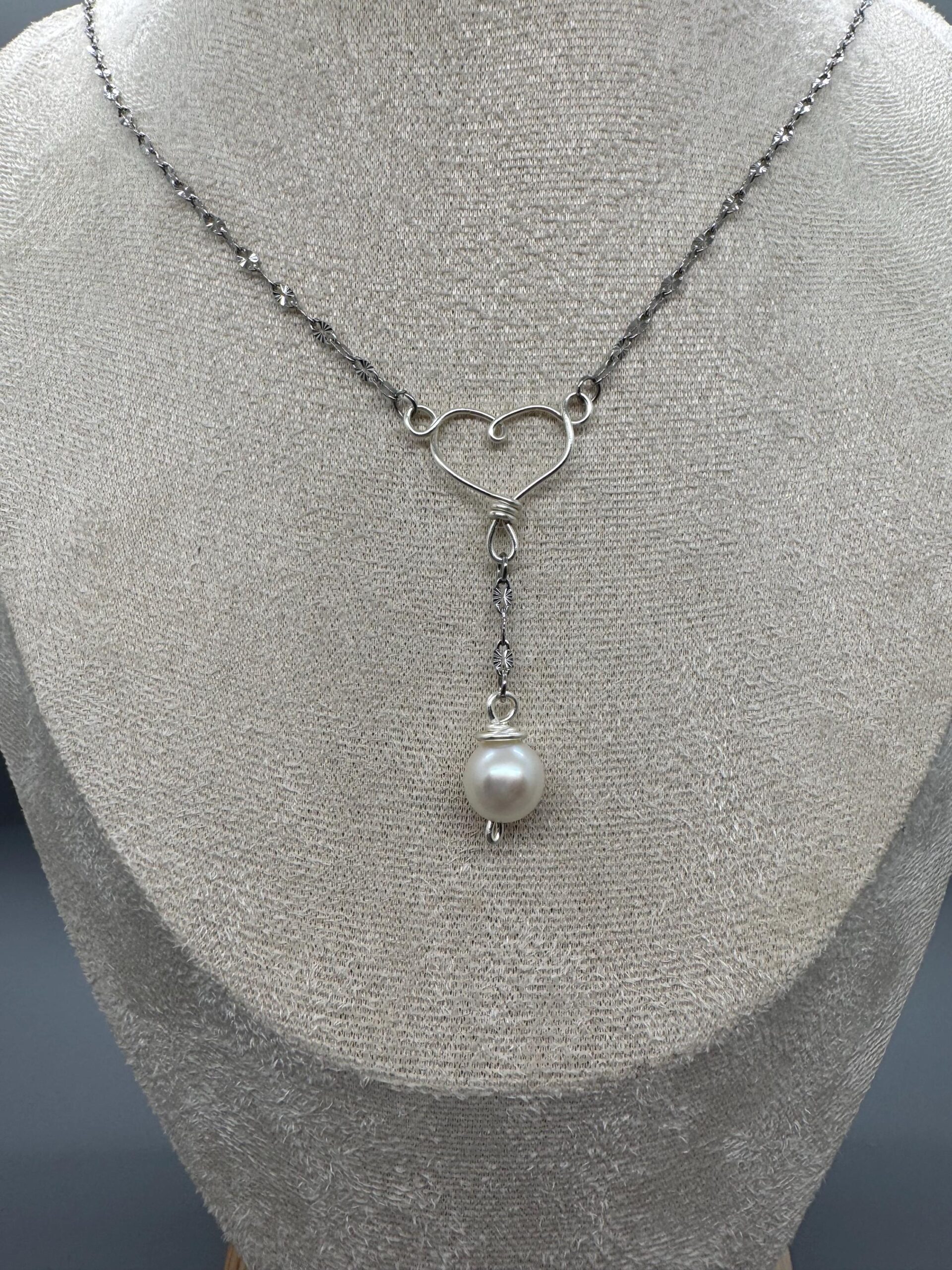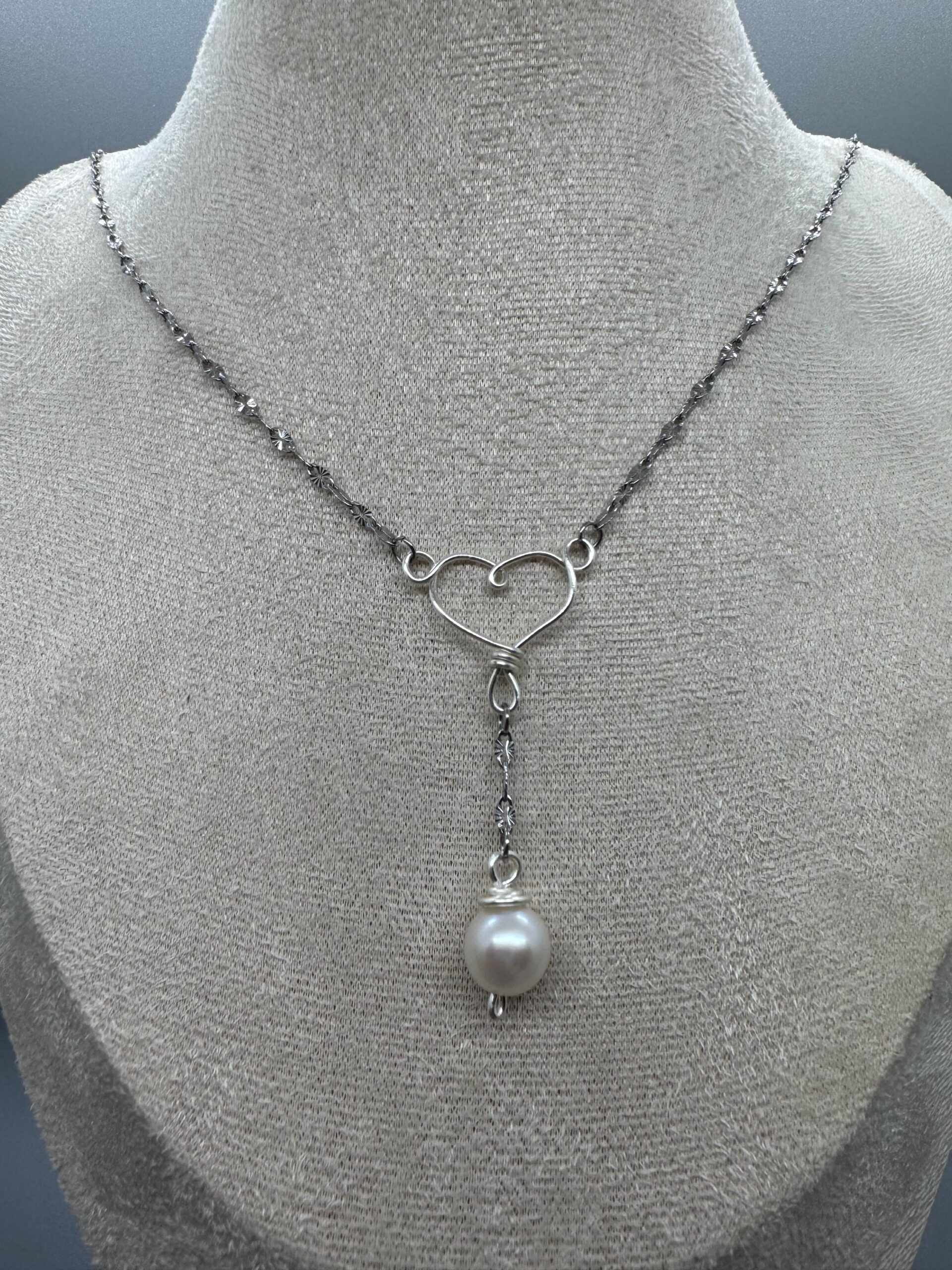 This necklace is made of stainless steel with a copper wire heart that is plated to be silver. There’s a fresh water pearl that dangles from the bottom center of the heart. The necklace is 18” around with a 5cm extension.