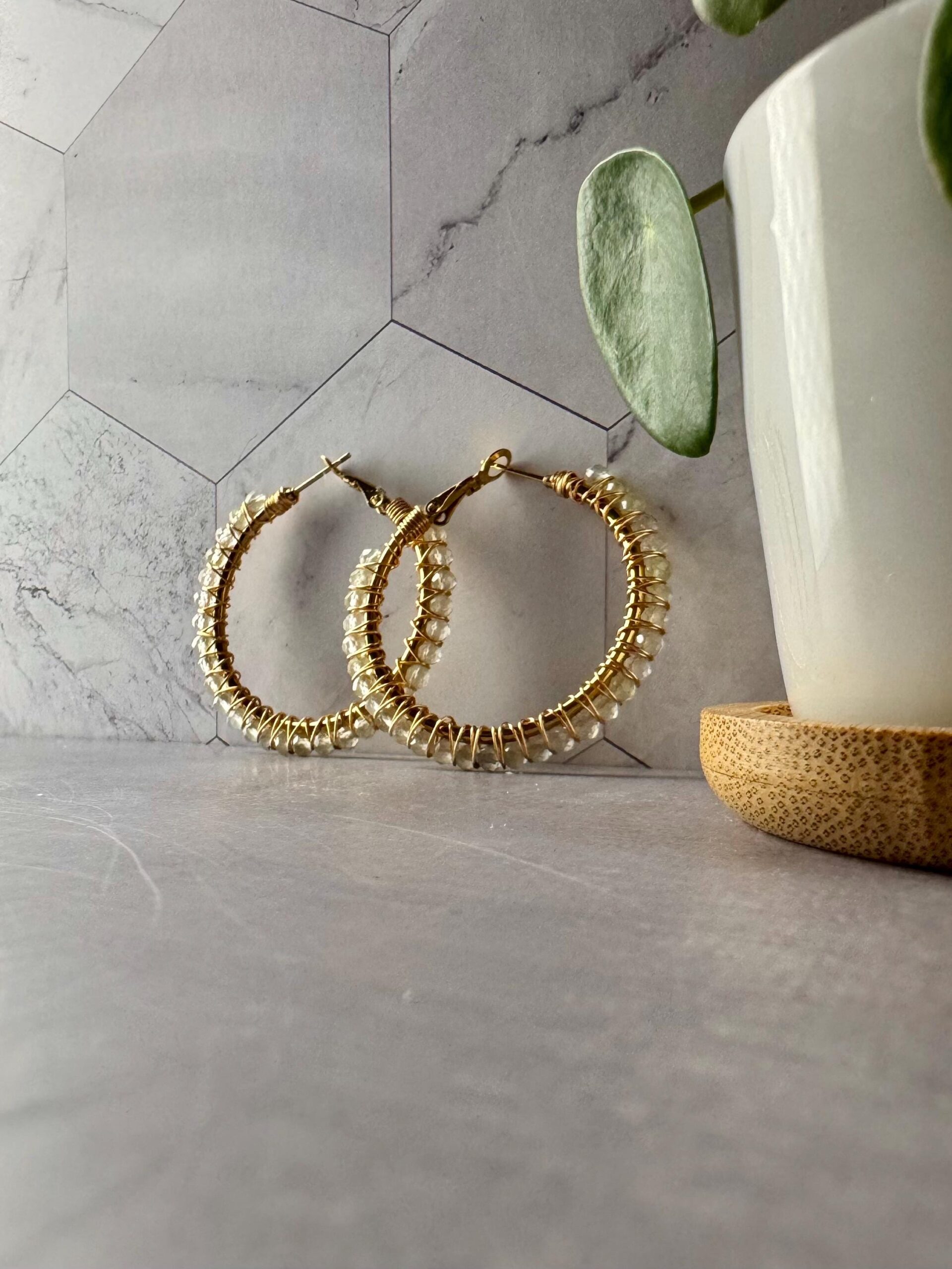 Each hoop is carefully wrapped by hand with faceted prehnite crystals using gold-plated copper wire. The faceting catches the light beautifully, adding dimension and shimmer without going over the top.