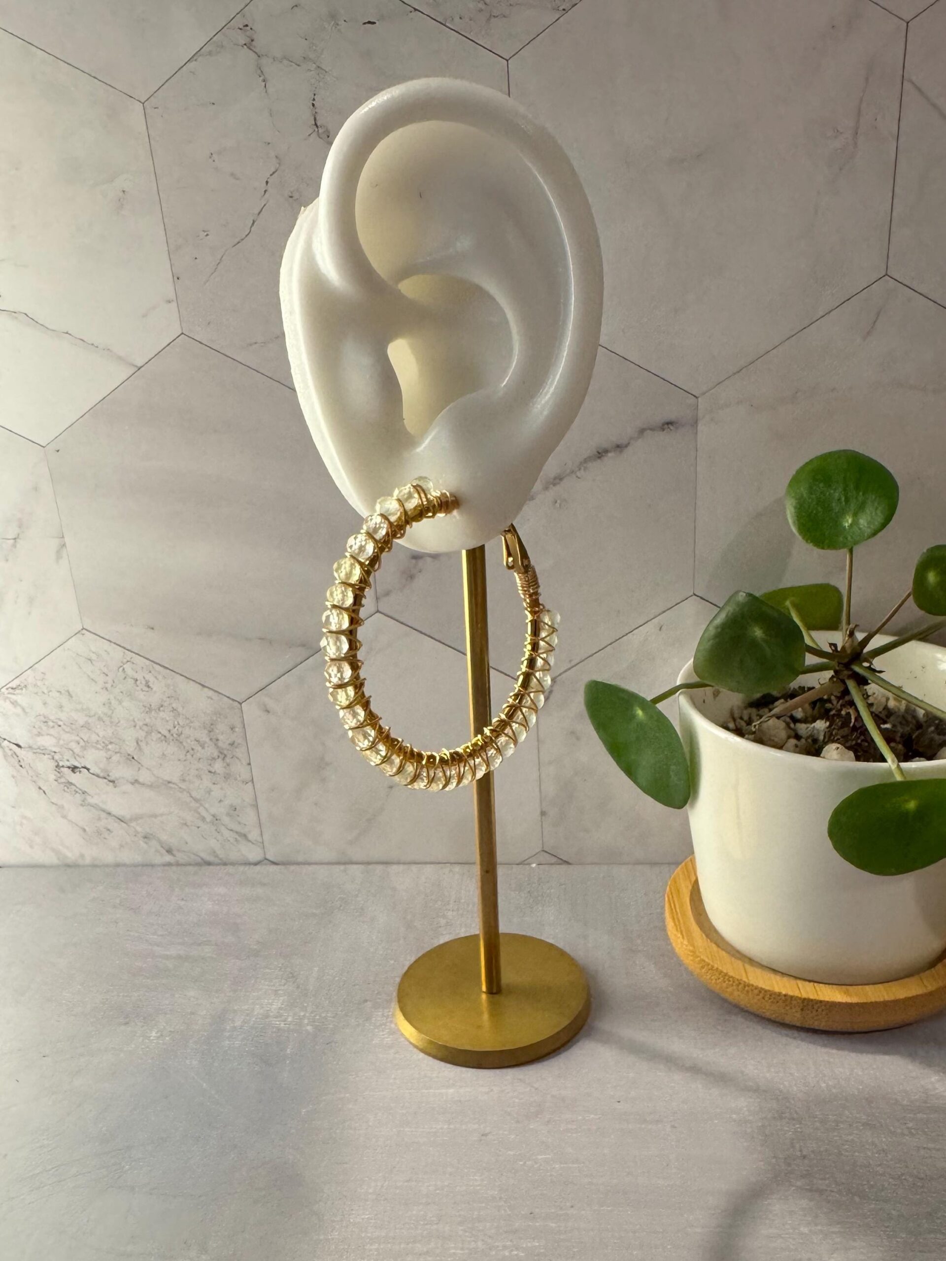The hoop base is crafted from durable stainless steel with a long-lasting PVD 18K gold finish, offering both shine and resistance to fading. Lightweight yet striking, this pair adds a crisp finish to any look—from dressy to daily wear.