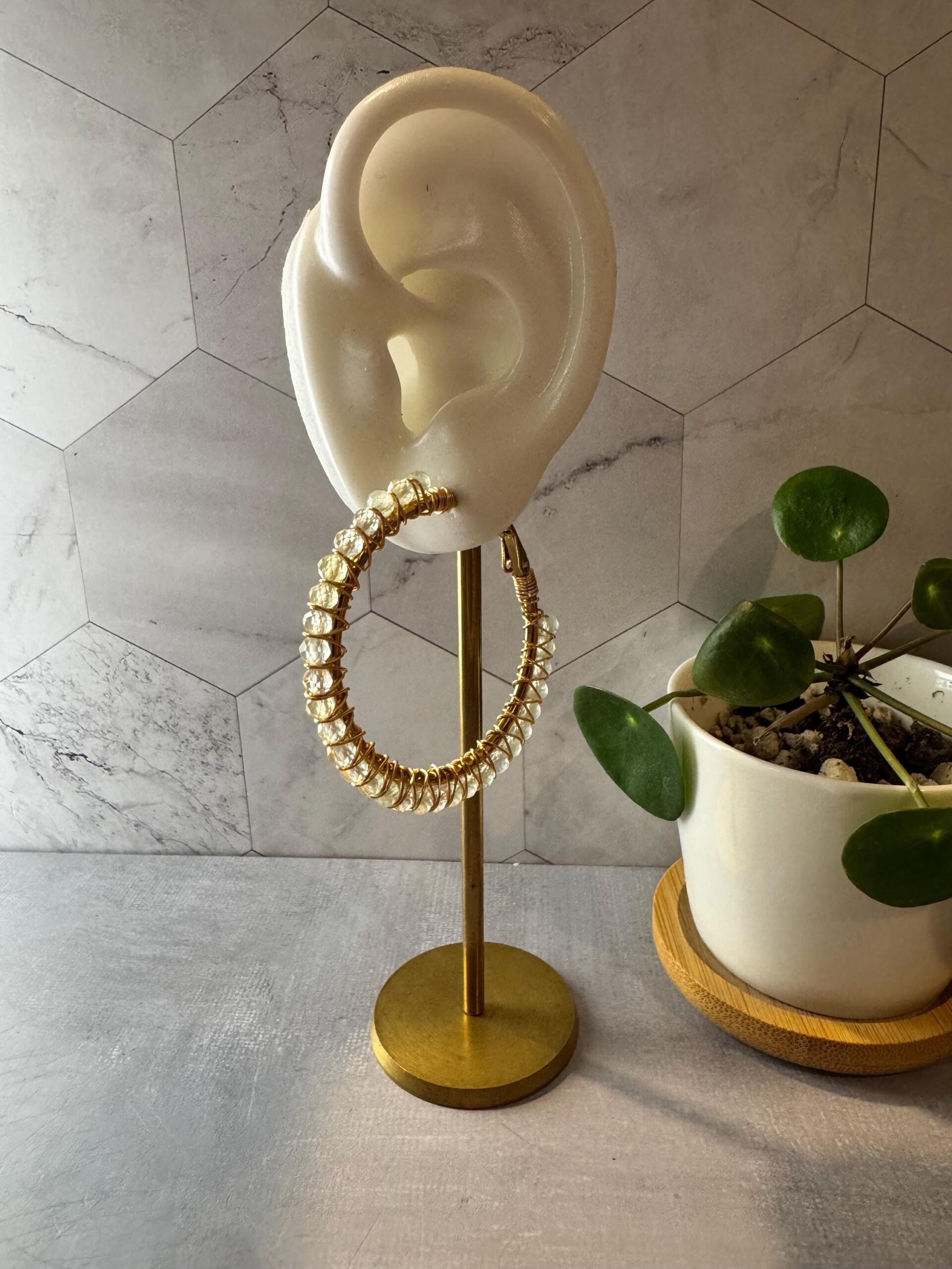 A bold, luminous pair of crystal hoop earrings featuring translucent prehnite gemstones wire-wrapped onto stainless steel hoops with 18K PVD gold plating. These earrings bring together structure and lightness—grounded in gold and finished with airy, pale green gems.