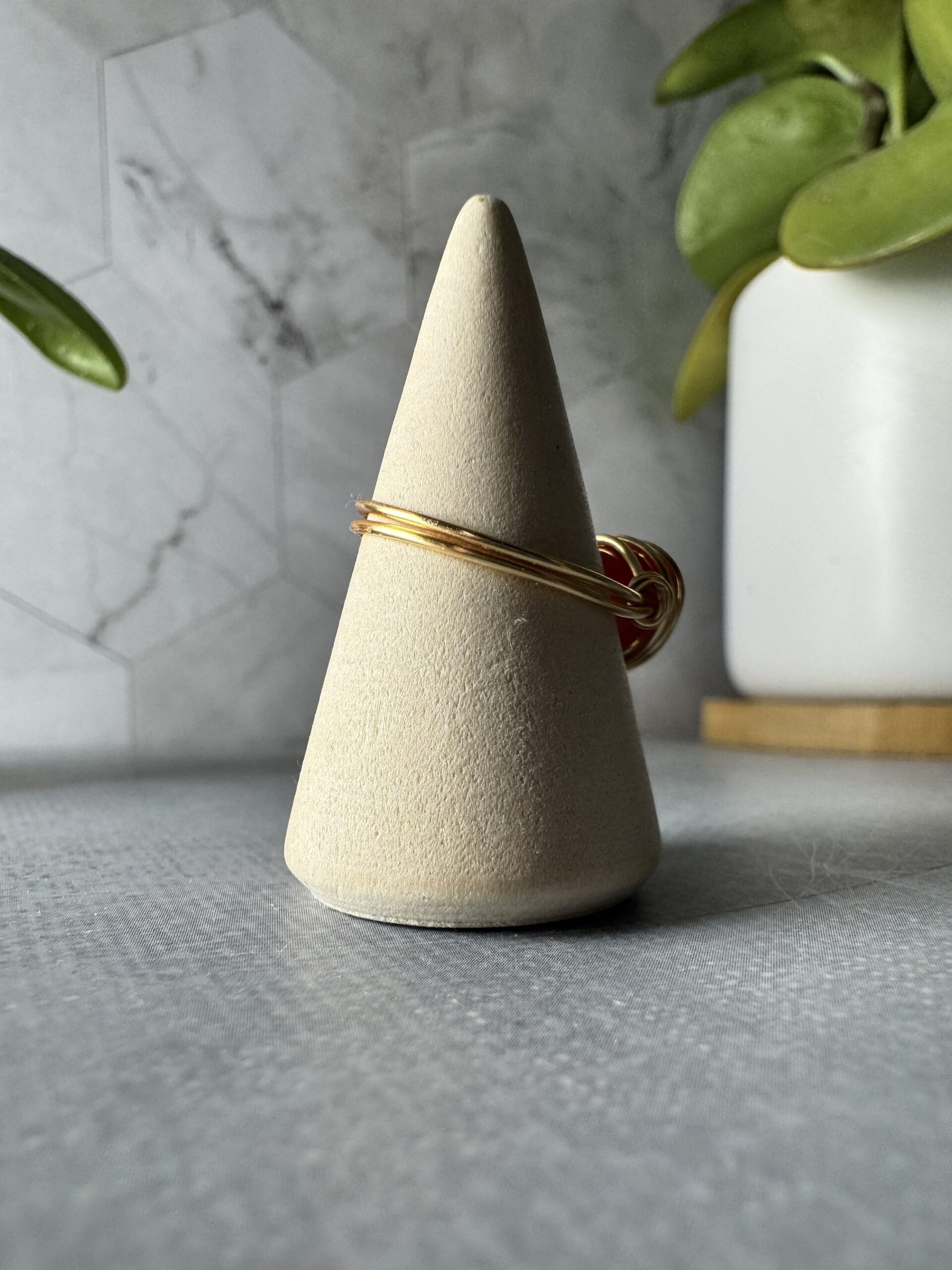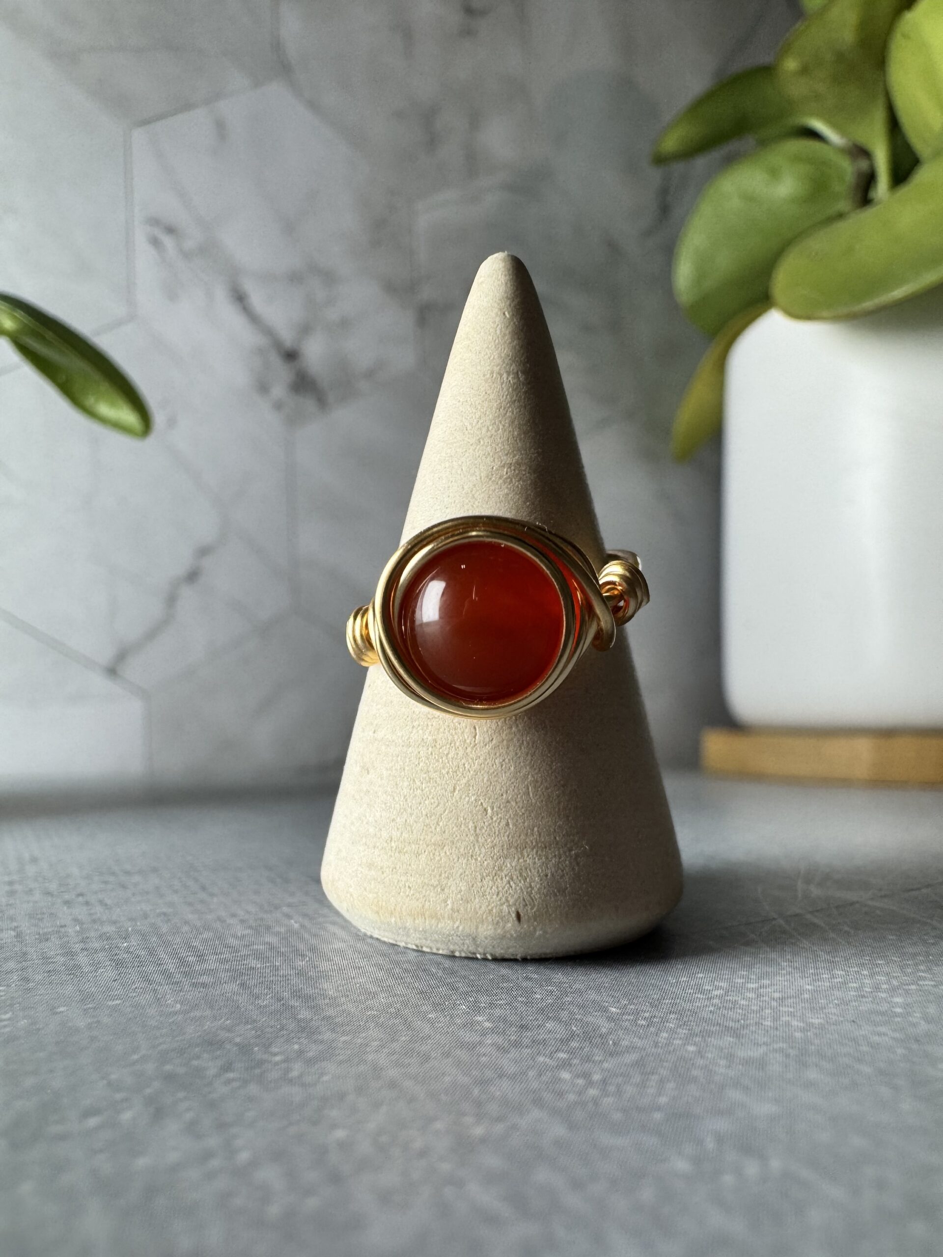 A warm, glowing red agate solitaire wrapped in rich gold tones — this ring is simple, elegant, and full of personality.