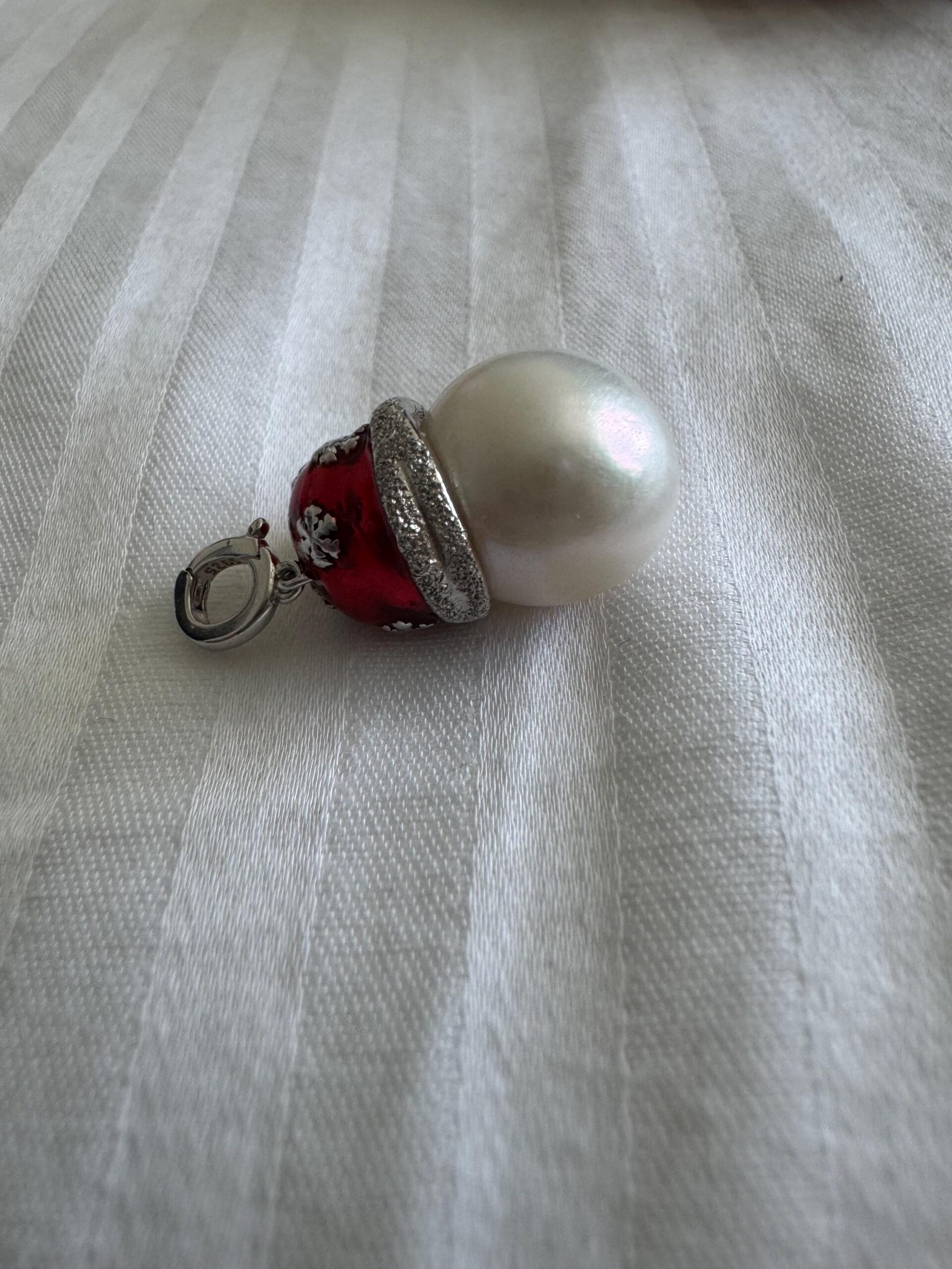 The pendant is made of s925 sterling silver. It’s height is about 2cm. The white fresh water pearl is 12.5 mm in diameter. This pearl is actually a tear drop pearl where the top of the cone is hidden within the hat. The exposed portion of the pearl is perfectly round with a frosted sheen.