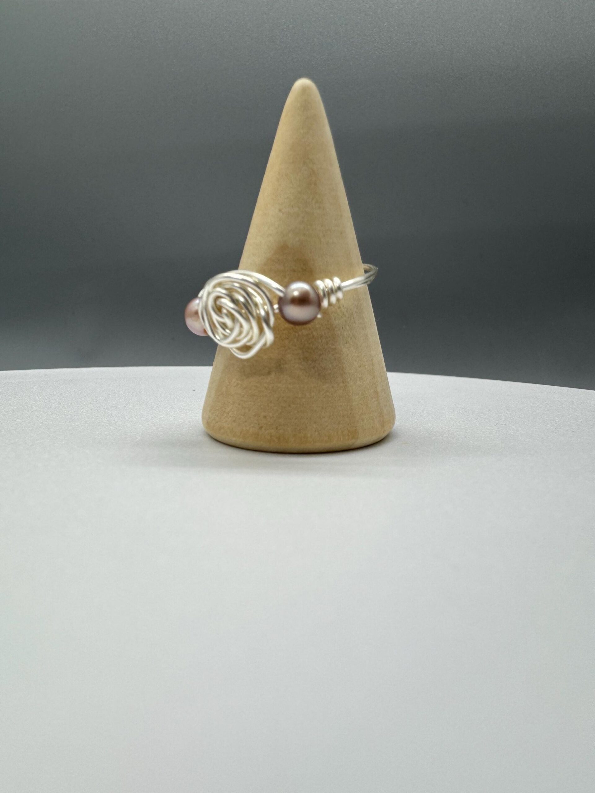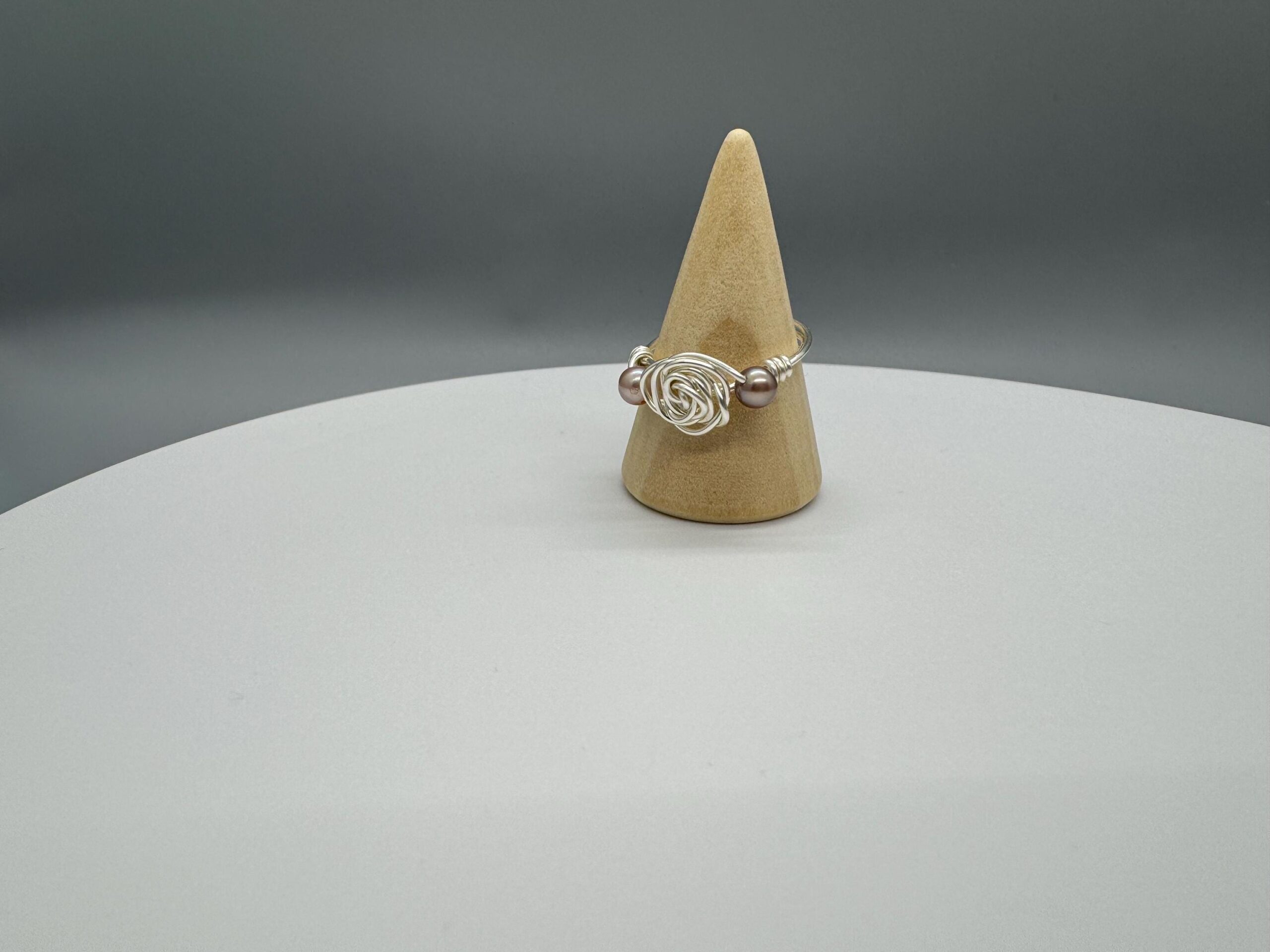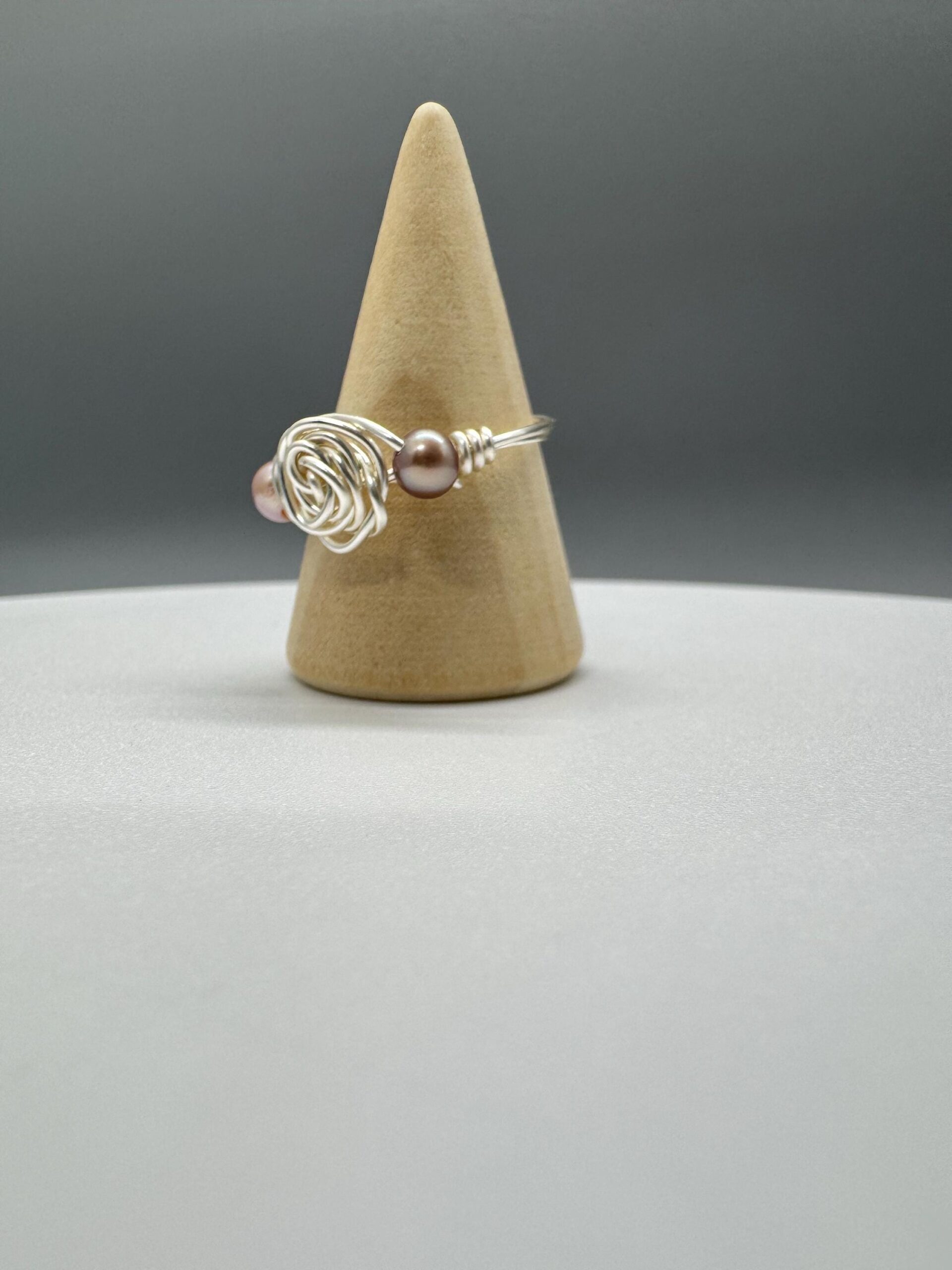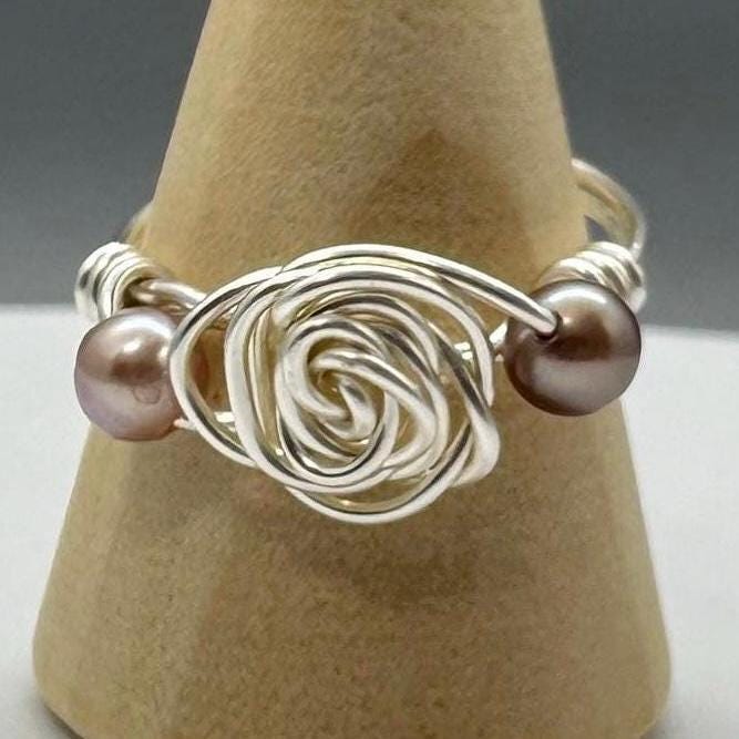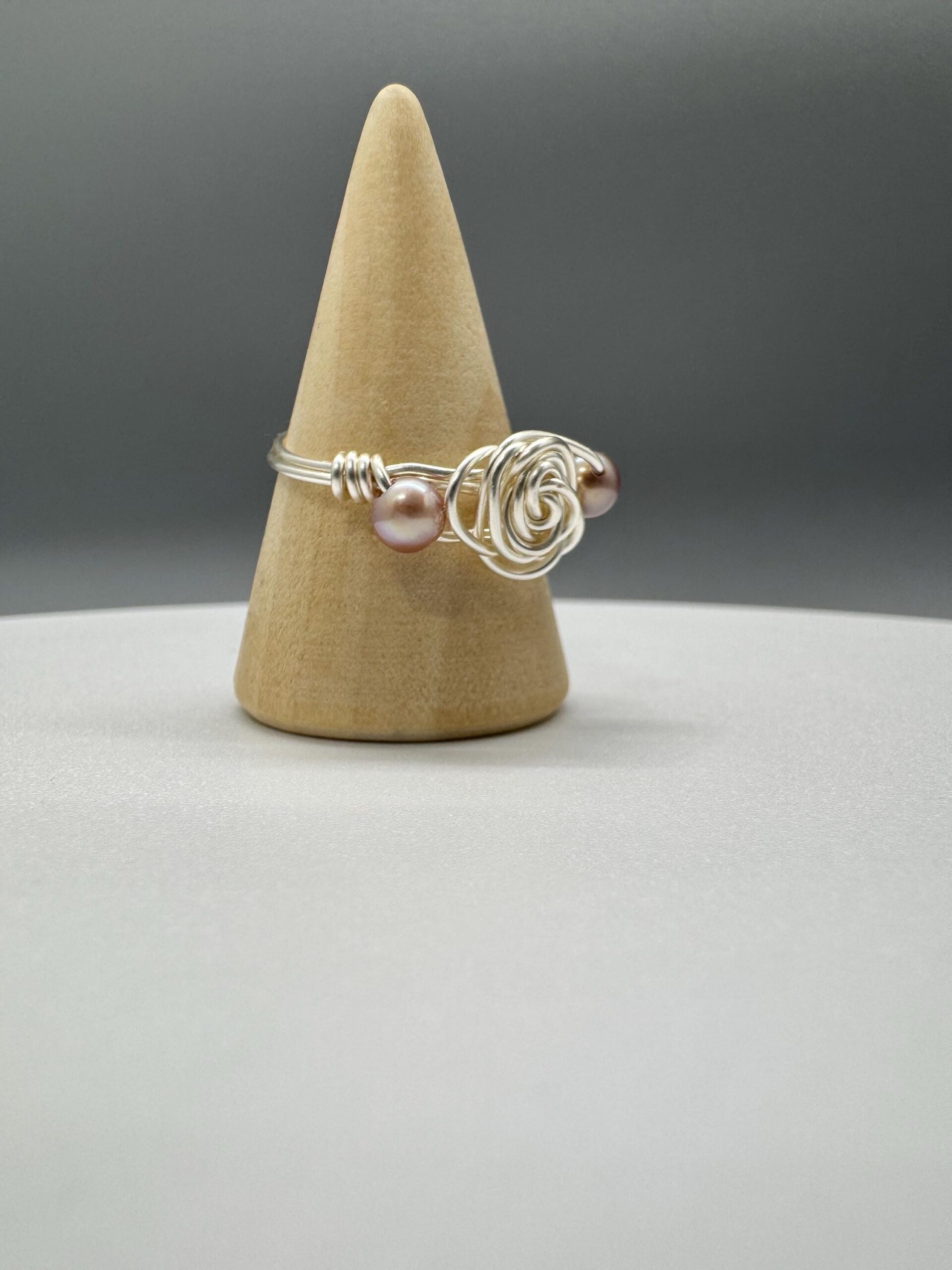 Silver Wire Wrap Ring with rose and two purple pearls. The ring will be remade to your size once ordered.