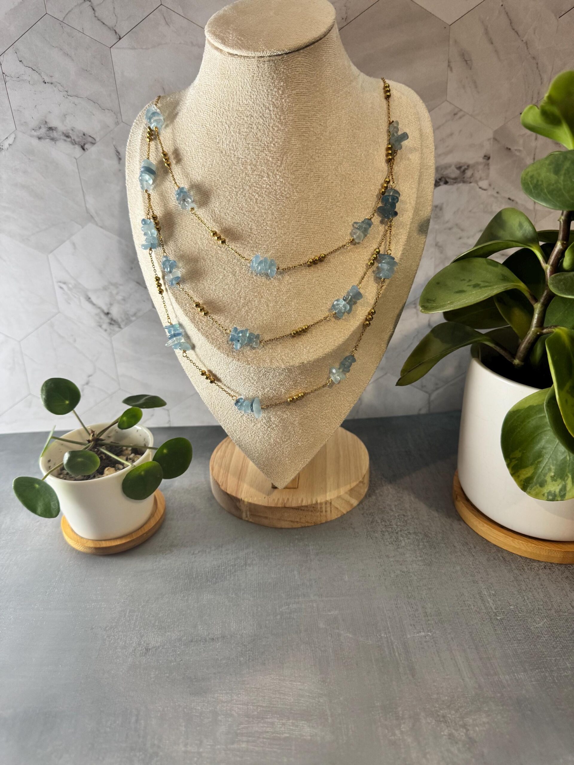 This three-layer aquamarine chip bead necklace features soft ocean-blue stones paired with a warm gold finish, making it the perfect summer statement piece.