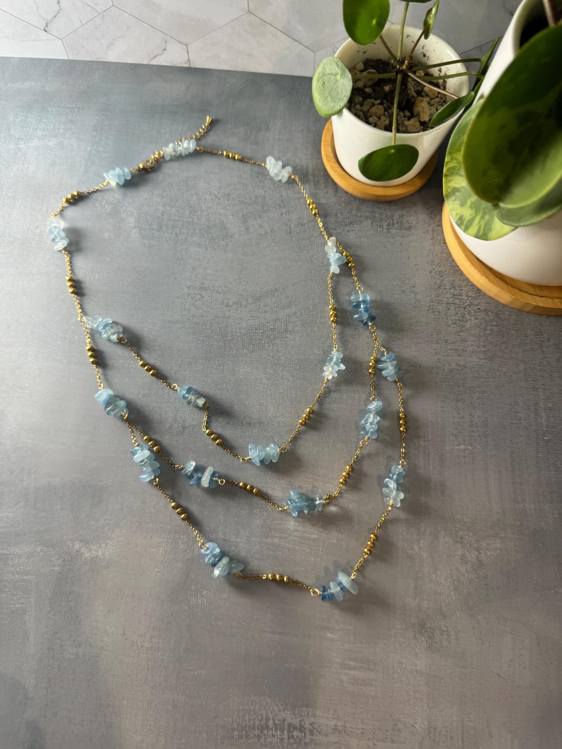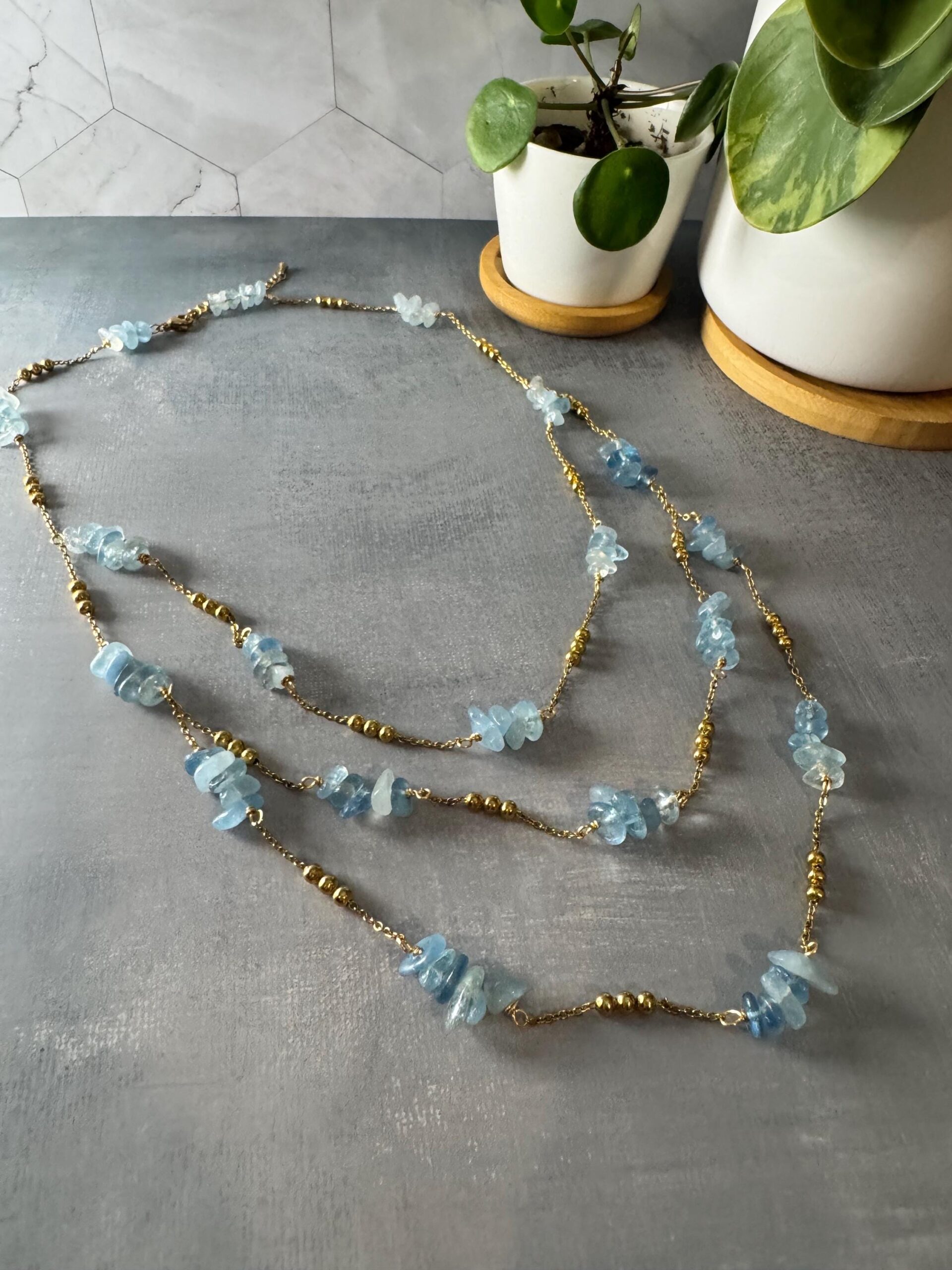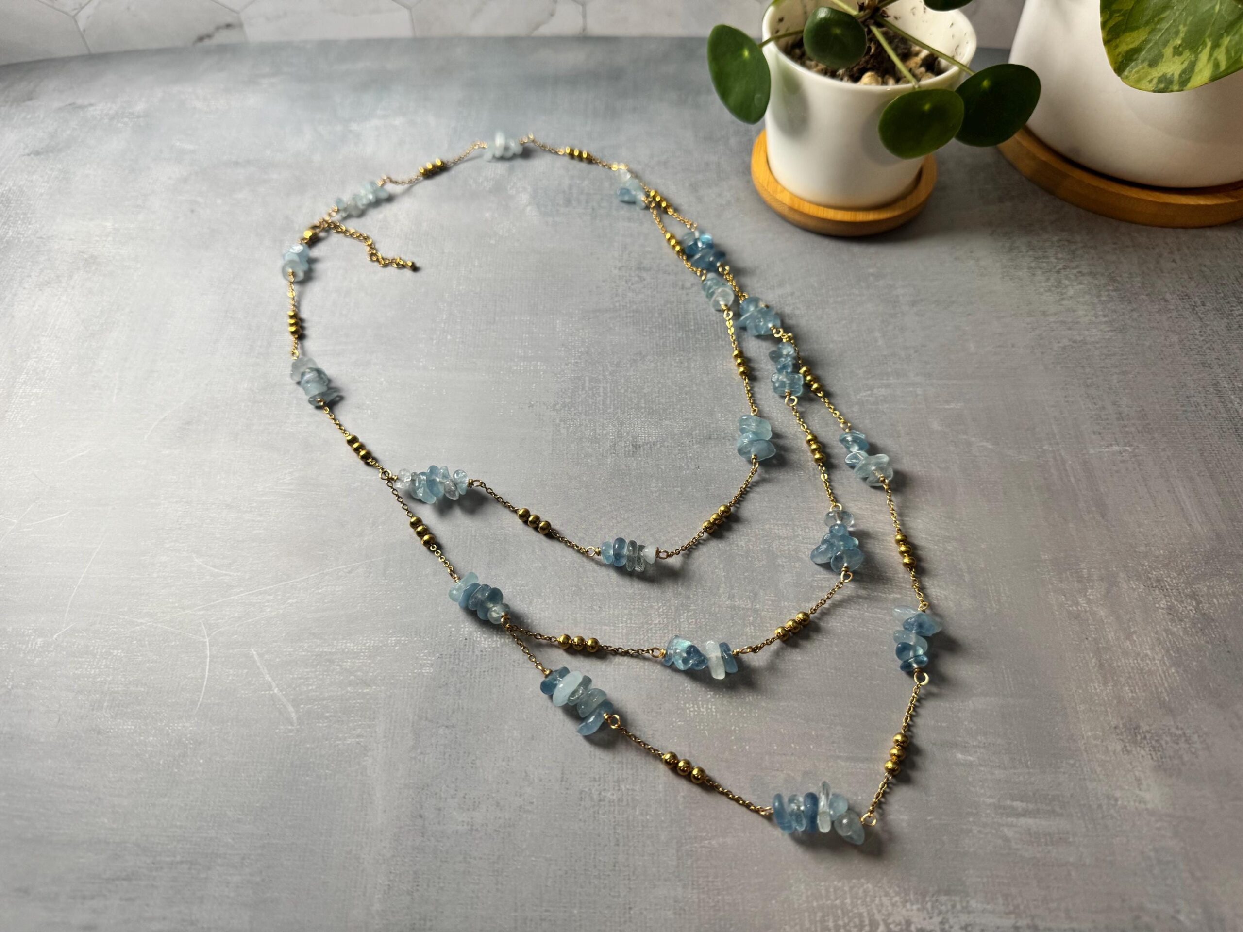Each layer is composed of genuine aquamarine chip beads and gold-toned accent beads, strung along a durable 18k PVD-plated stainless steel chain. The layers are fixed into a single necklace and not meant to be worn separately.