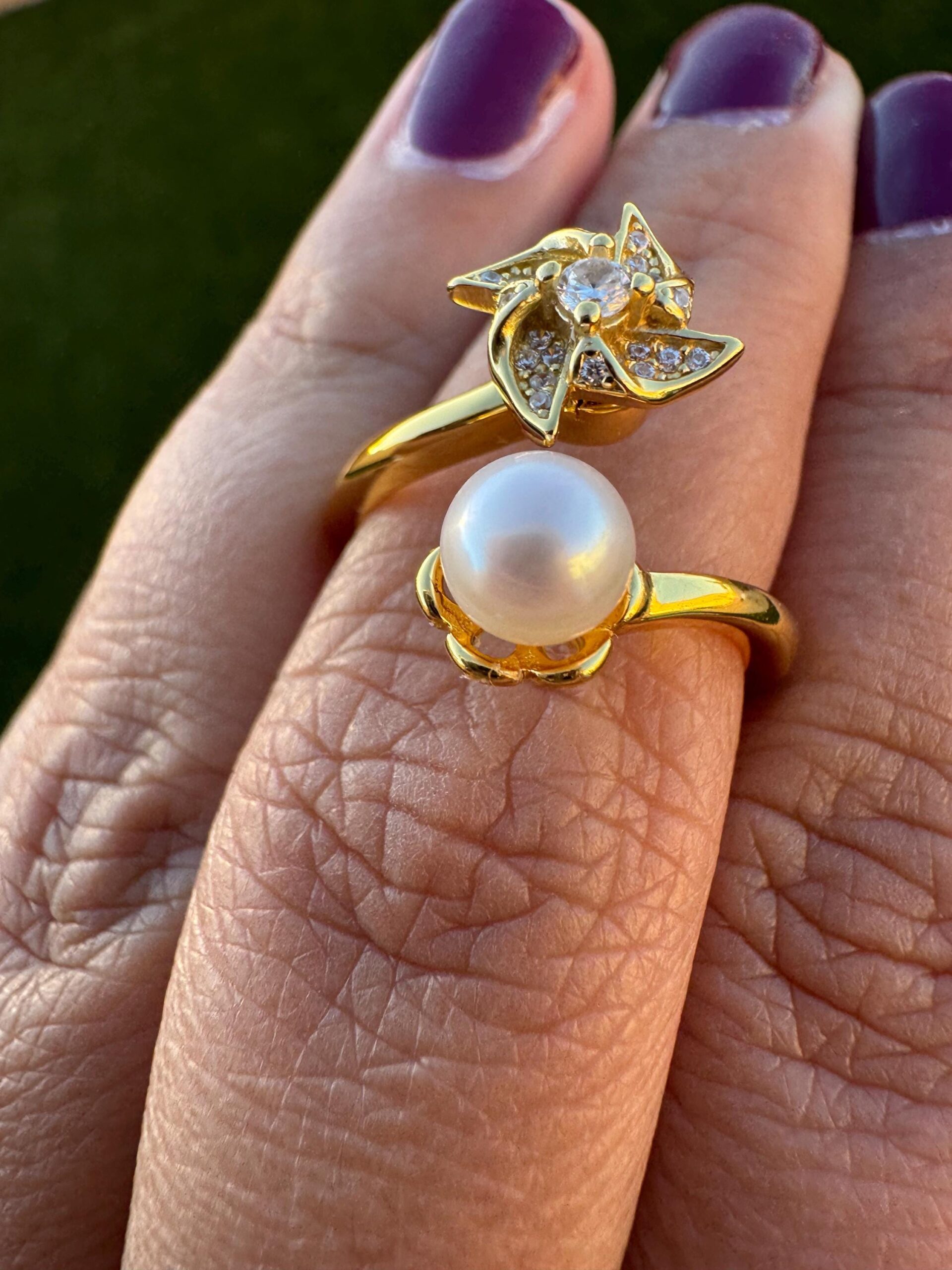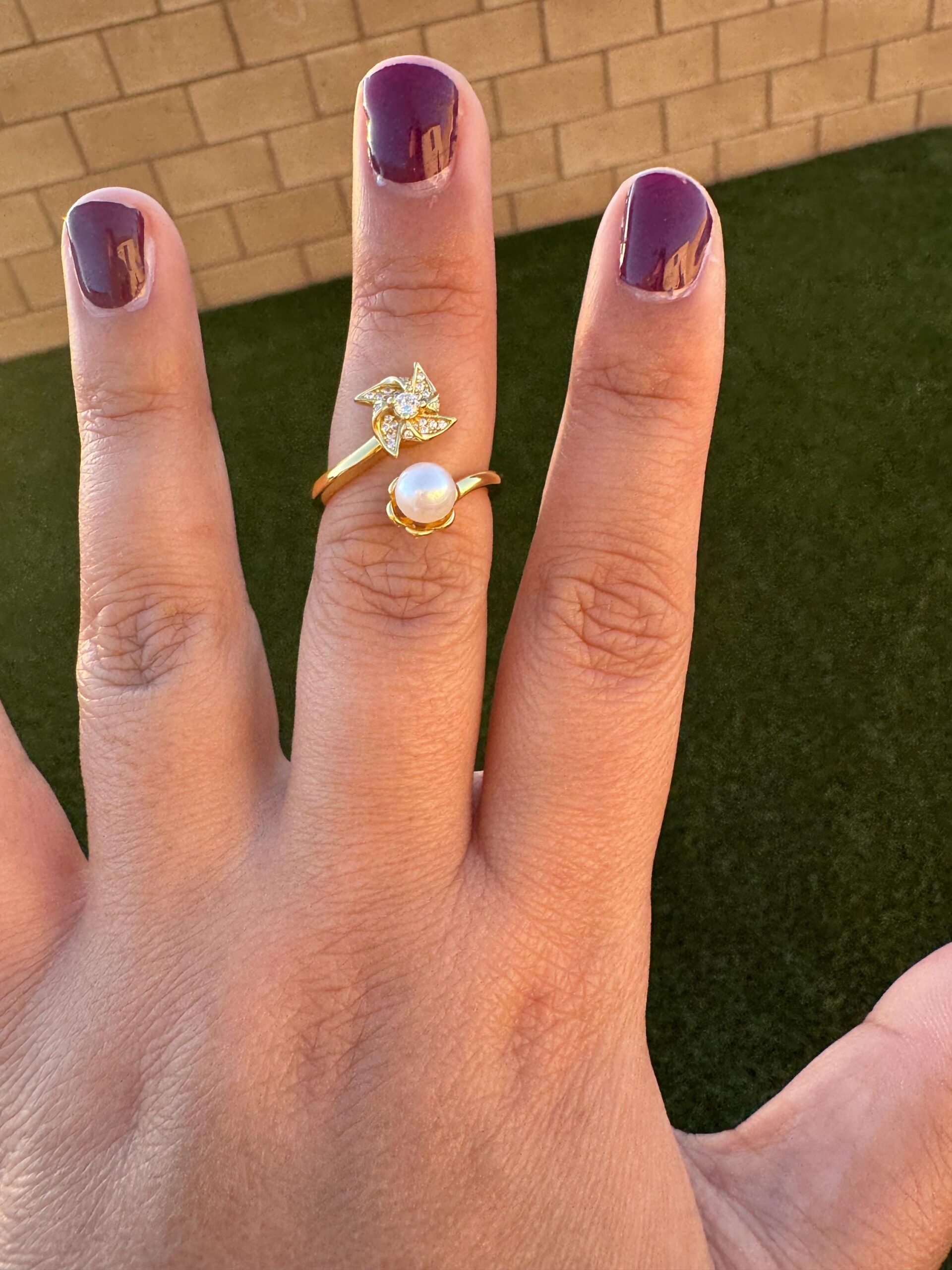 The ring itself is made of 18k plated s925 sterling silver. The windmill has cubic zirconia in it. The primary gem is the salt water akoya pearl