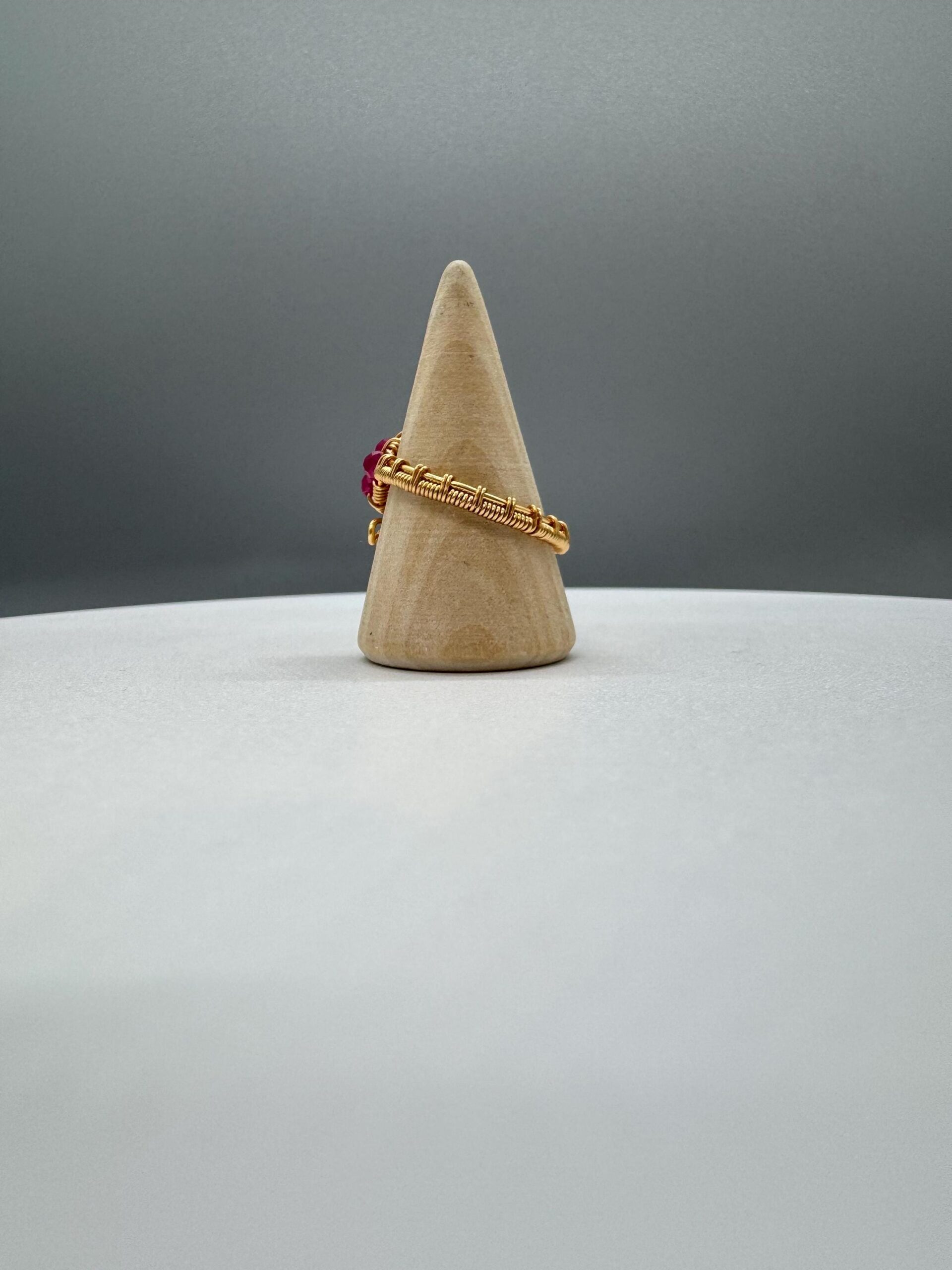 This ring is made of 18k gold plated copper wires and lab created rubies.